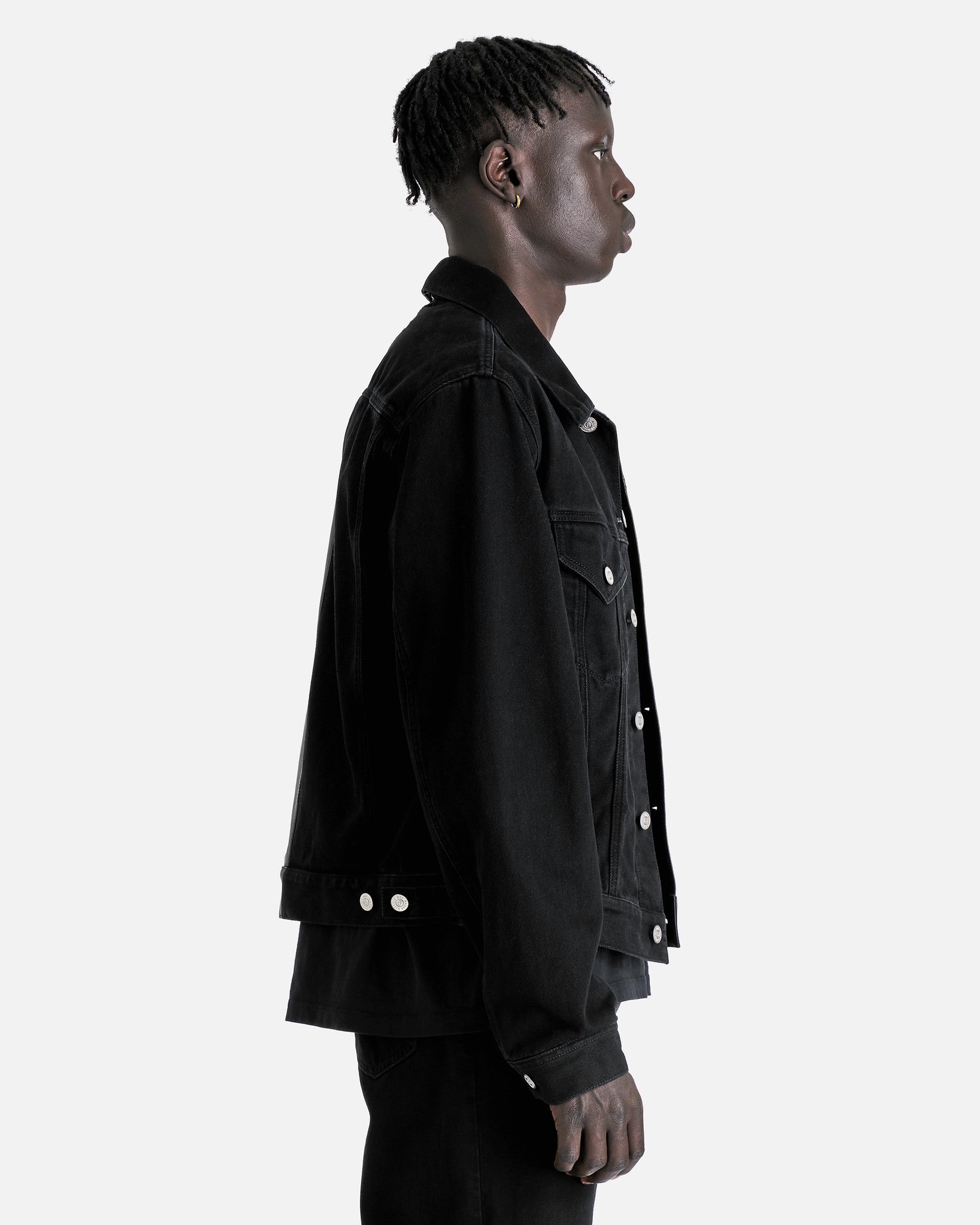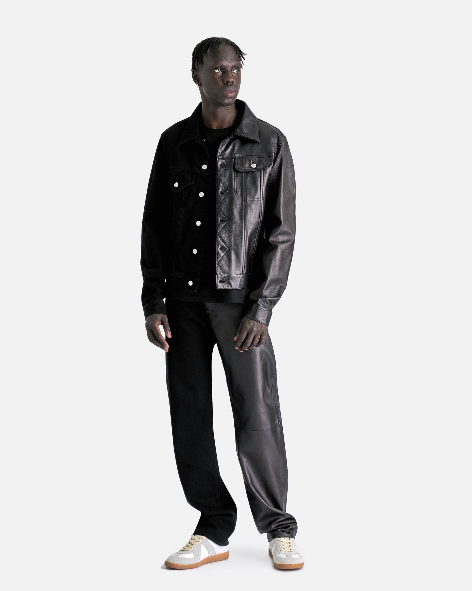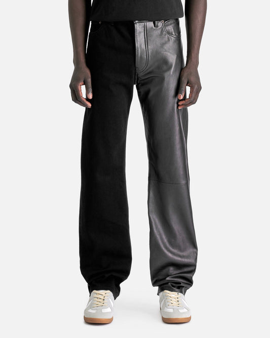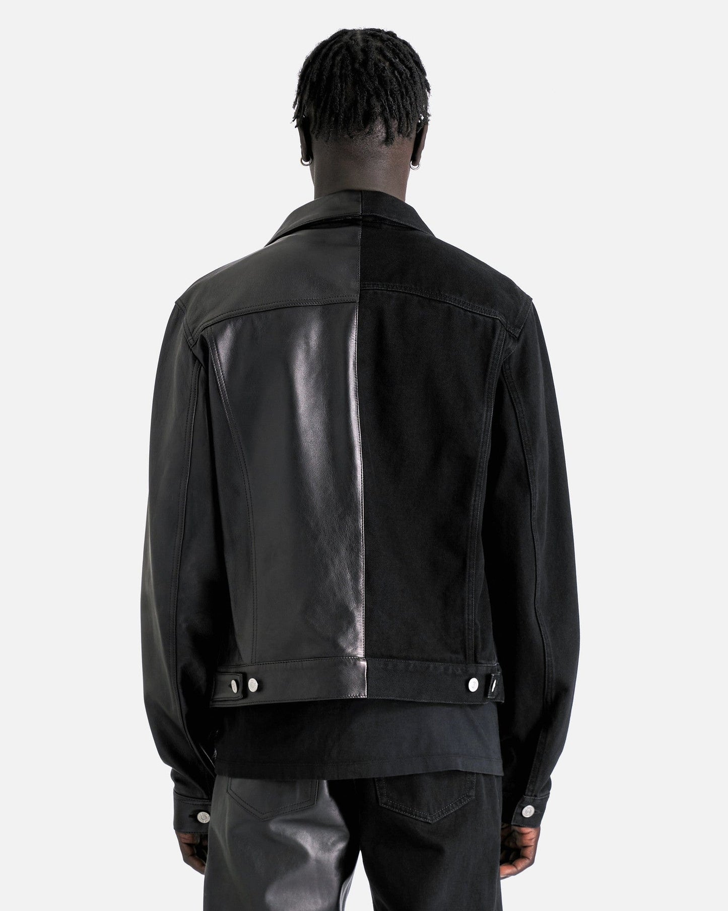 MM6 Maison Margiela 50/50 Sport Jacket in Black. This jacket is constructed with a 50/50 split of cotton and leather and feature a spread collar, 2 chest pockets with button fastening, button closure on front, button at the cuffs, white horizontal stitch line at back collar.