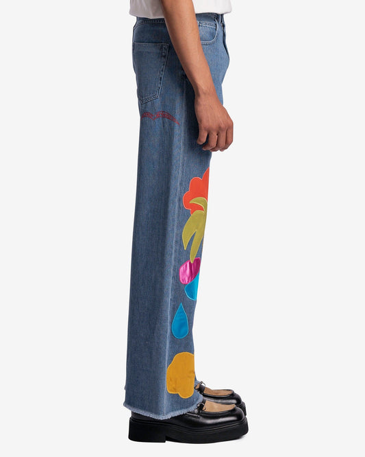 Worn Applique Detailed Denim in Iris Blue