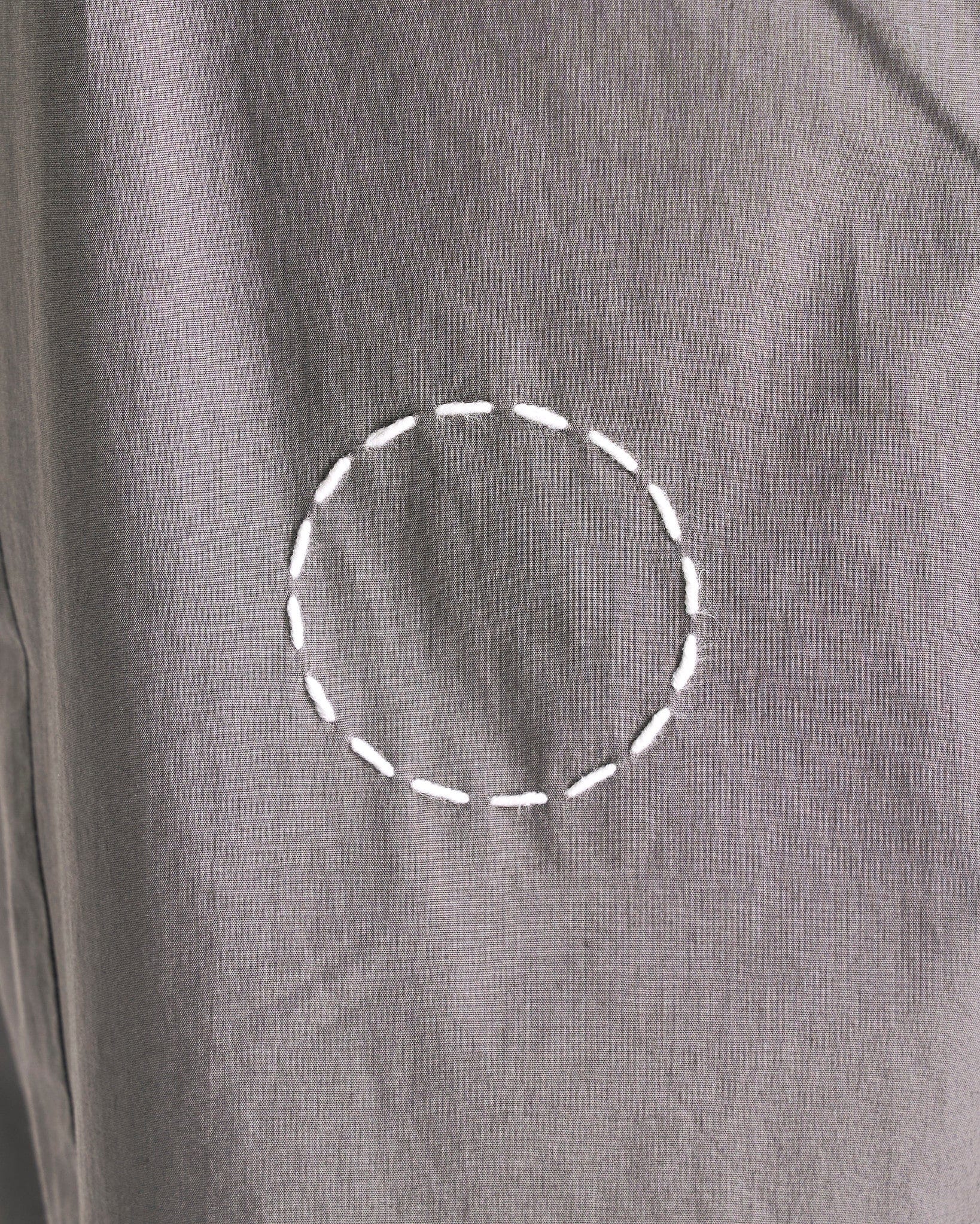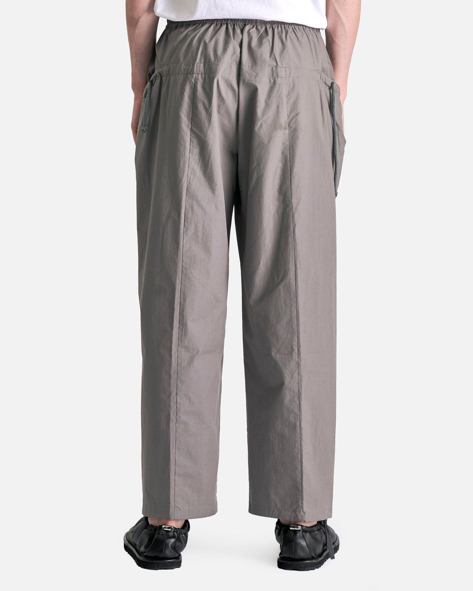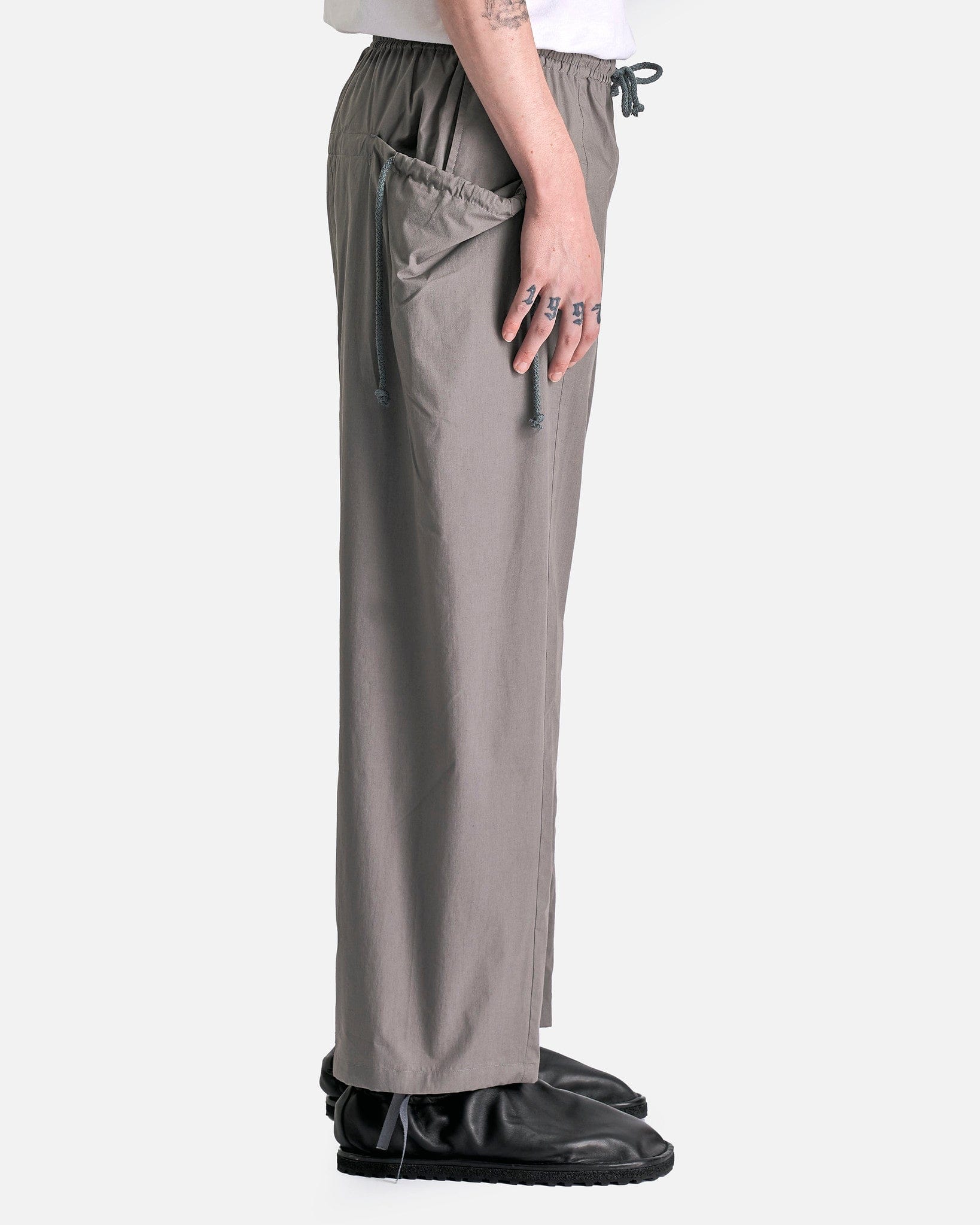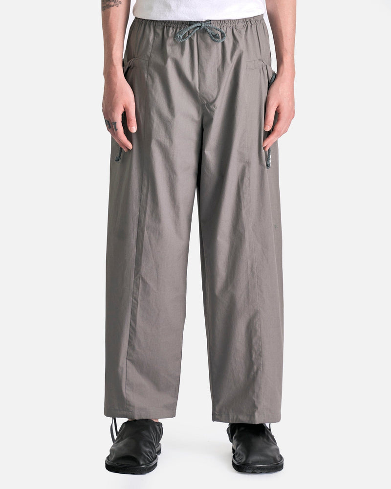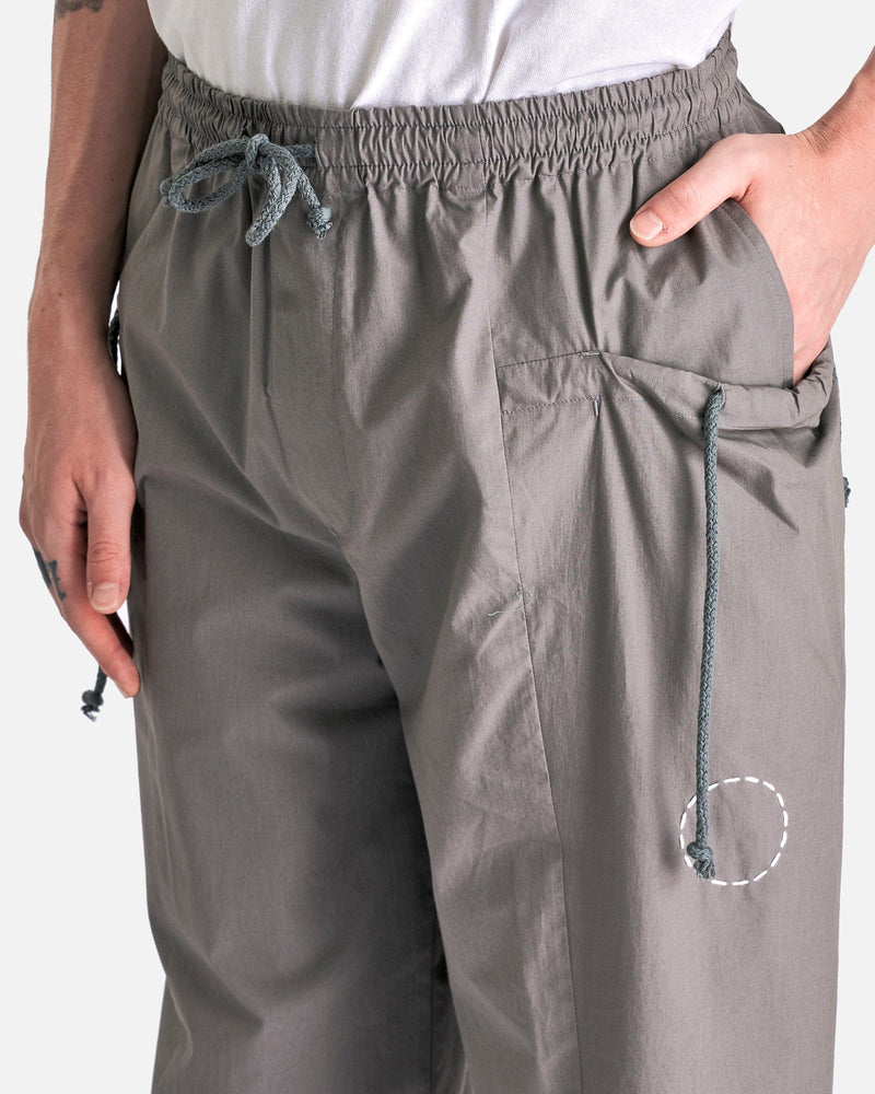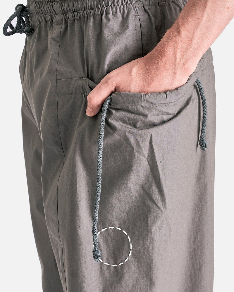 Craig Green Circle Trouser in Grey. These trousers feature an elasticated waistband with drawstring, embroidered logo at the leg and side patch pockets with drawstring cinch.