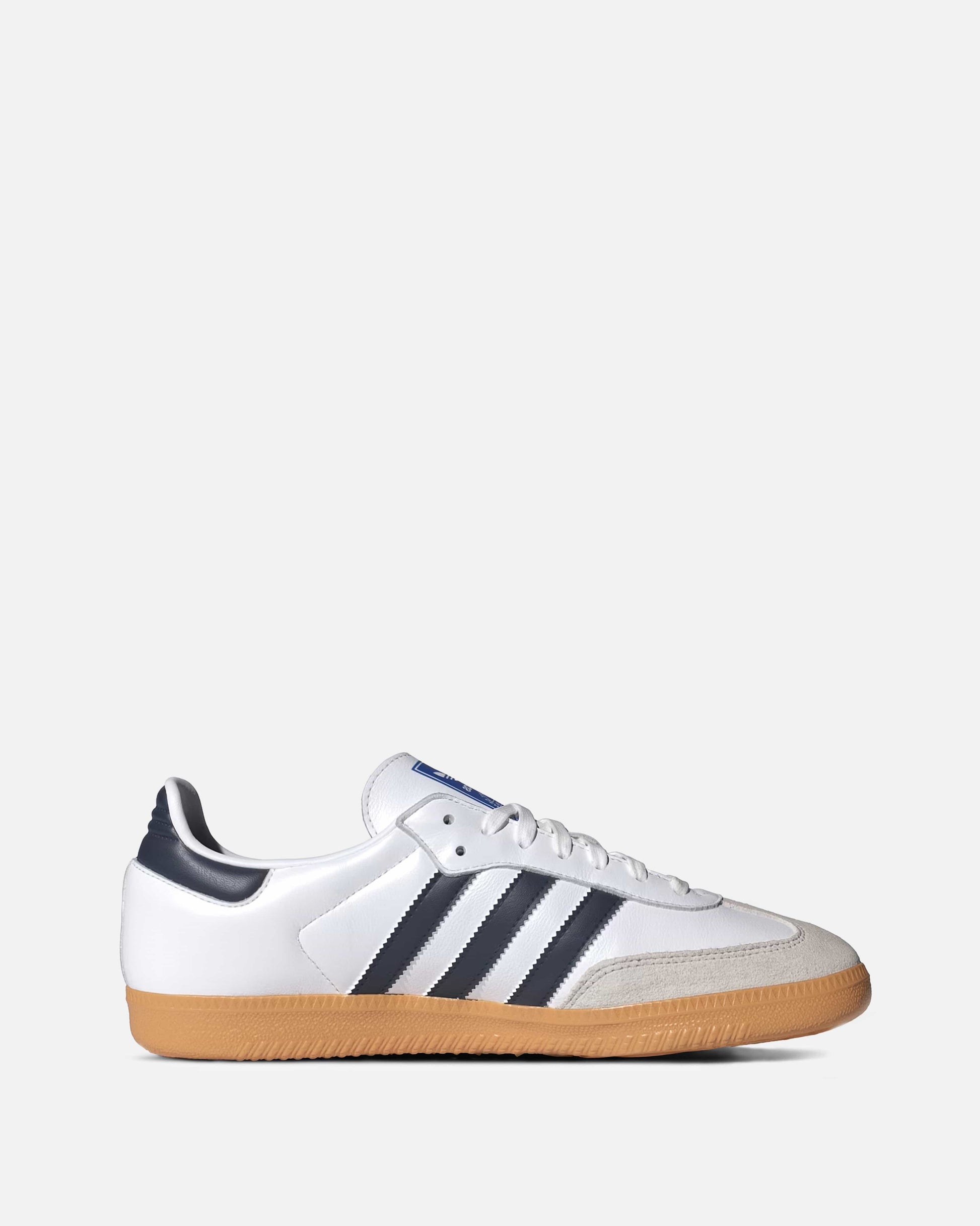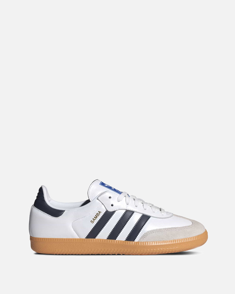 Men's Adidas Samba OG in White/Night Indigo. This sneaker features a white leather base with suede overlays on the mudguard and forefoot. Branding is included on the lateral side and tongue.