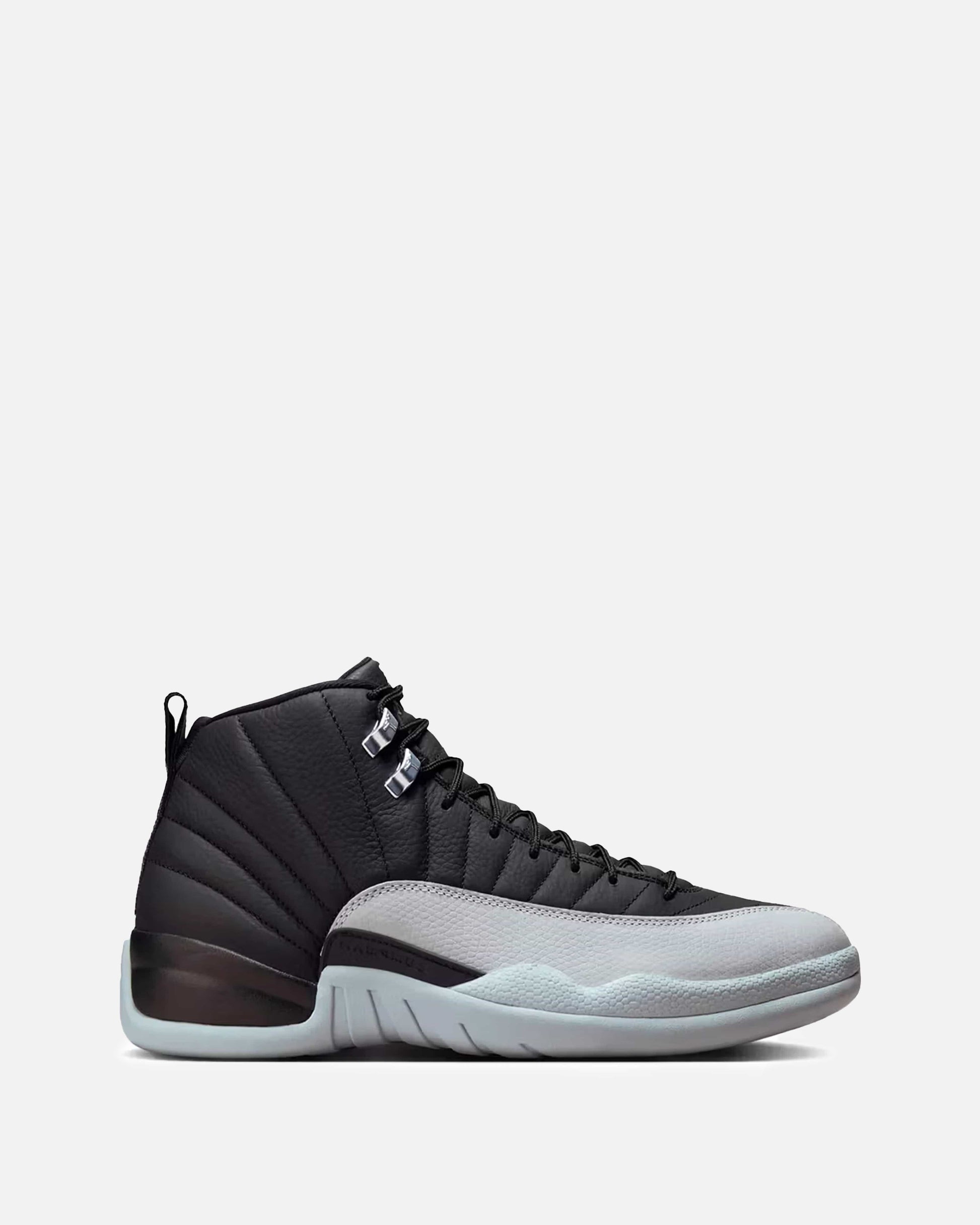 Air Jordan 12 in Black and Wolf Grey. This hightop sneaker features a leather base with textured leather overlays on the lateral side panel and mudguard. Jordan Brand's 'Jumpman' logo is embroidered on the tongue with additional branding on the jacquard nylon pull tab on the heel.