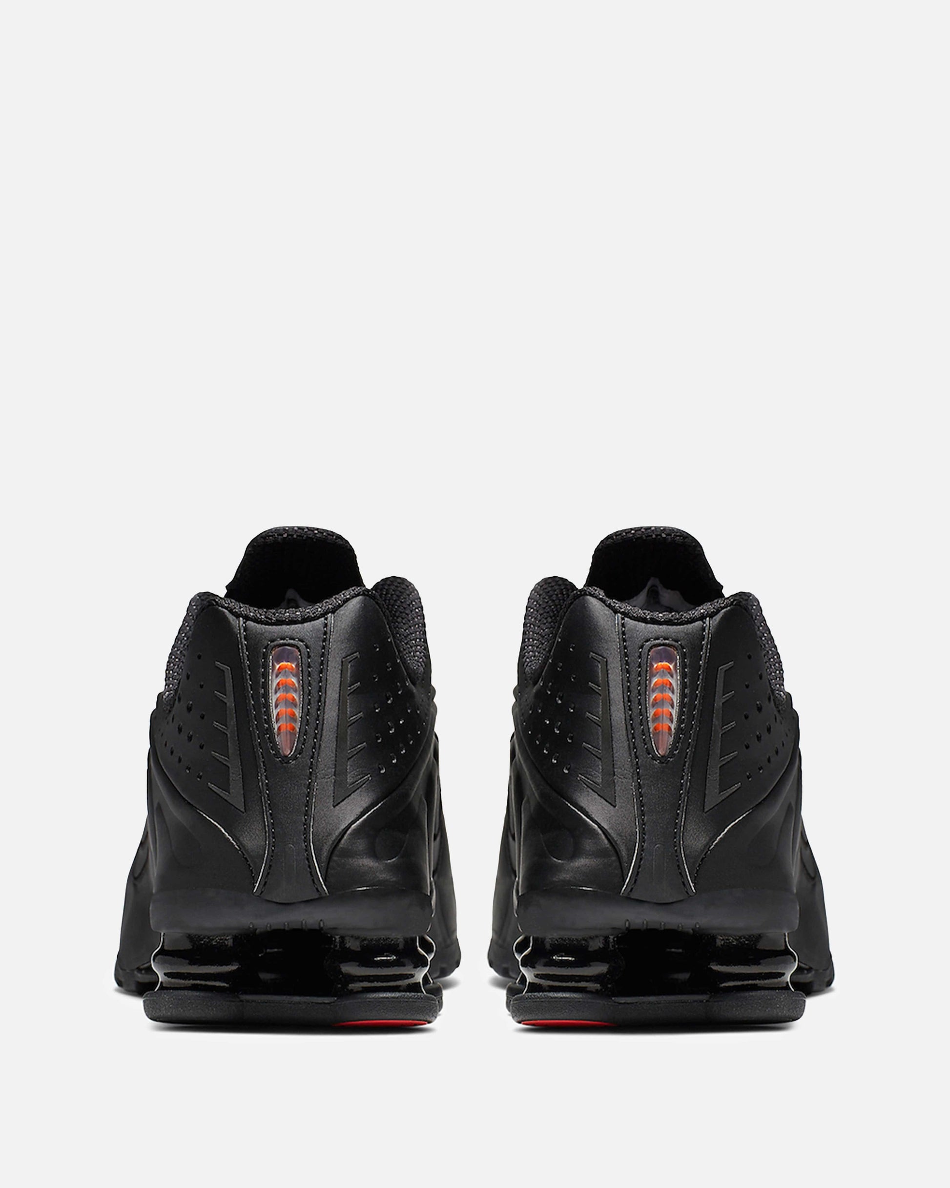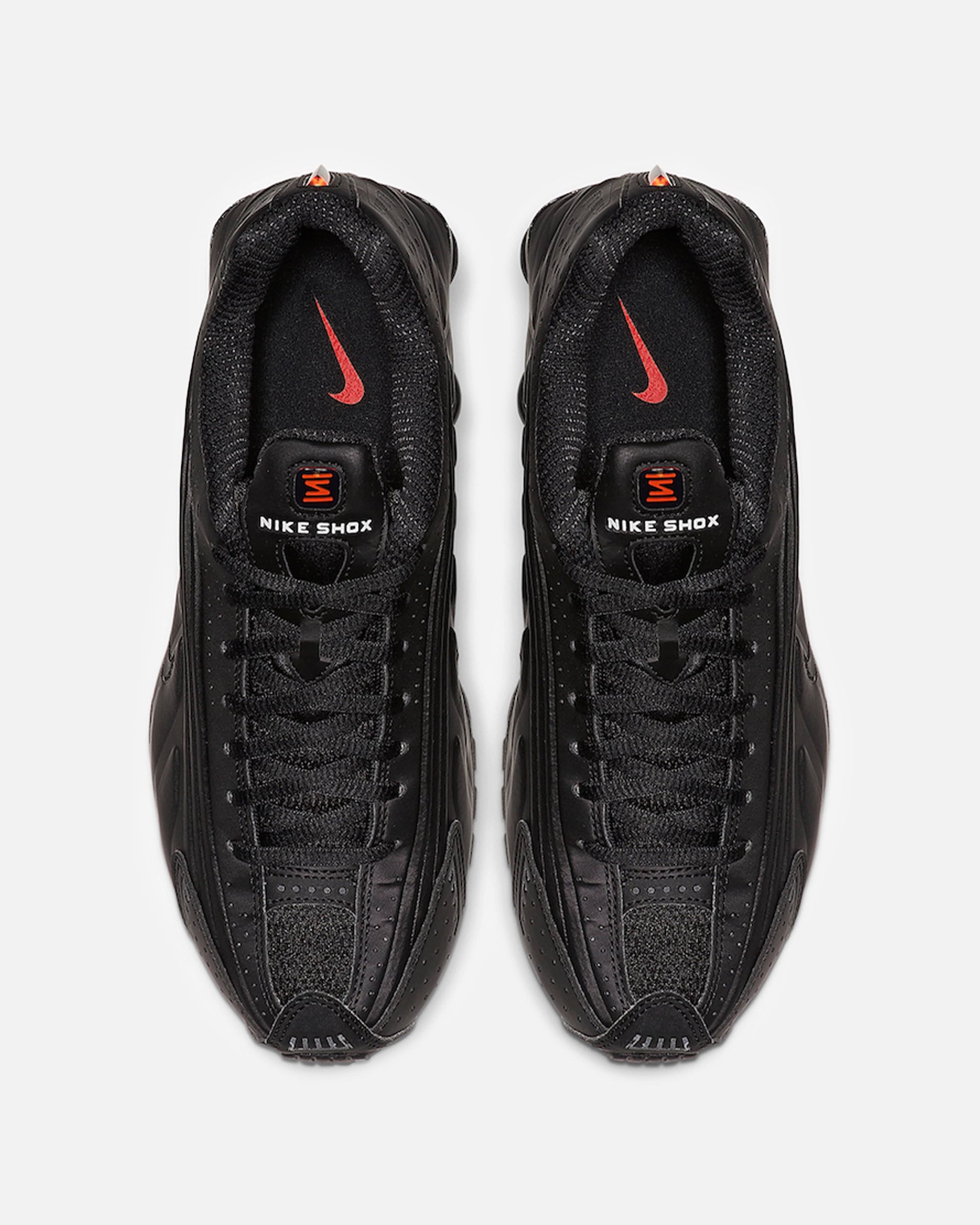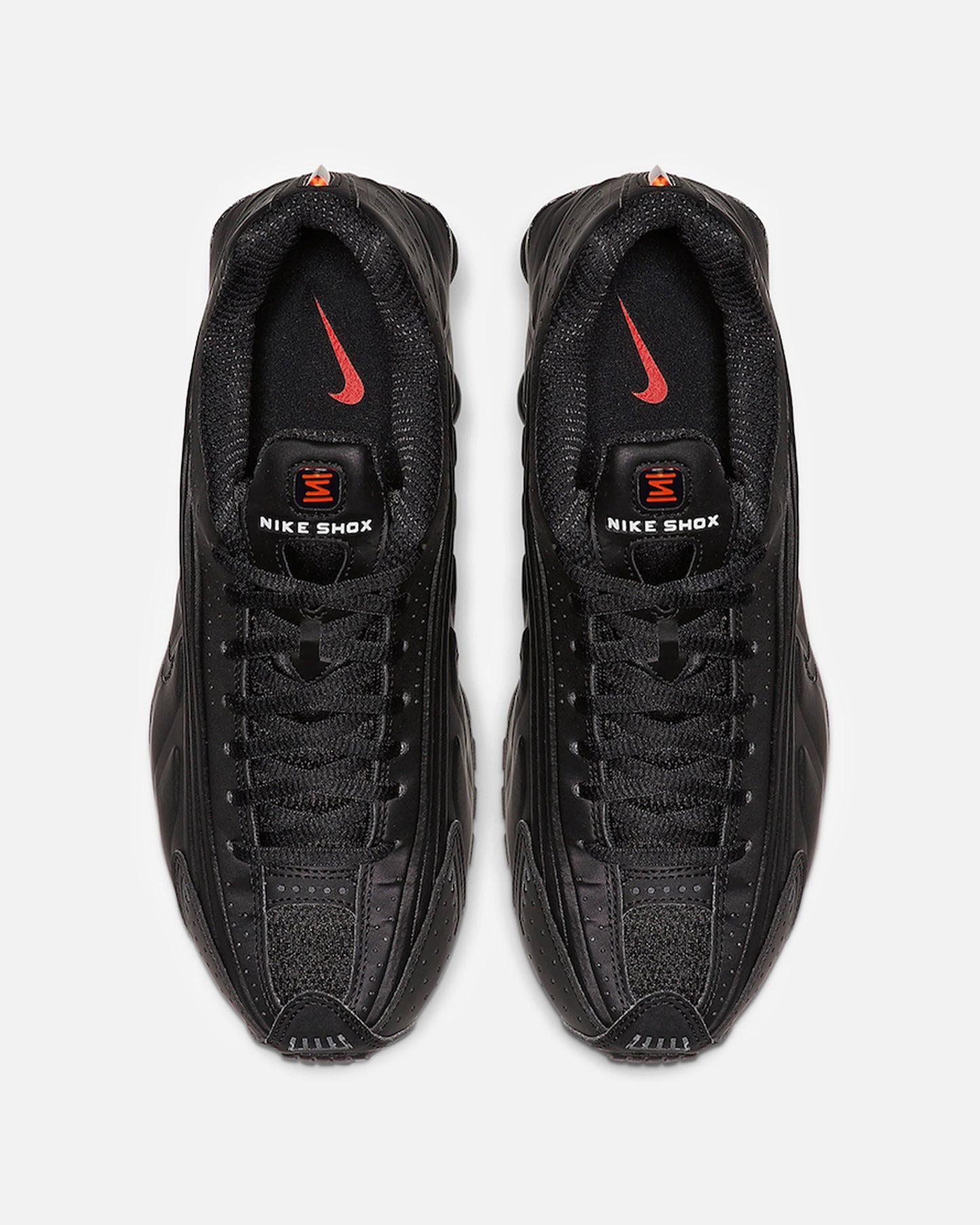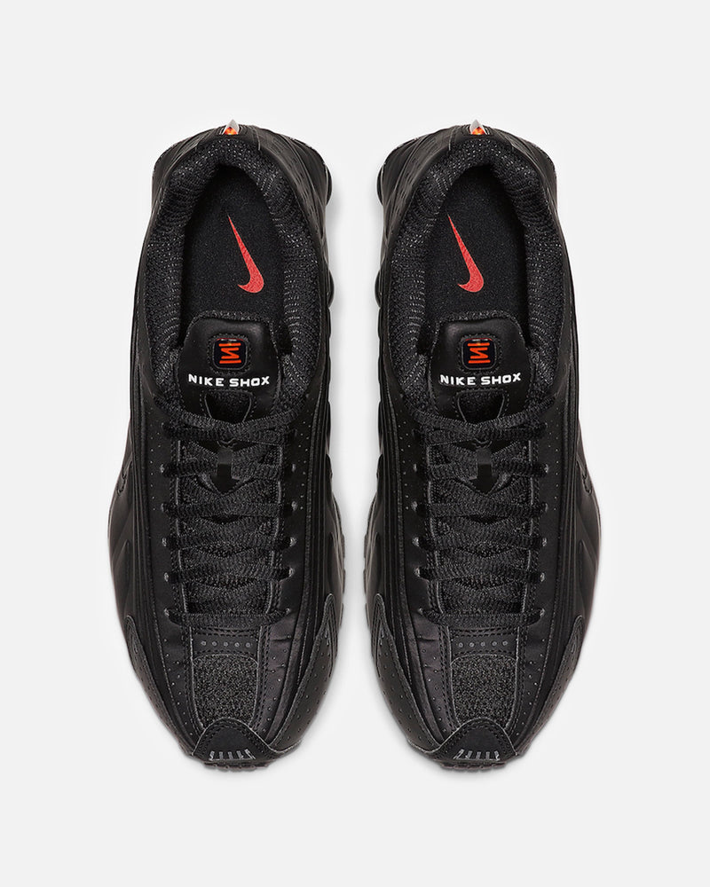 Women's Nike Shox R4 in Black and Max Orange. This low-top sneaker features a leather base with embossed leather overlays on the side panels and polyurethane columns in the midsole. Branding is included on the tongue.