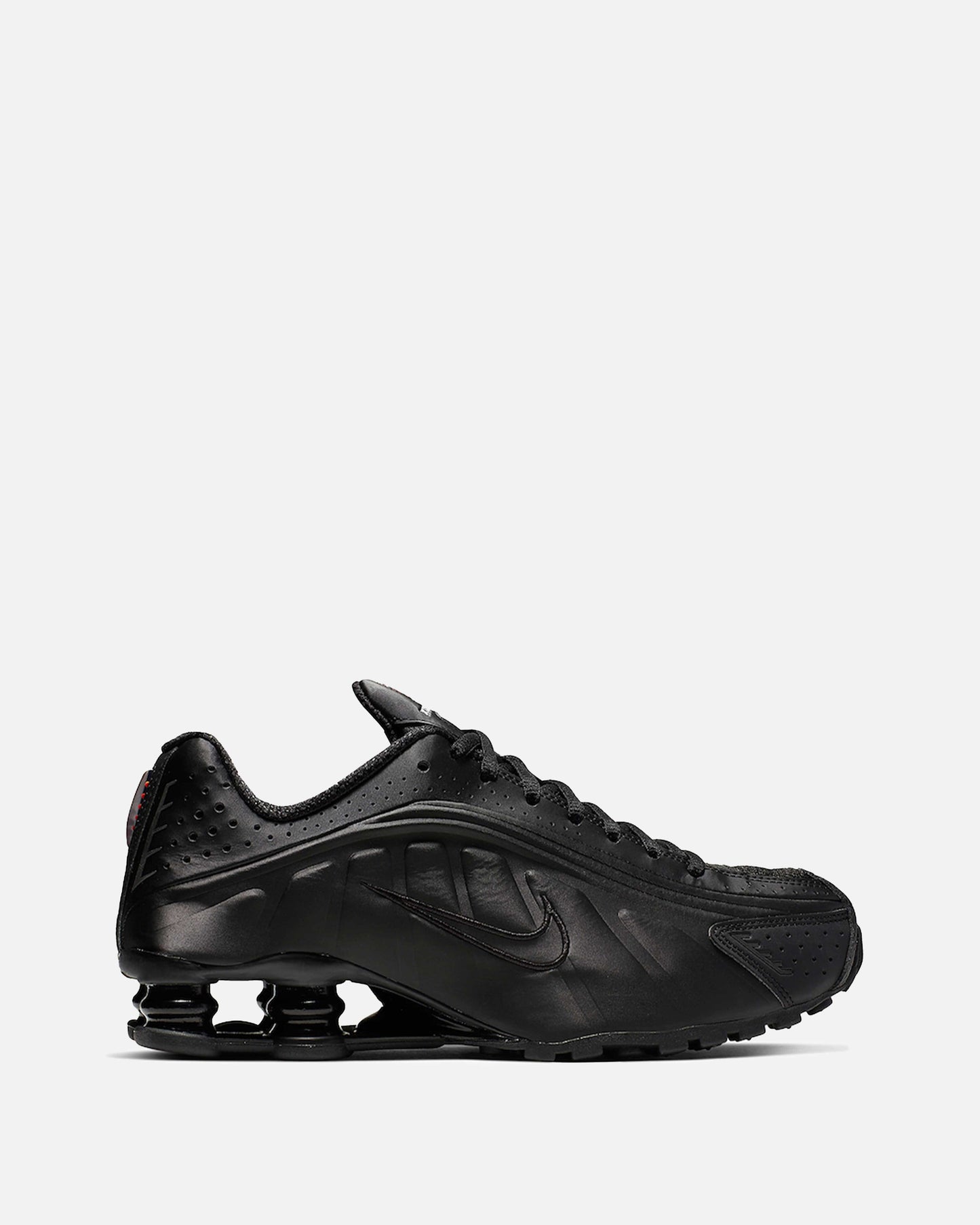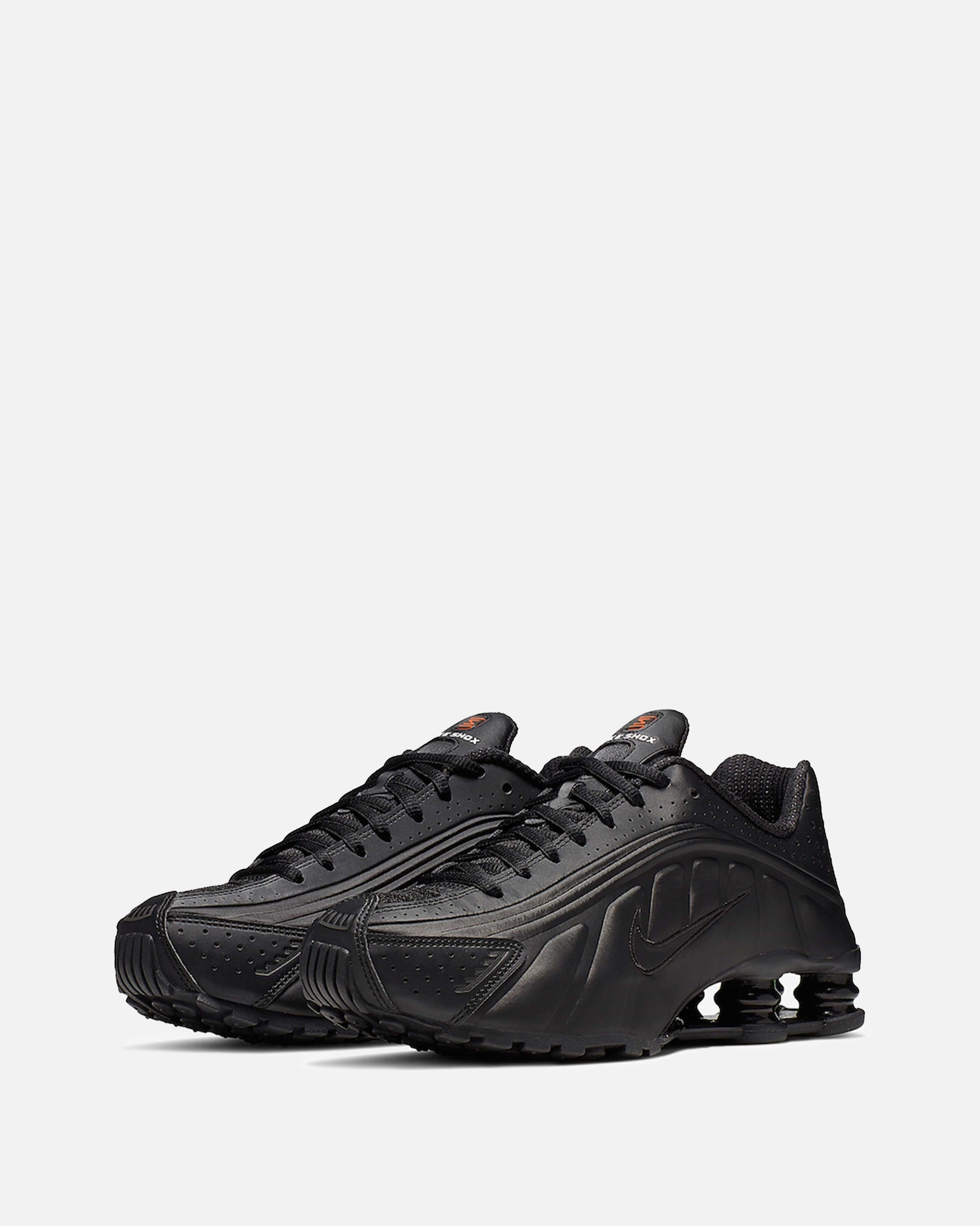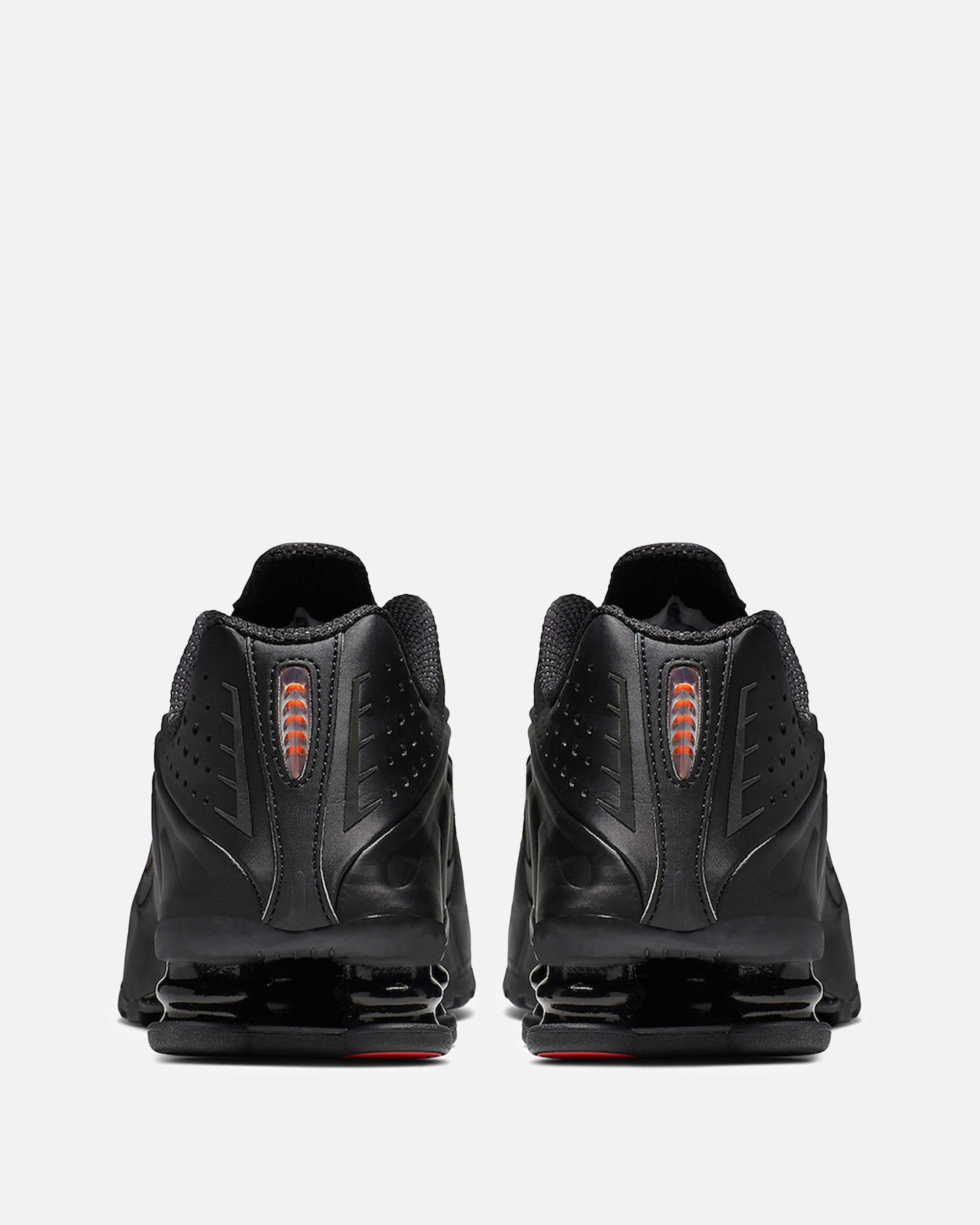 Women's Nike Shox R4 in Black and Max Orange. This low-top sneaker features a leather base with embossed leather overlays on the side panels and polyurethane columns in the midsole. Branding is included on the tongue.