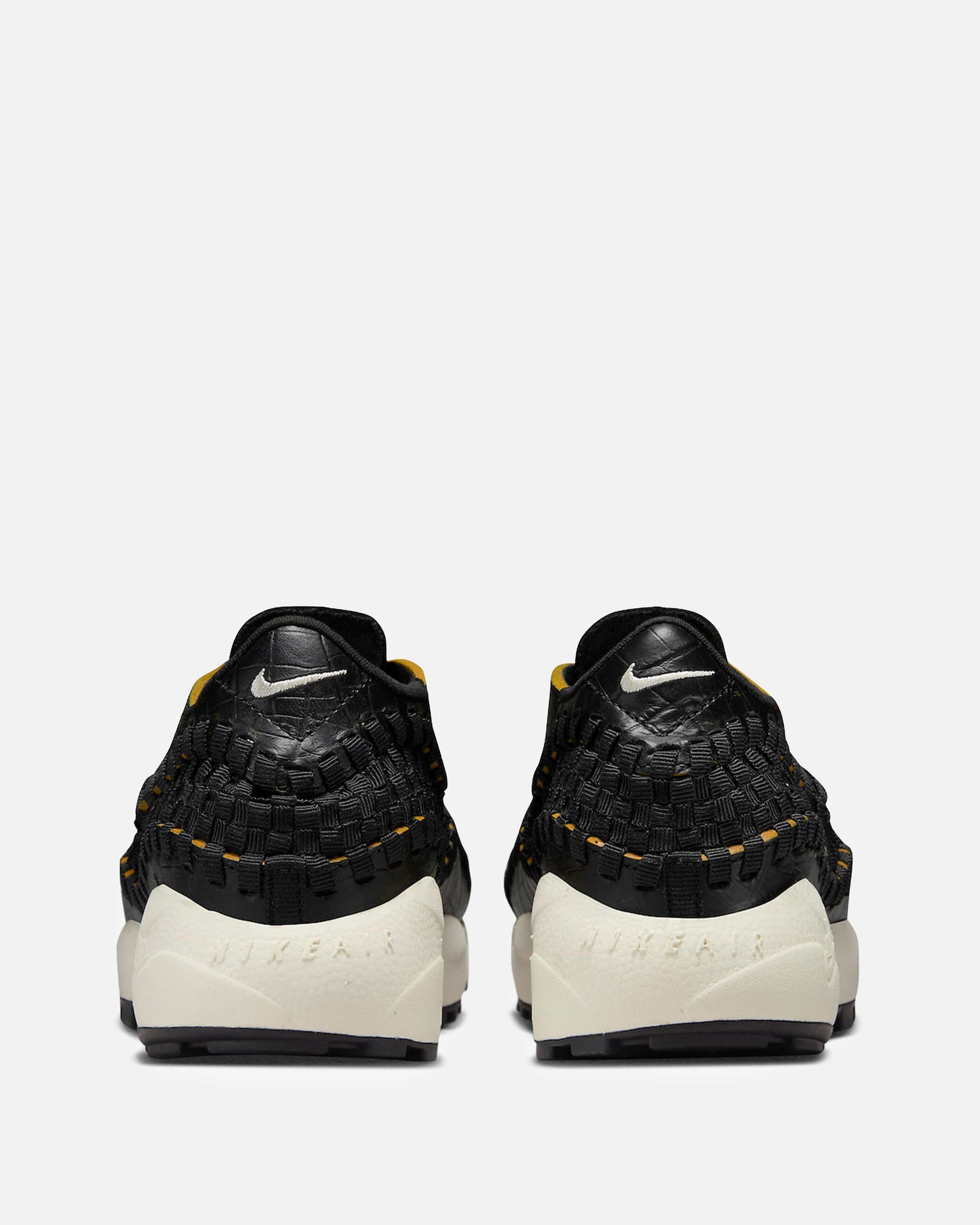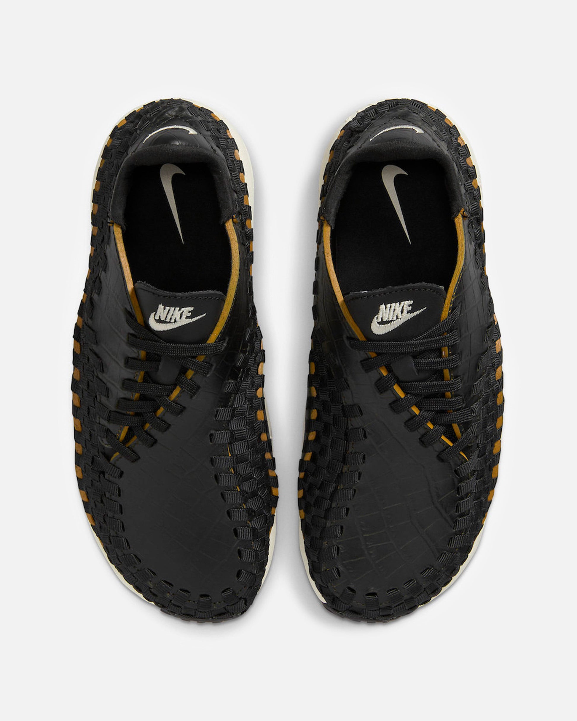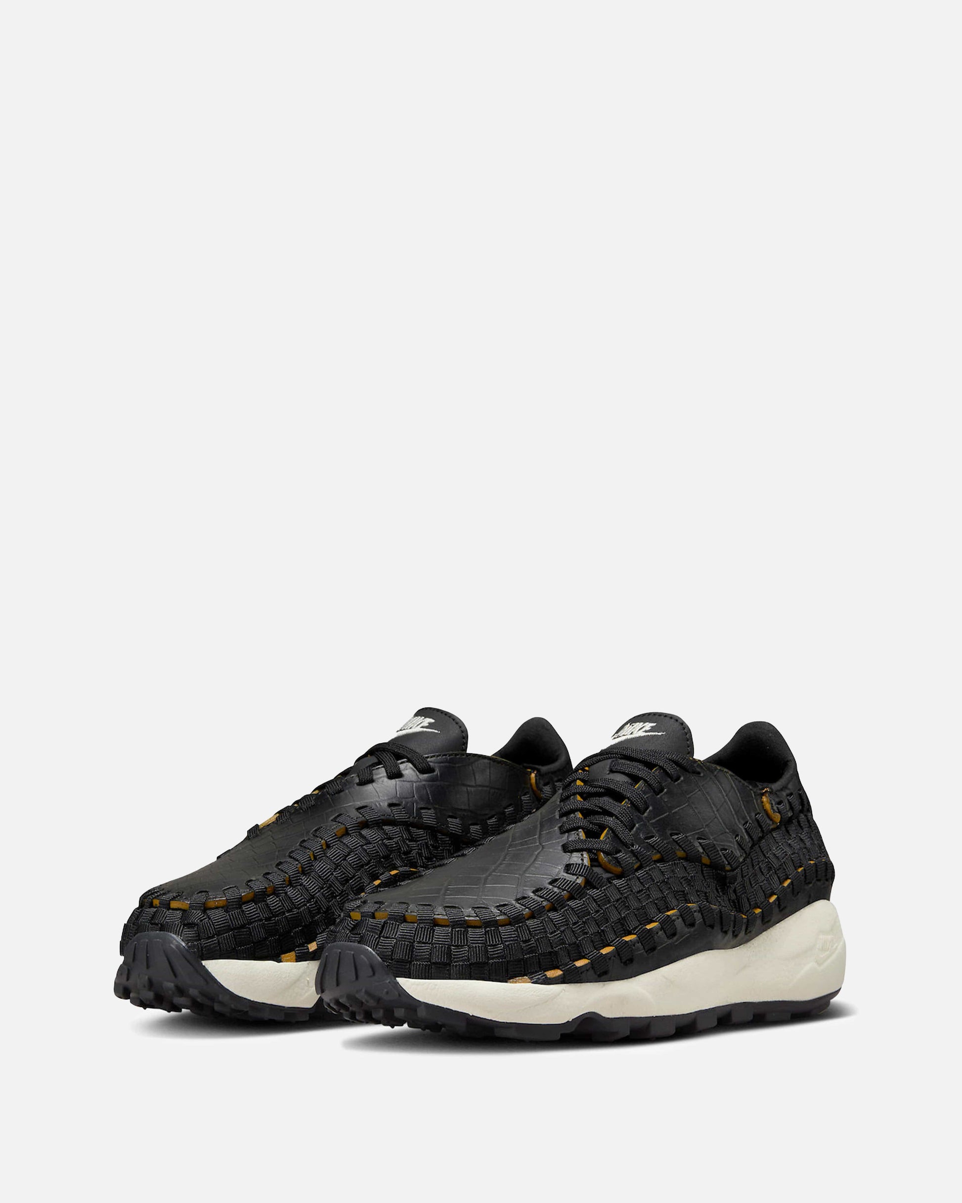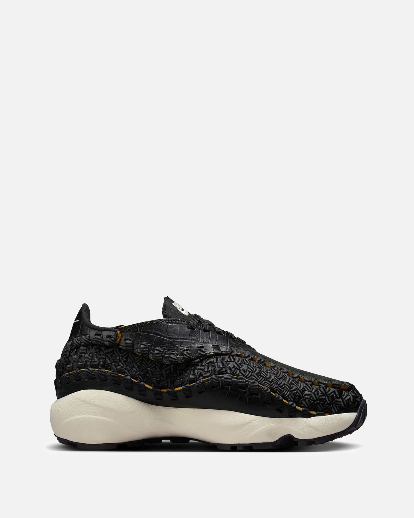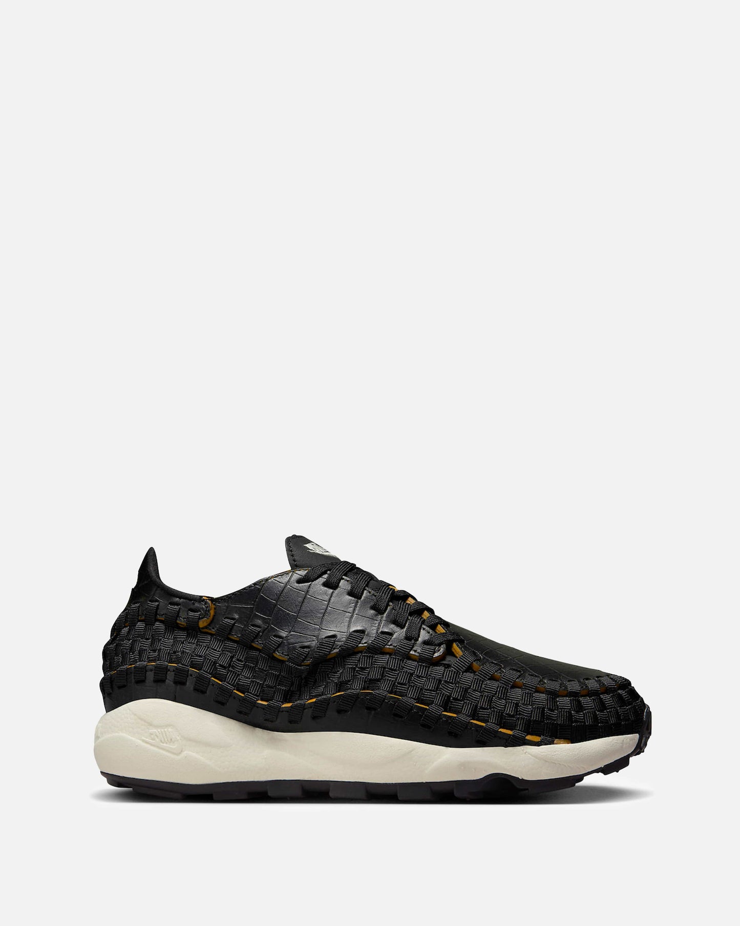 Women's Nike Air Footscape Woven in Black and Desert Ochre. This low-top sneaker features a textured leather upper with a woven stripe overlay on the upper. Embroidered branding is included on the tongue and heel.