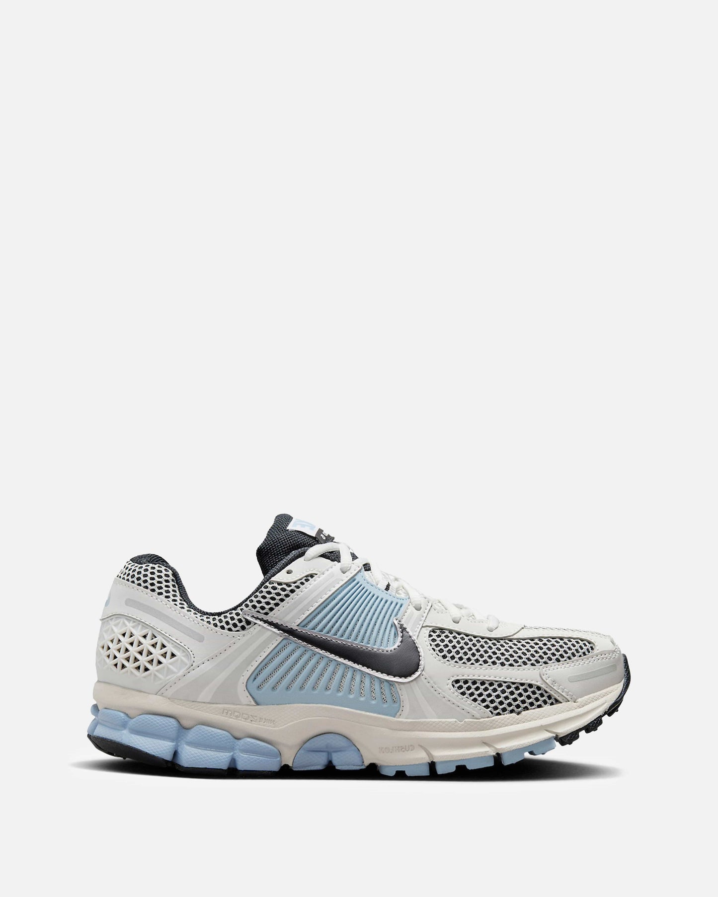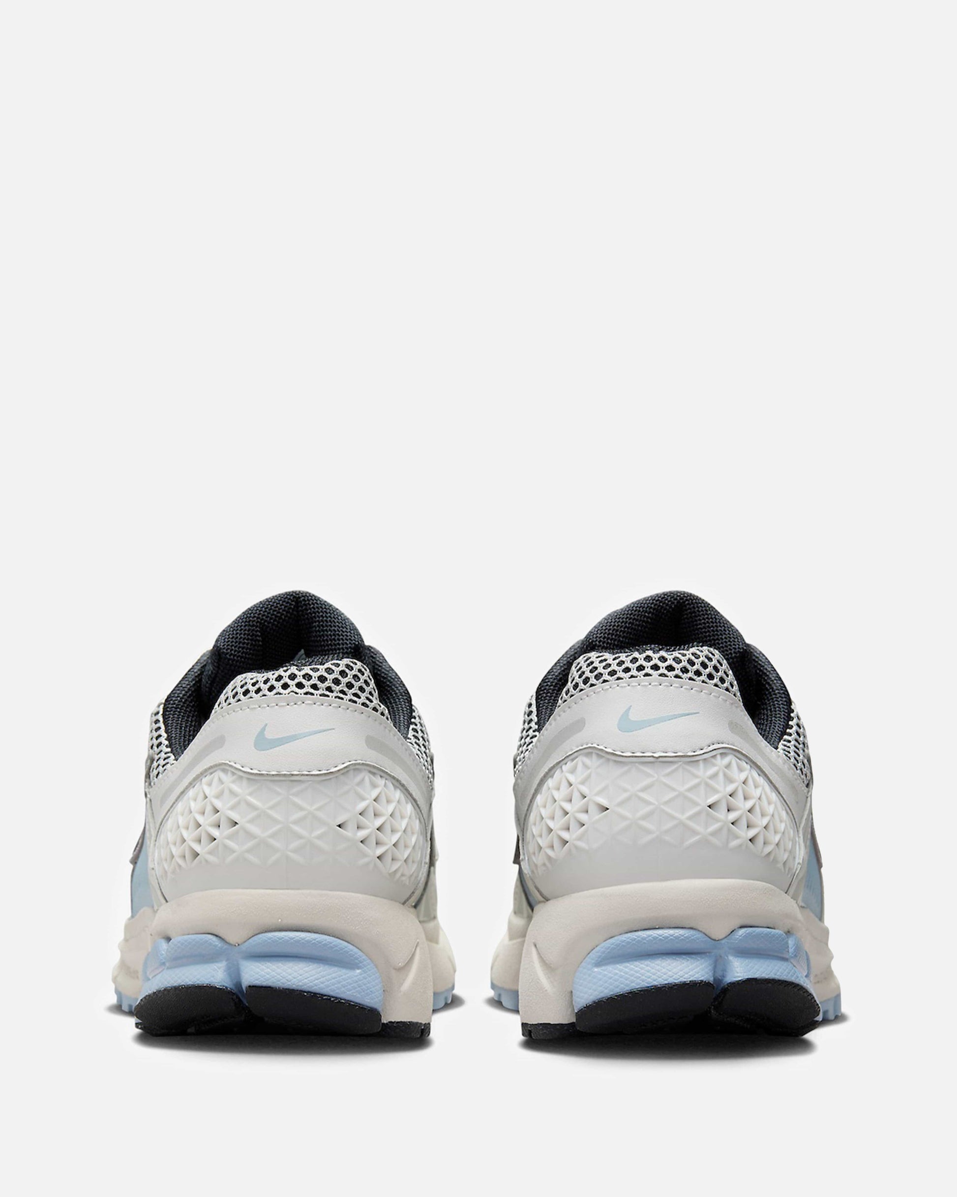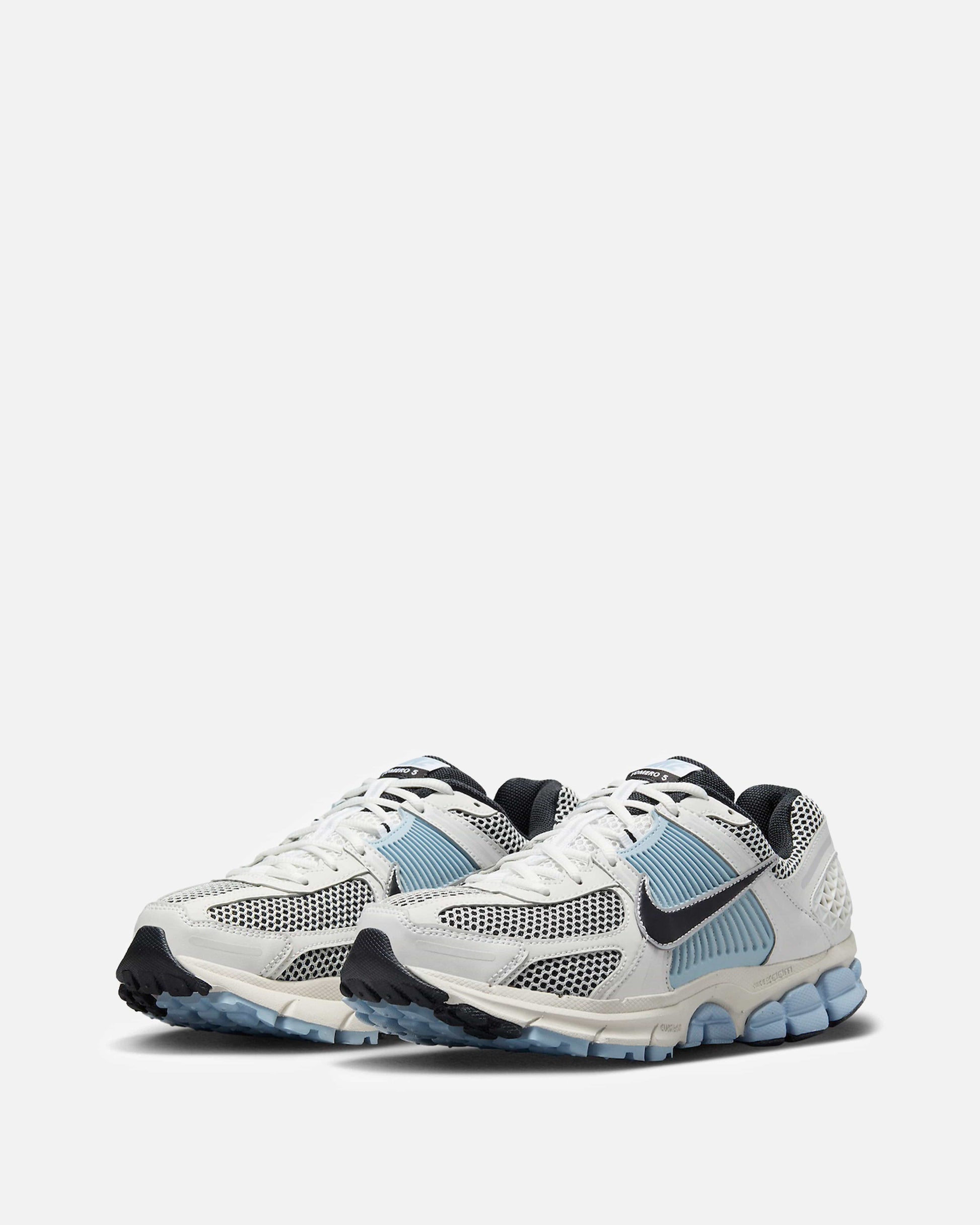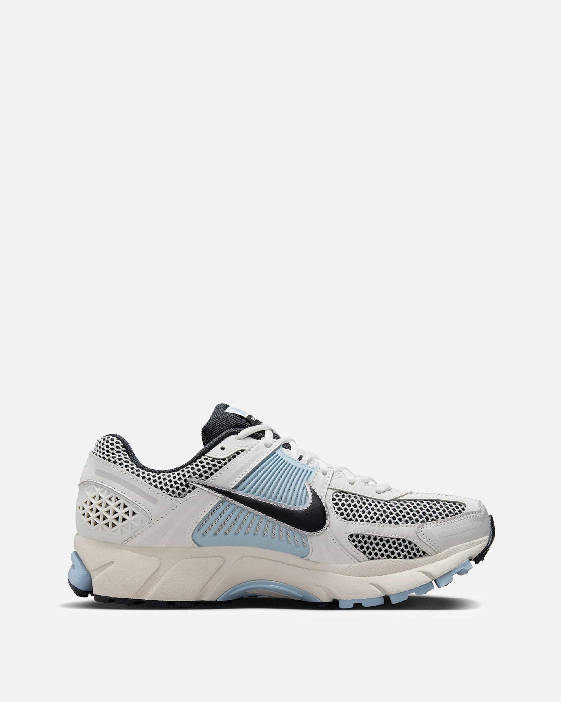 Women's Nike Zoom Vomero 5 in Platinum Tint and Light Armory Blue. This low-top sneaker features a mesh base with leather and suede overlays on the upper, a synthetic TPU cage on the side panels and heel. A jacquard nylon logo patch is stitched on the tongue with additional branding embroidered on the heel.