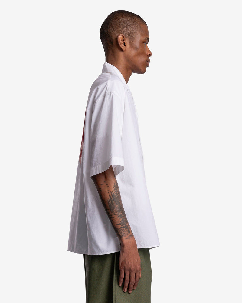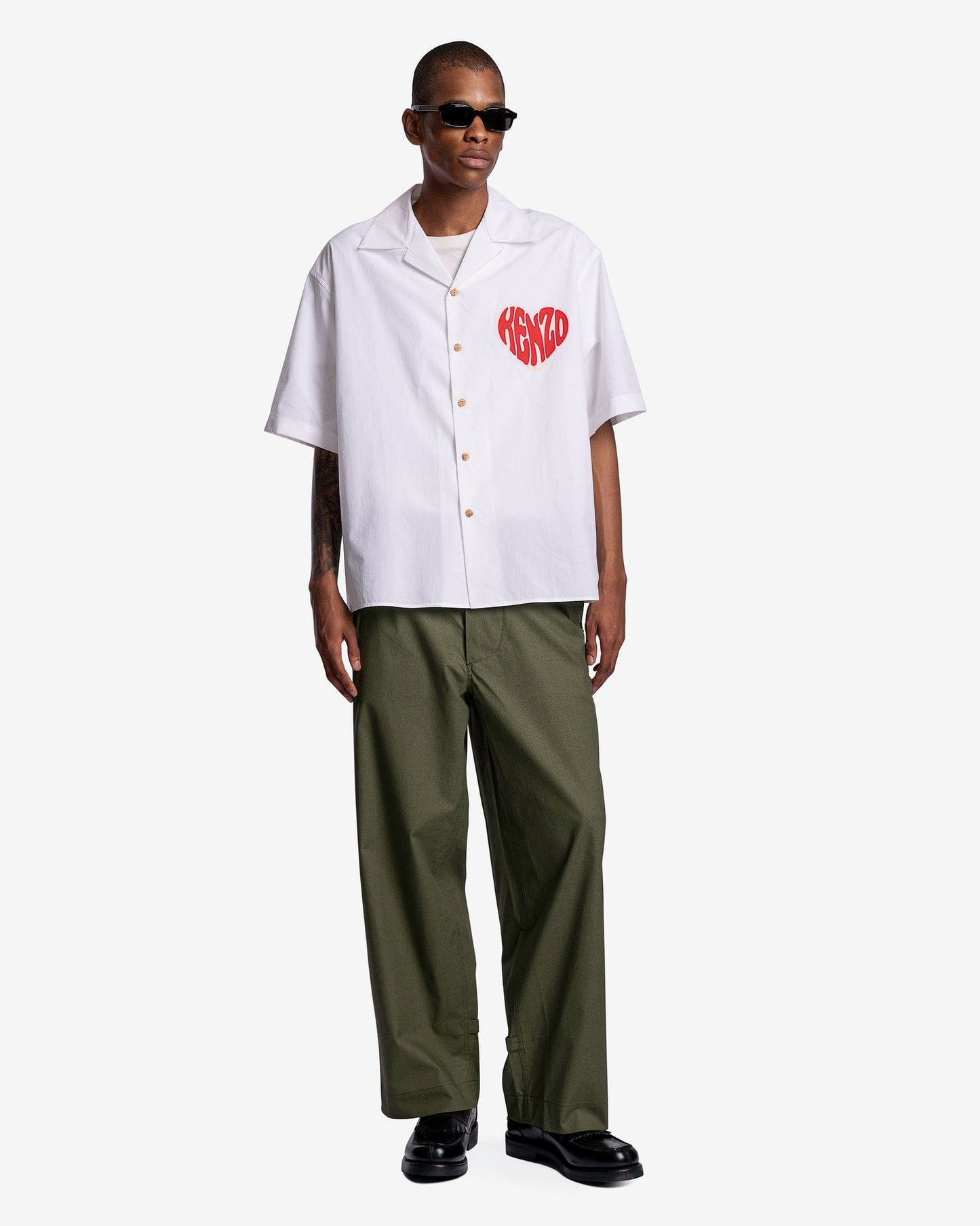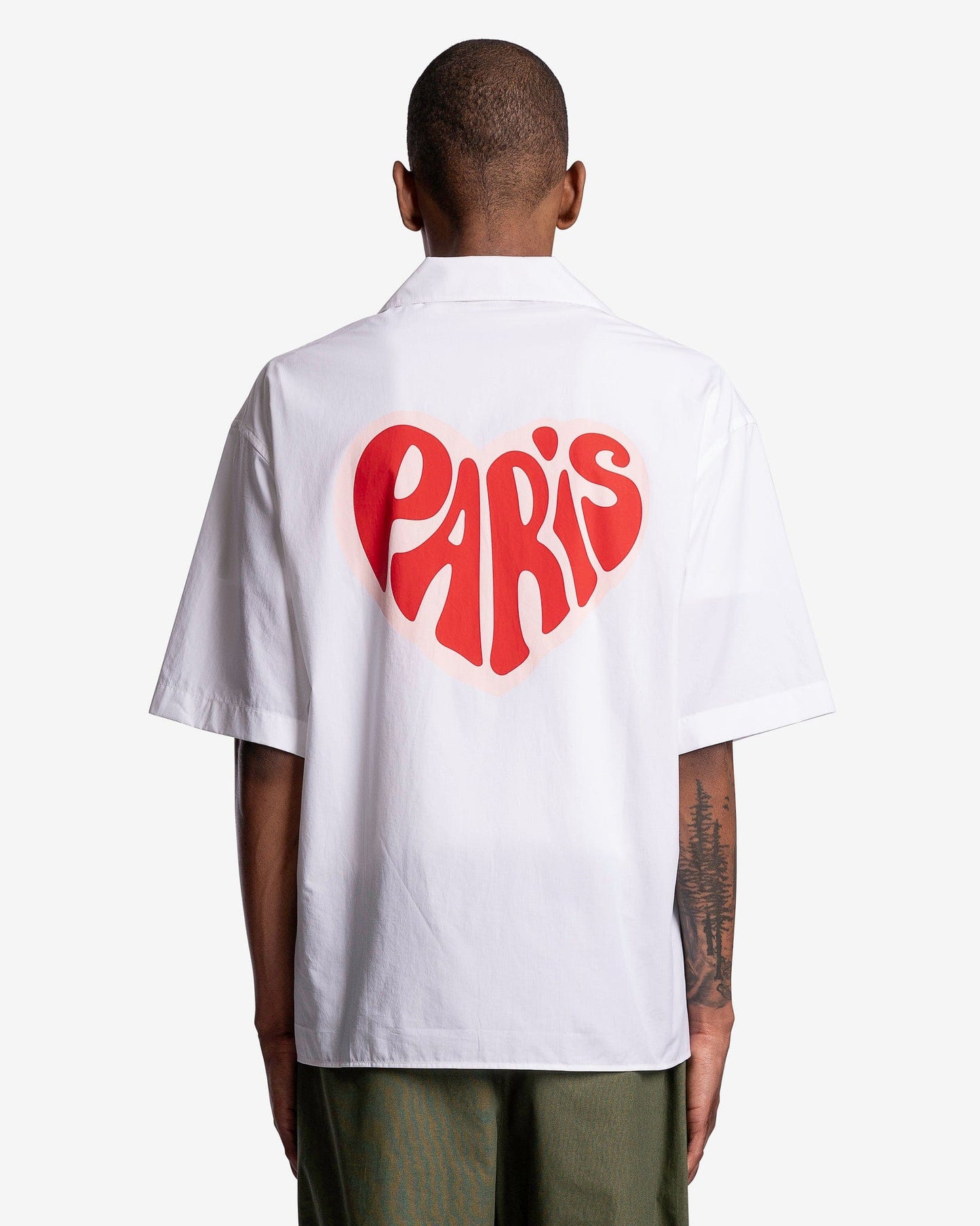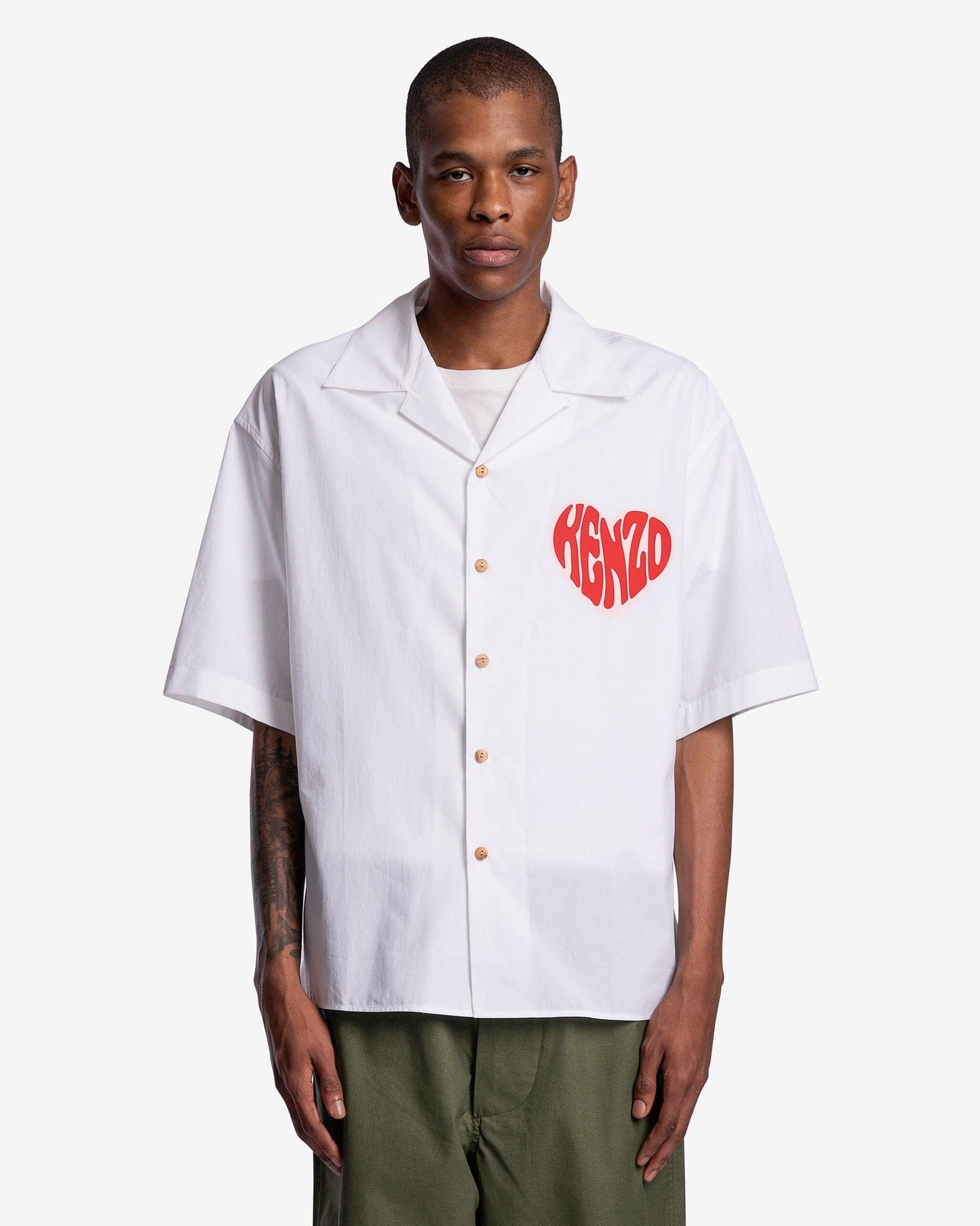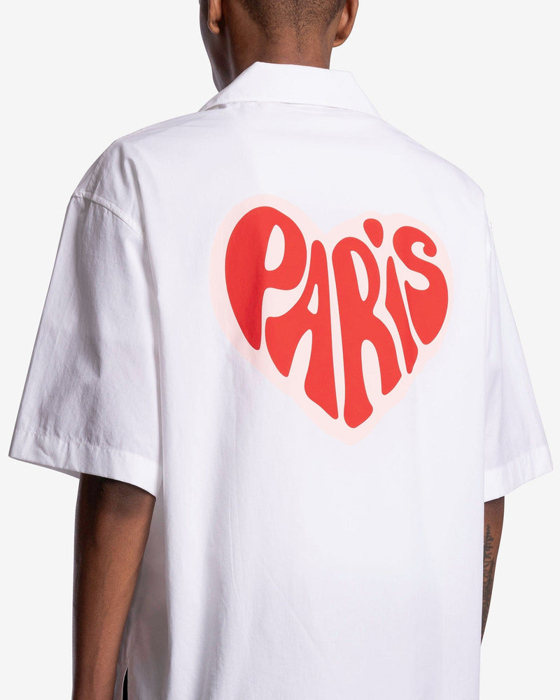KENZO men's camp collar shirt with heart graphic in white. This shirt features a heart graphic reading Kenzo on the chest and a heart graphic reading Paris on the back.