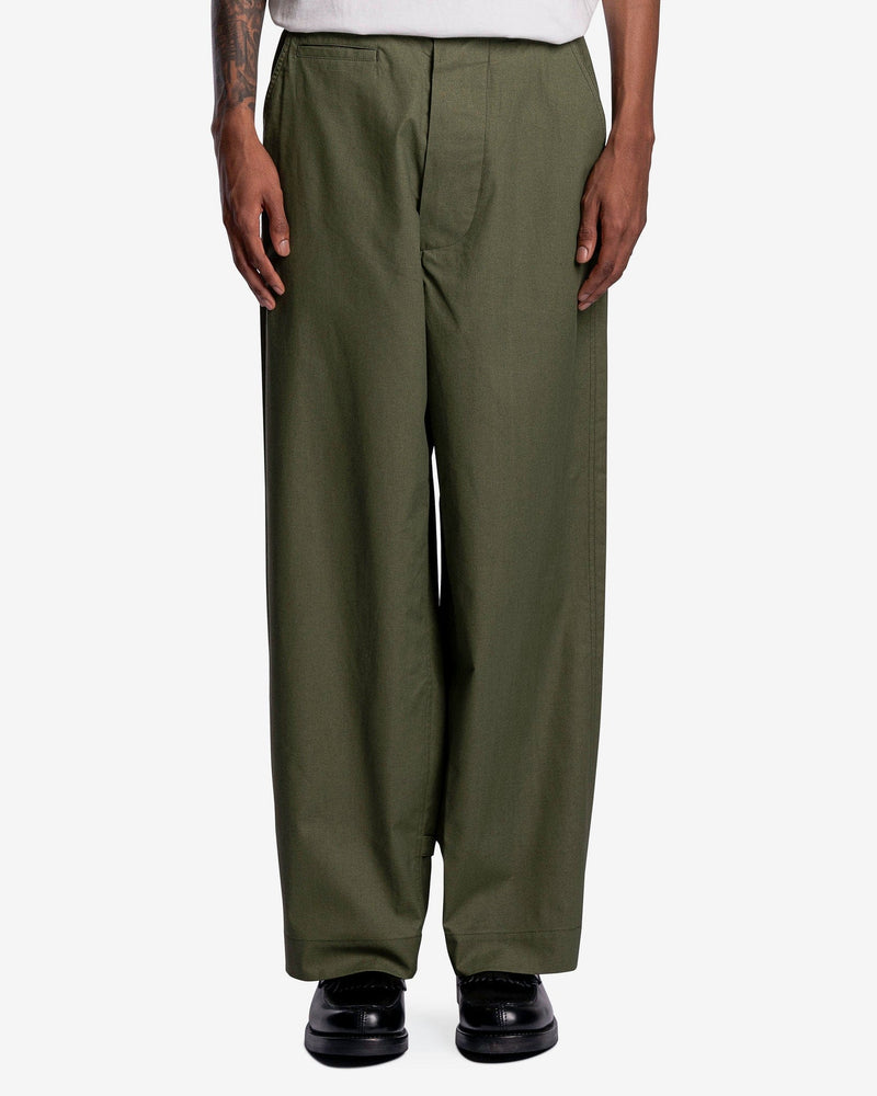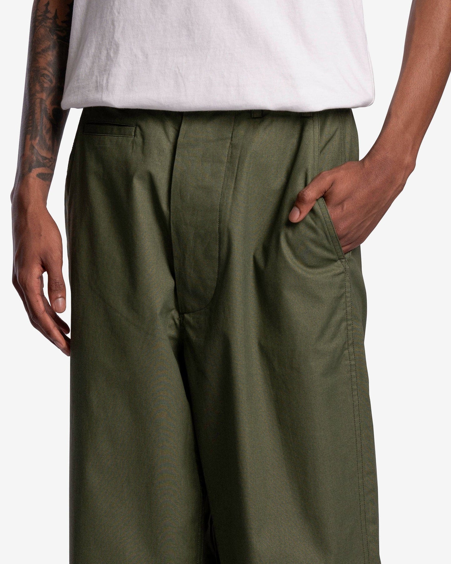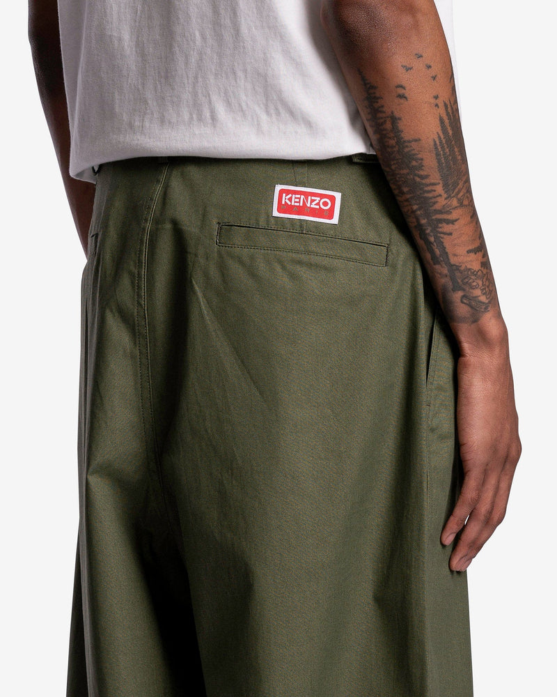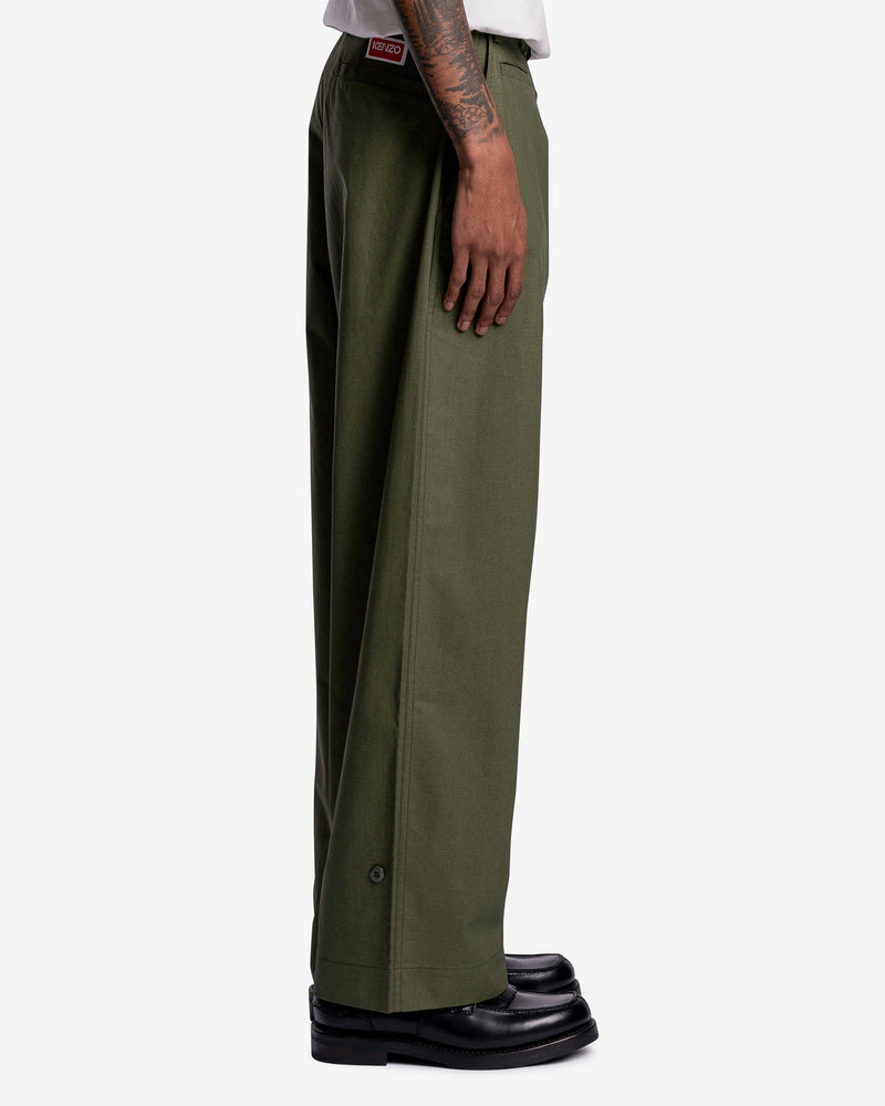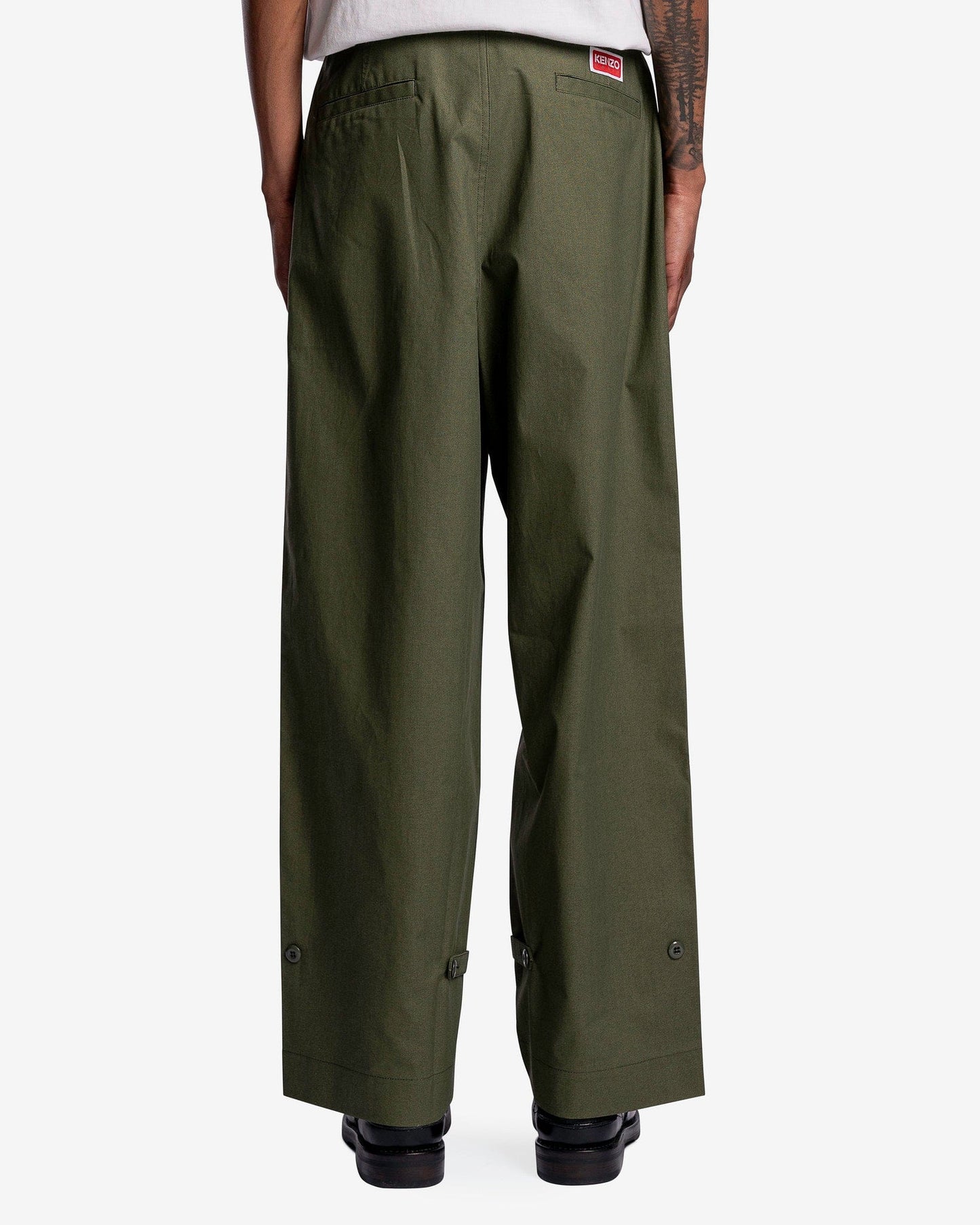 KENZO men's oversized straight leg pants in green. These pants feature front zip closure, a four pocket design and a logo patch at the back waist.