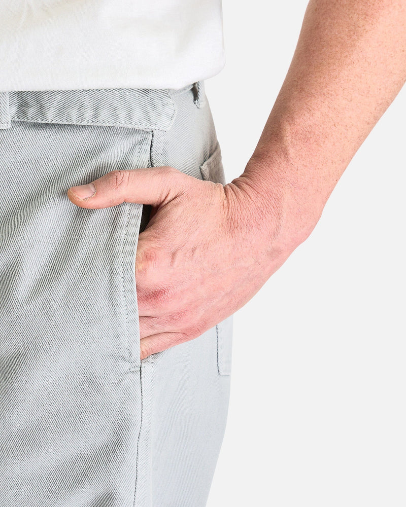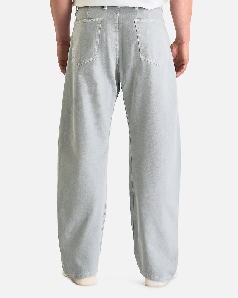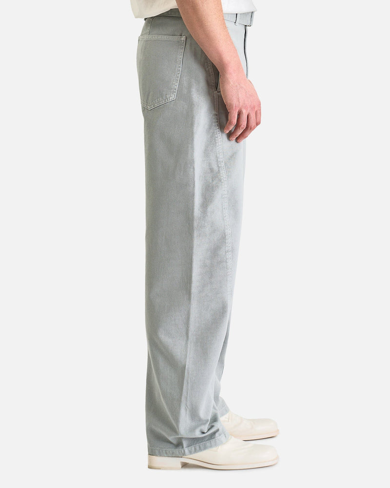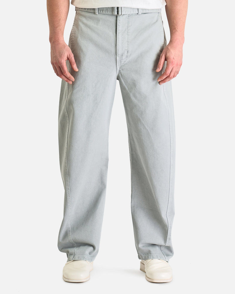 LEMAIRE Twisted Belted Pants in Snowy Blue Grey. These pants are crafted from garment dyed cotton denim and features a zip fly and button closure, removable belt with metal buckle, 4-pocket styling, and twisted side seams giving the pant and shapely curve.