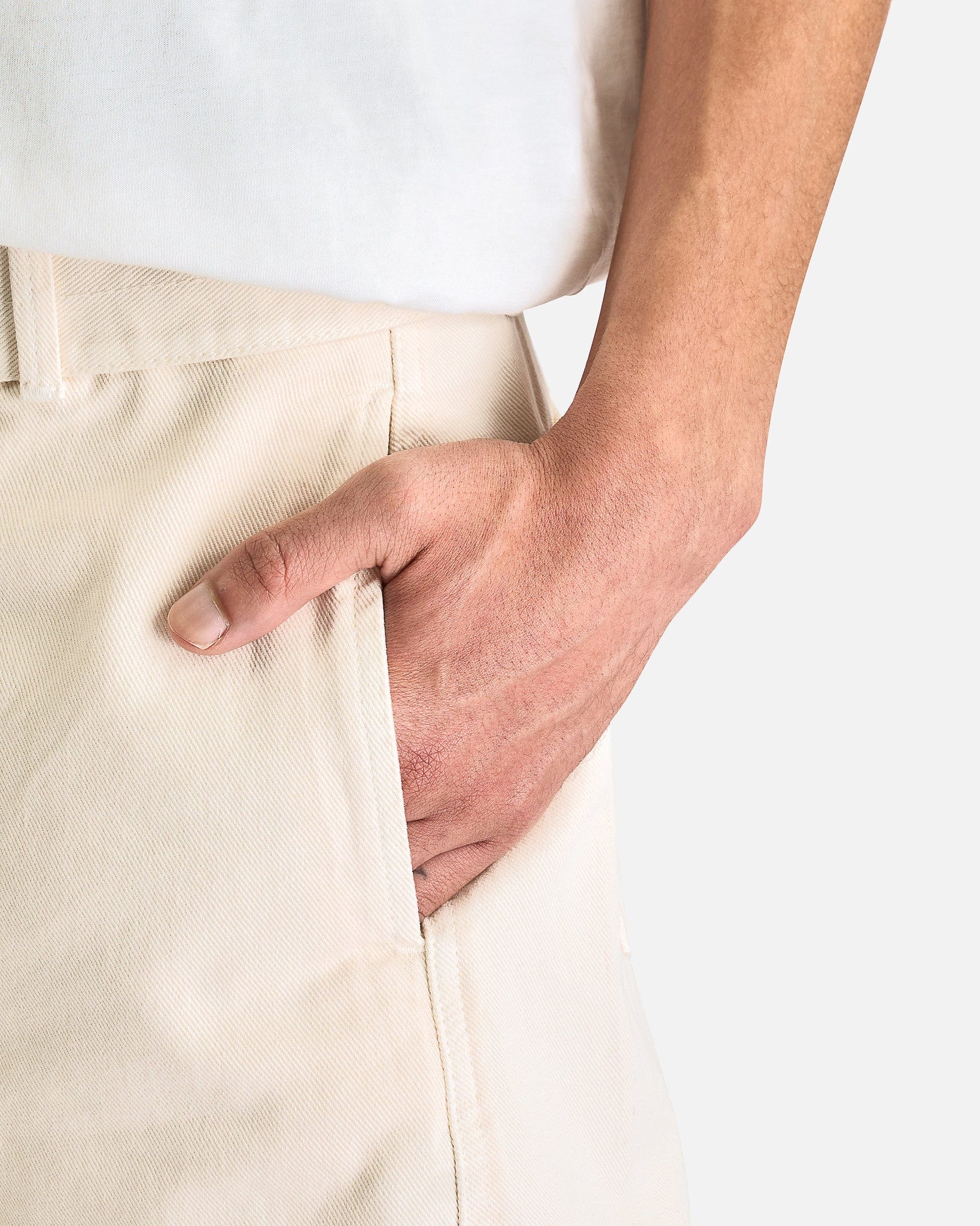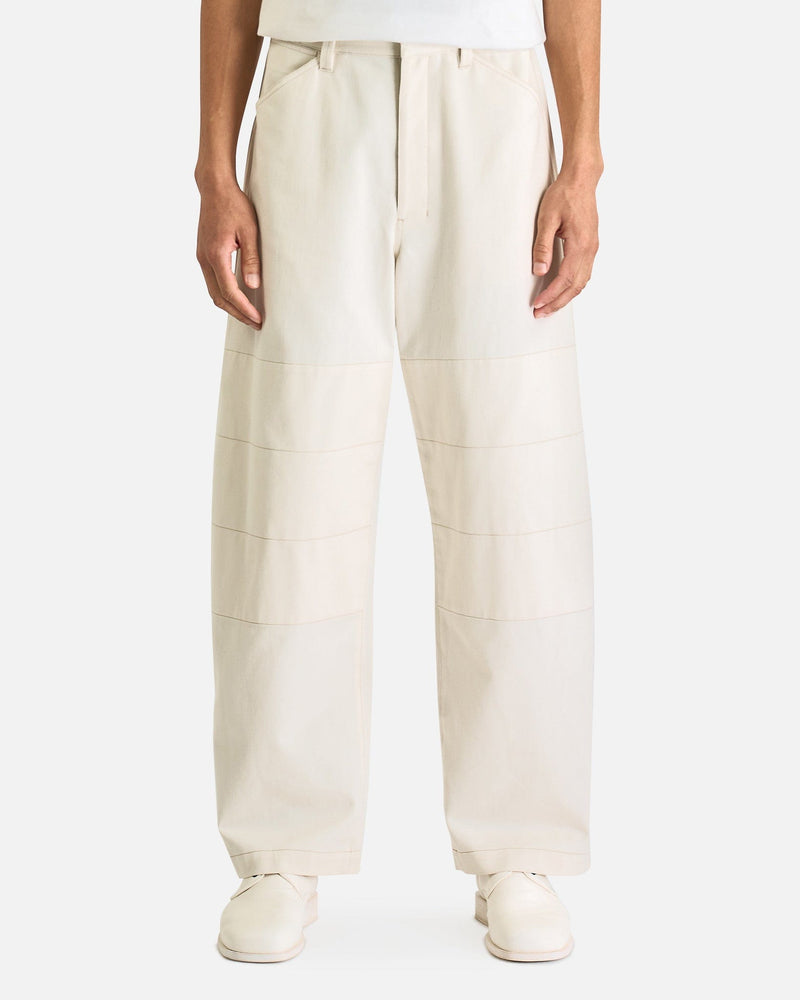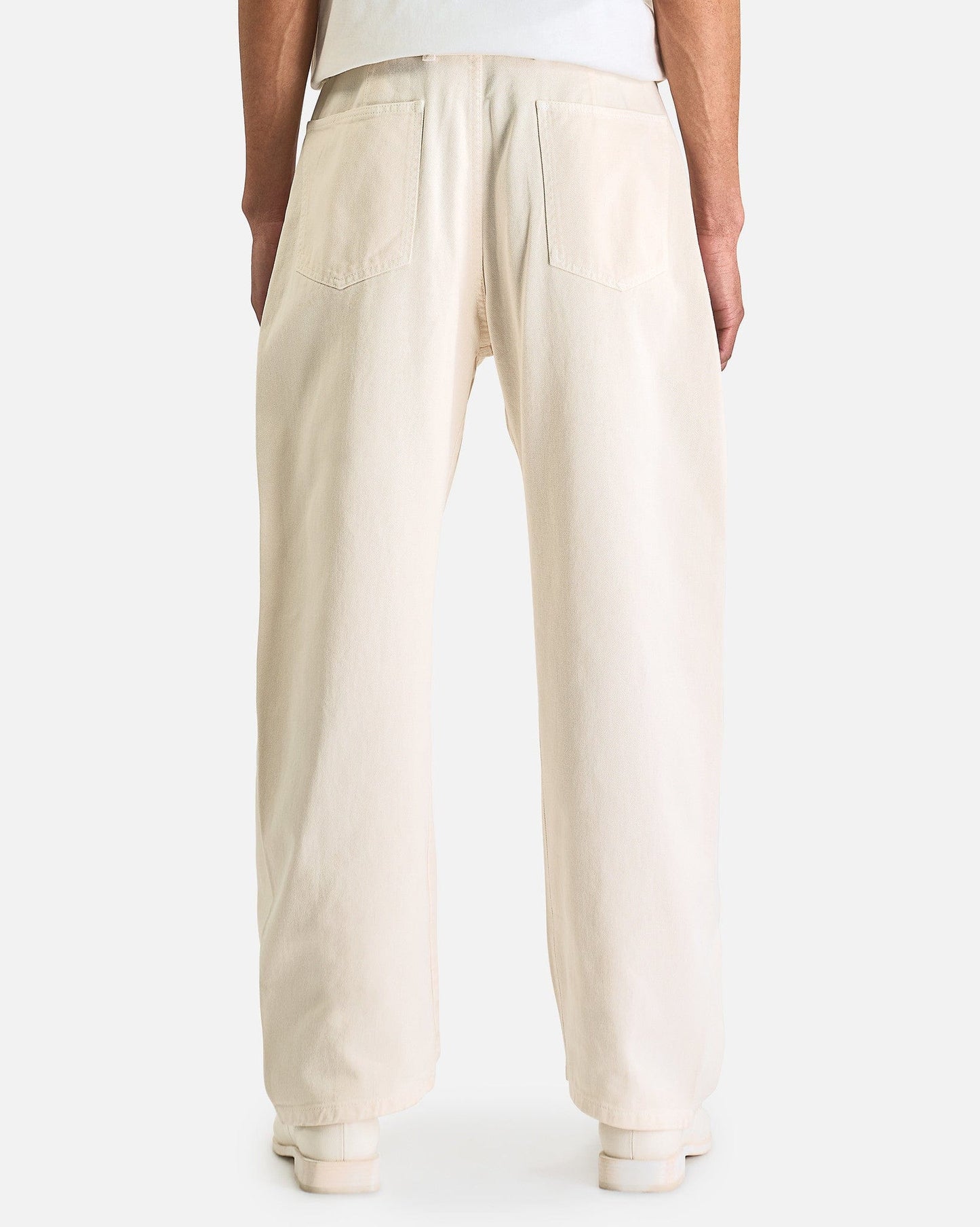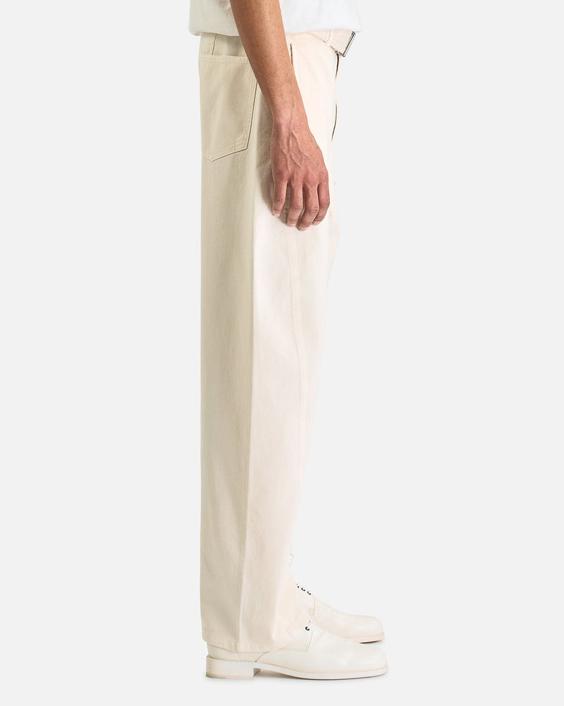 LEMAIRE Twisted Belted Pants in Snowy Off White. These pants are crafted from garment dyed cotton denim and features a zip fly and button closure, removable belt with metal buckle, 4-pocket styling, and twisted side seams giving the pant and shapely curve.