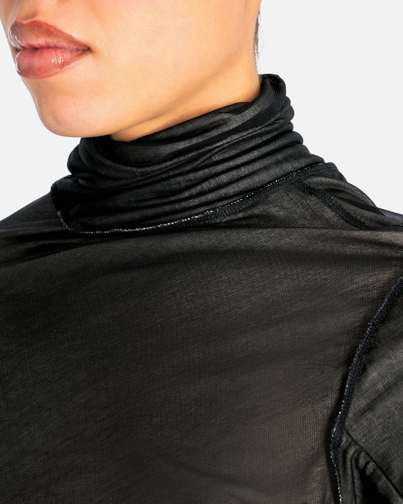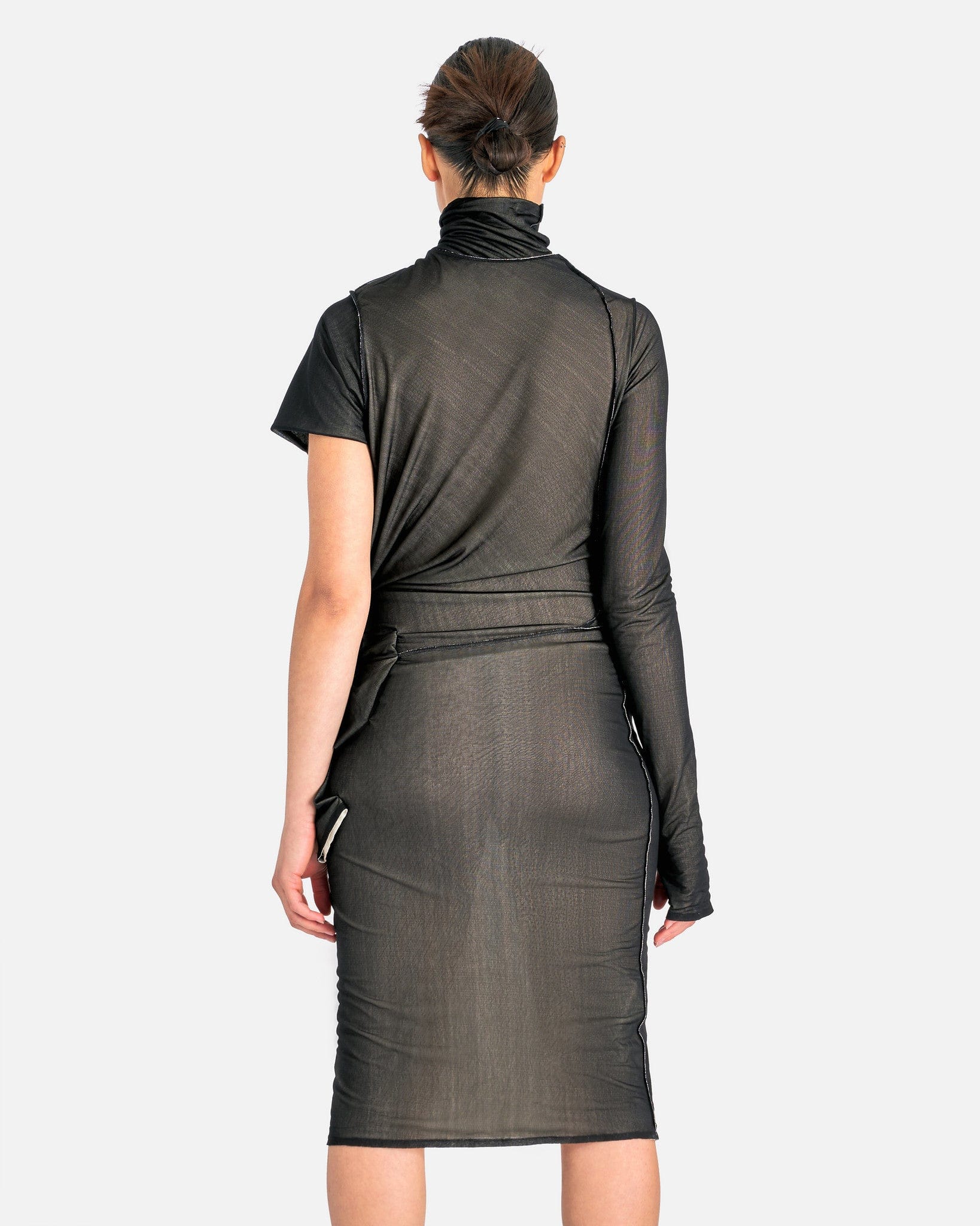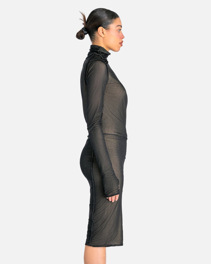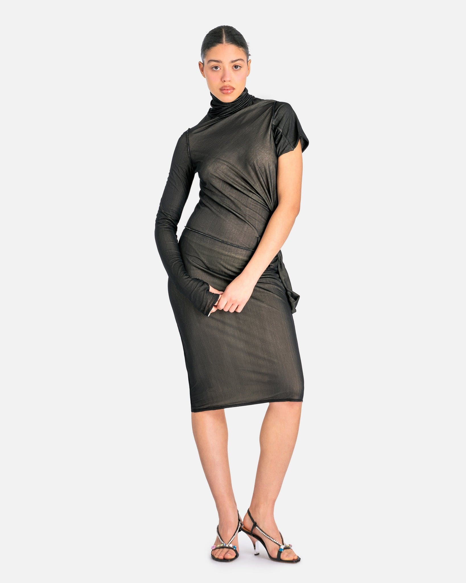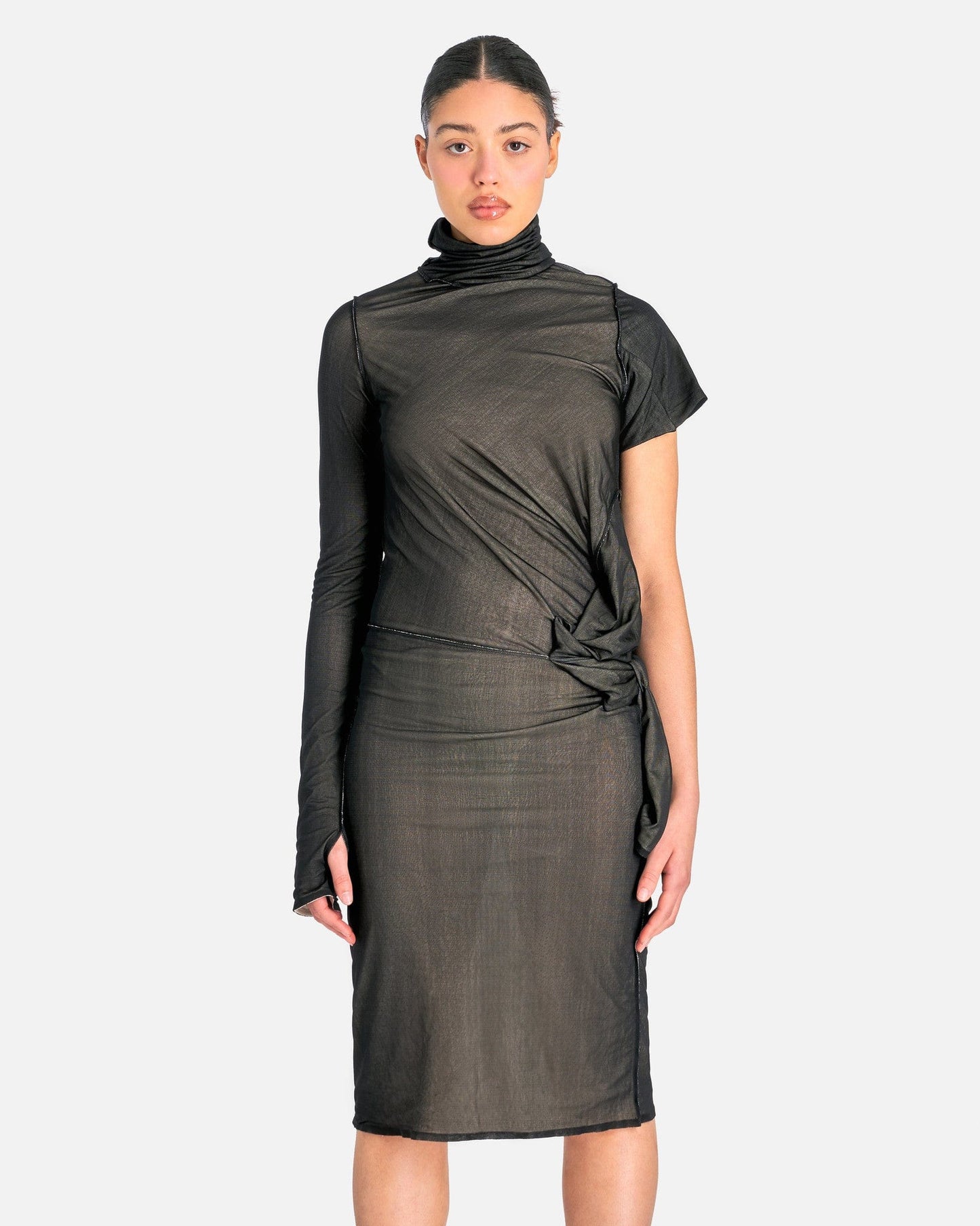 Maison Margiela Asymmetrical Midi Dress in Black/Butter. This asymmetric dress features exposed seams, a high-neck, loose threading throughout and ruching detail at the side.