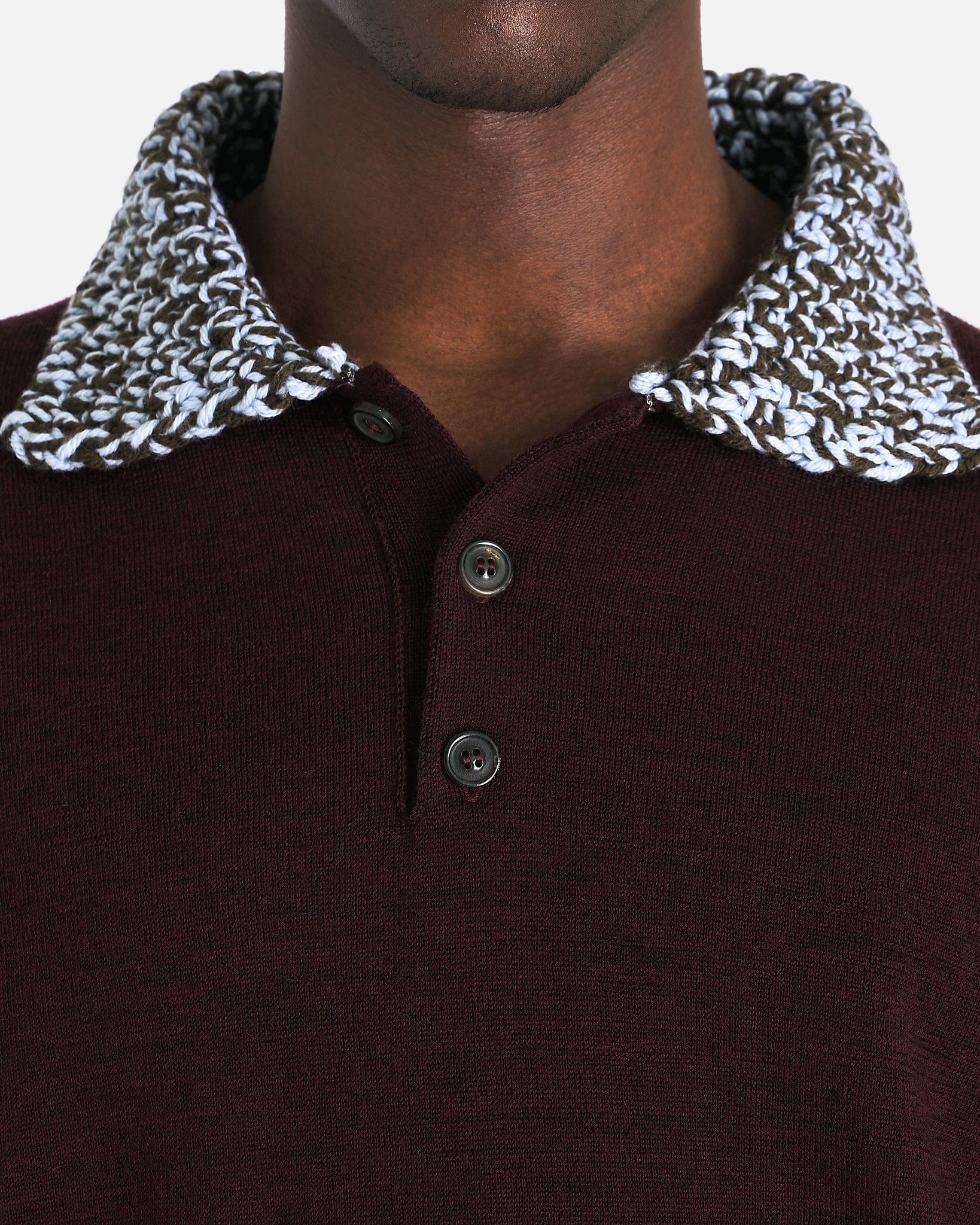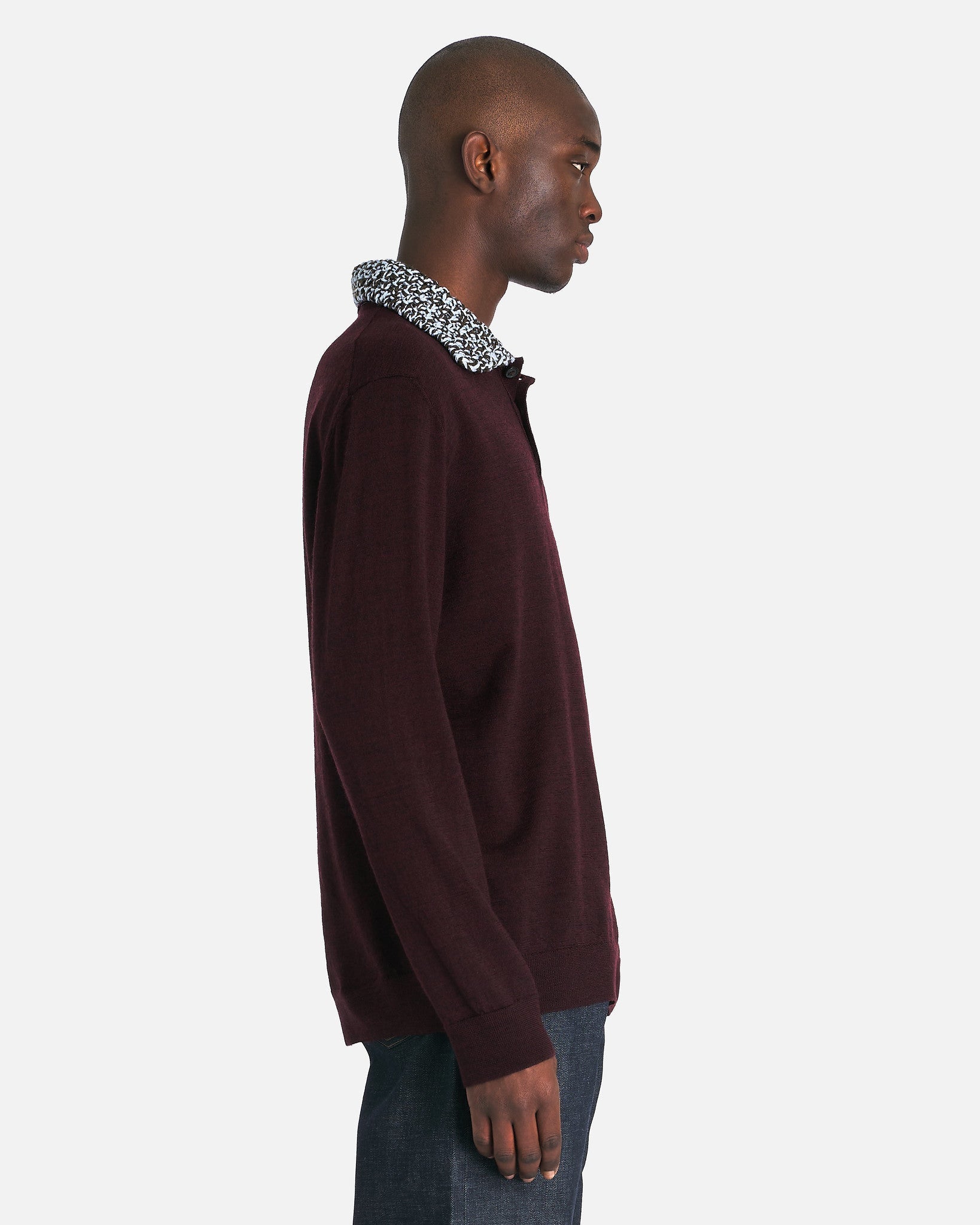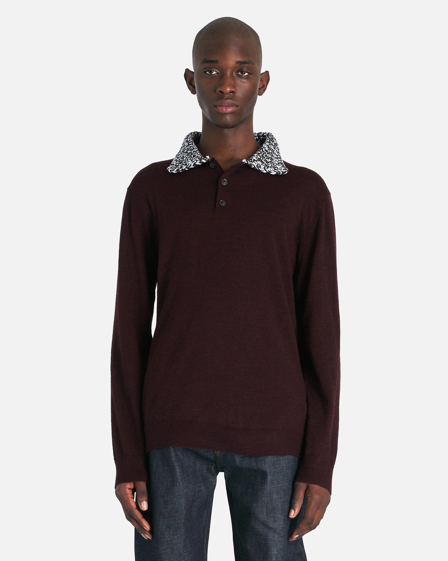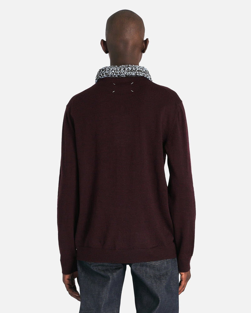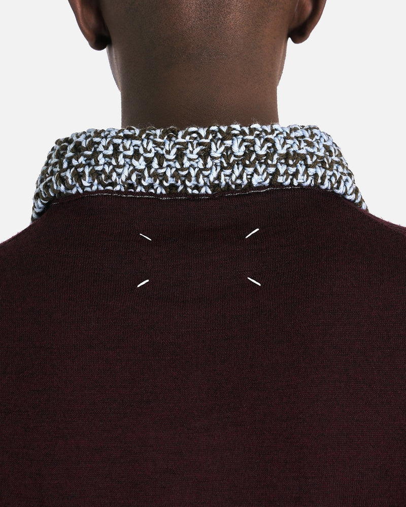 Maison Margiela Chunky Detail Knit Polo Shirt in Burgundy. This polo shirt features a knit collar, ribbed cuffs and hem, button closure at the neck and the prominent 4-stitch signature at the back.
