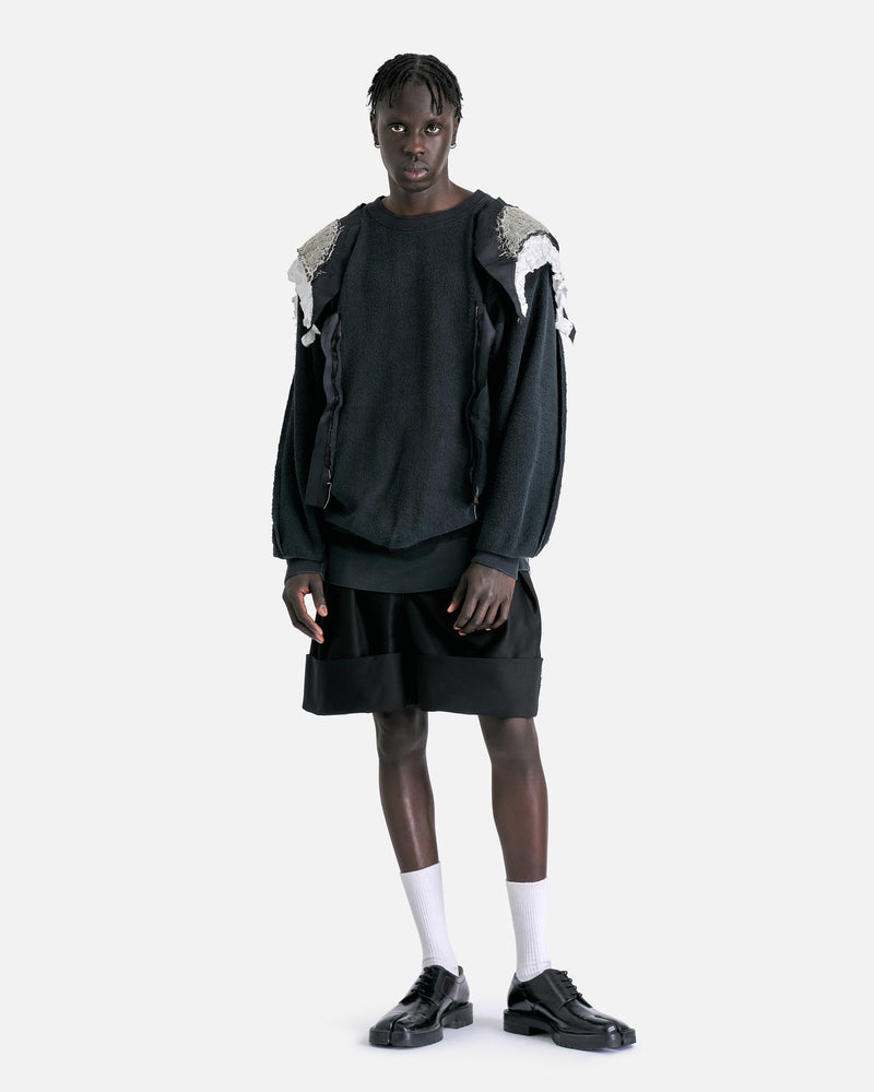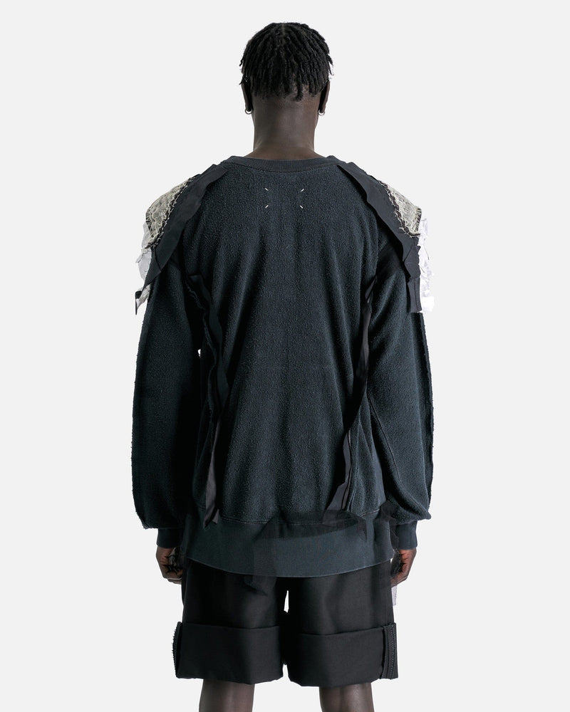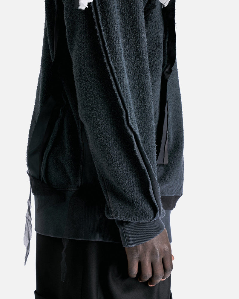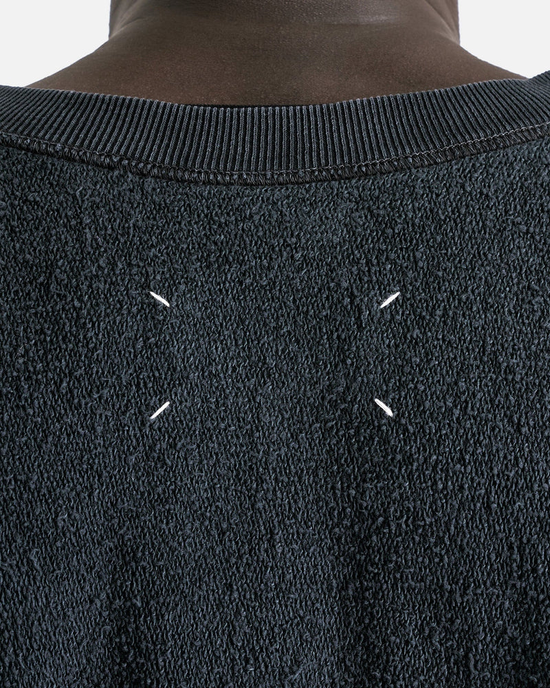 Maison Margiela Inside-Out Spliced Cotton Fleece Sweatshirt in Charcoal. This sweatshirt features an inside-out design, decorative appliques, rib knit collar and wide rib knit cuffs and hem, side pocket inserts and the prominent 4-stitch signature on the back.