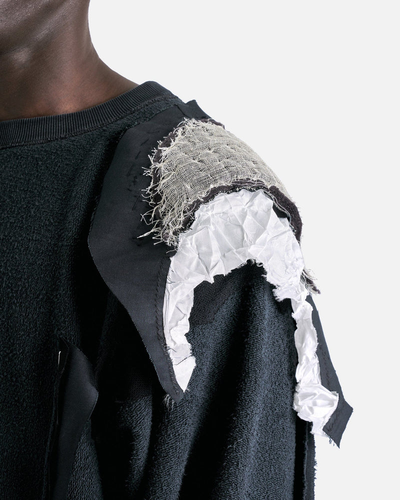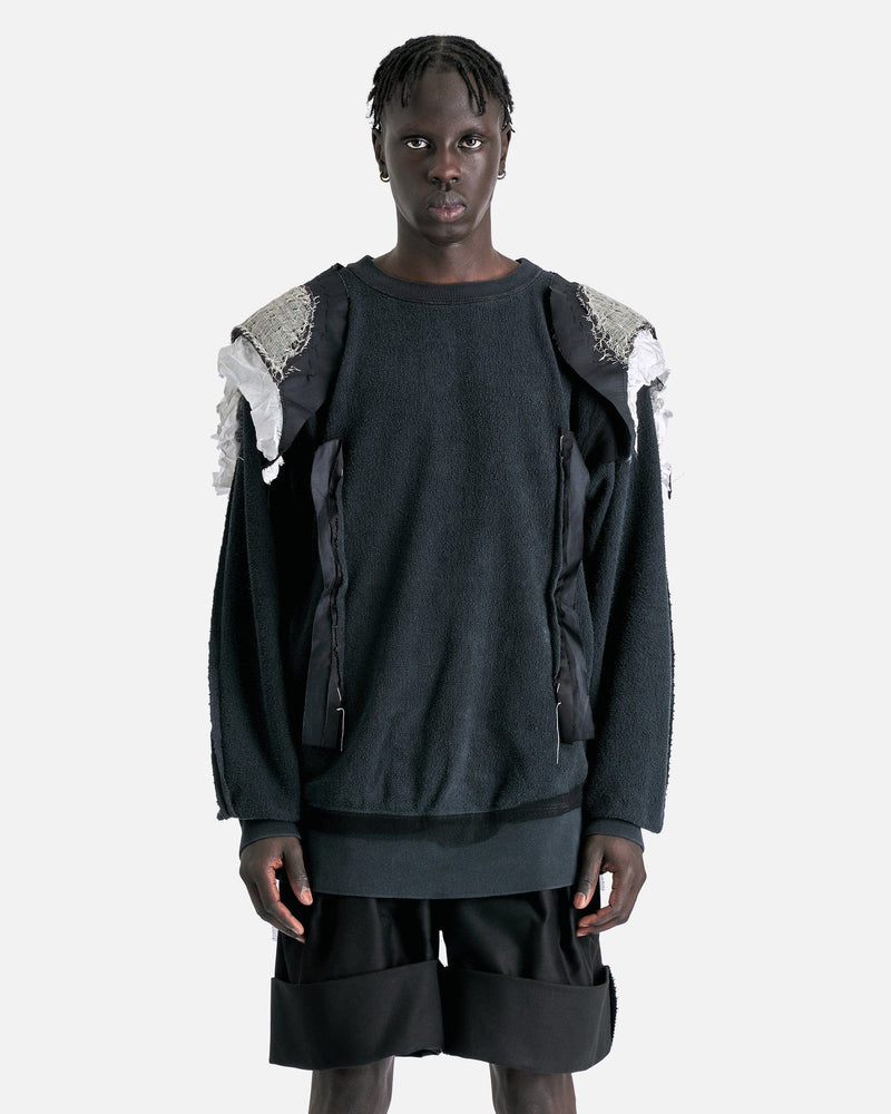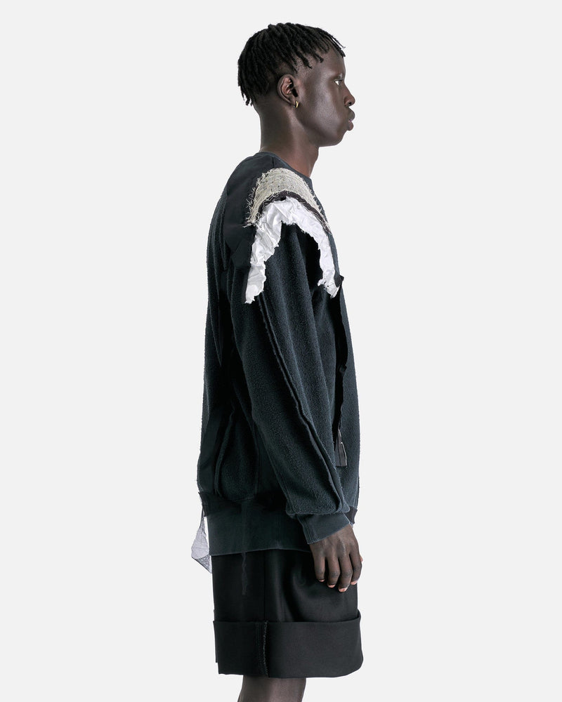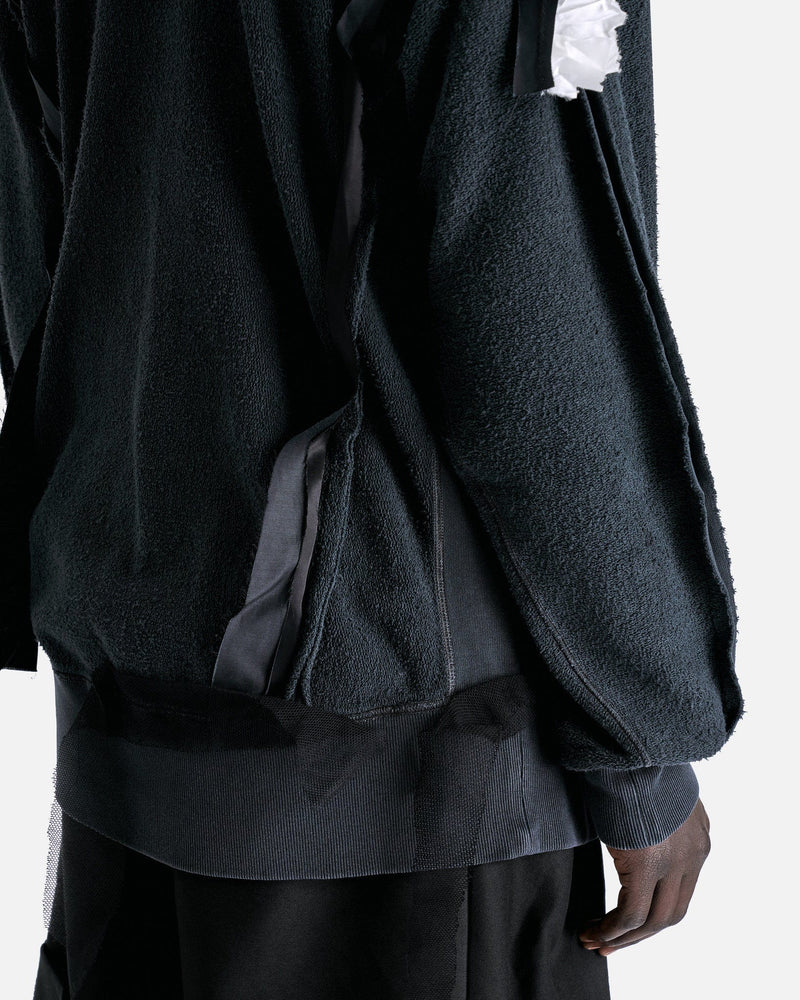 Maison Margiela Inside-Out Spliced Cotton Fleece Sweatshirt in Charcoal. This sweatshirt features an inside-out design, decorative appliques, rib knit collar and wide rib knit cuffs and hem, side pocket inserts and the prominent 4-stitch signature on the back.
