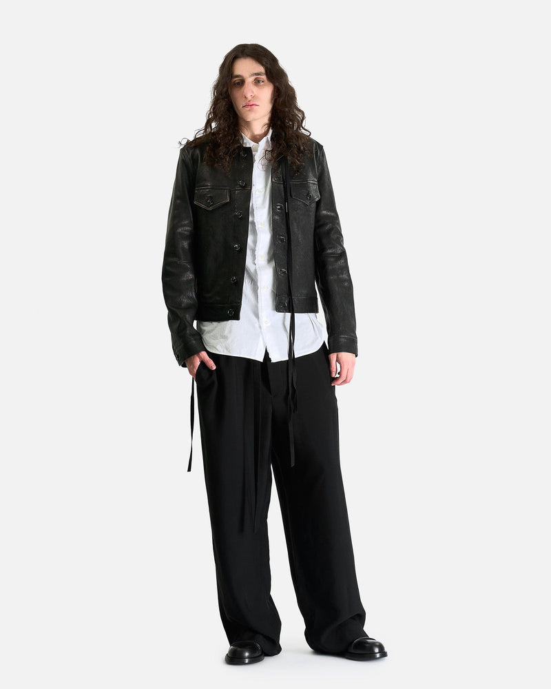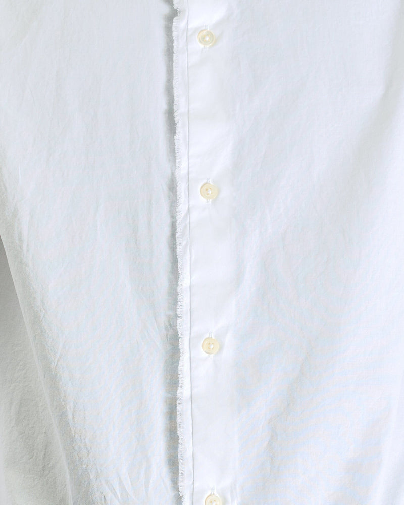 Ann Demeulemeester Haaken Shirt in White. This dress shirt features a classic collar, front button closure, raw edge placket on front, button cuffs and a curved hem.