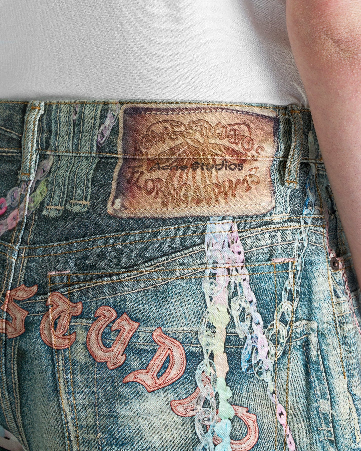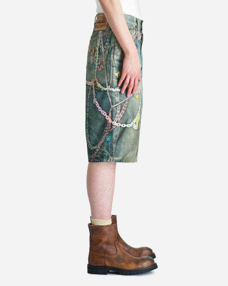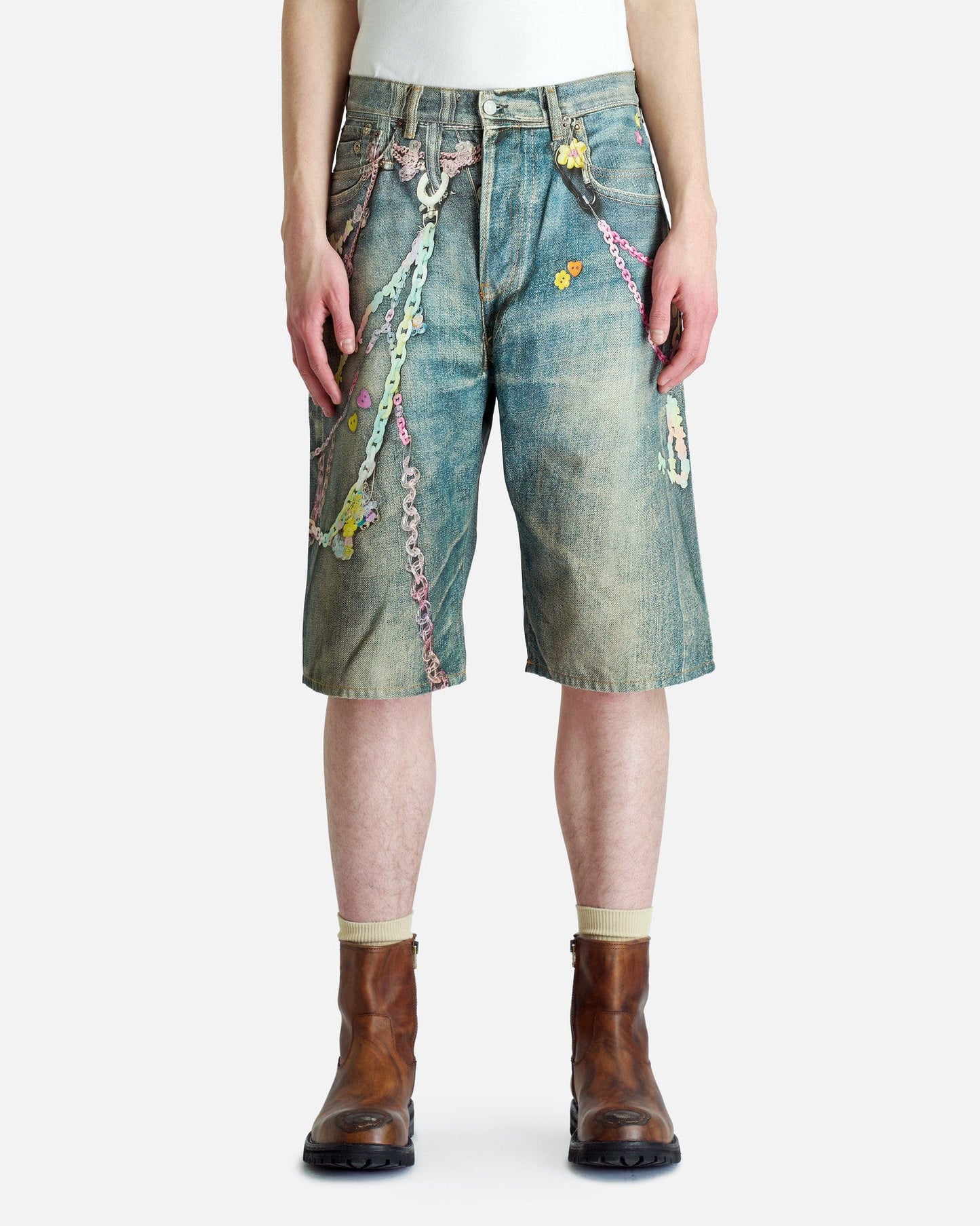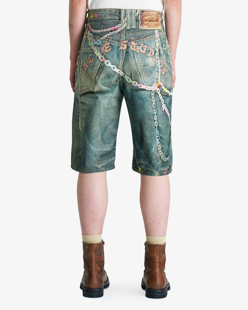 Acne Studios Keychain Shorts in Mid Blue. These shorts are crafted form a non-stretch denim and feature a 'keychains' trompe l'oeil print, button fly, 5-pocket styling and is knee length.