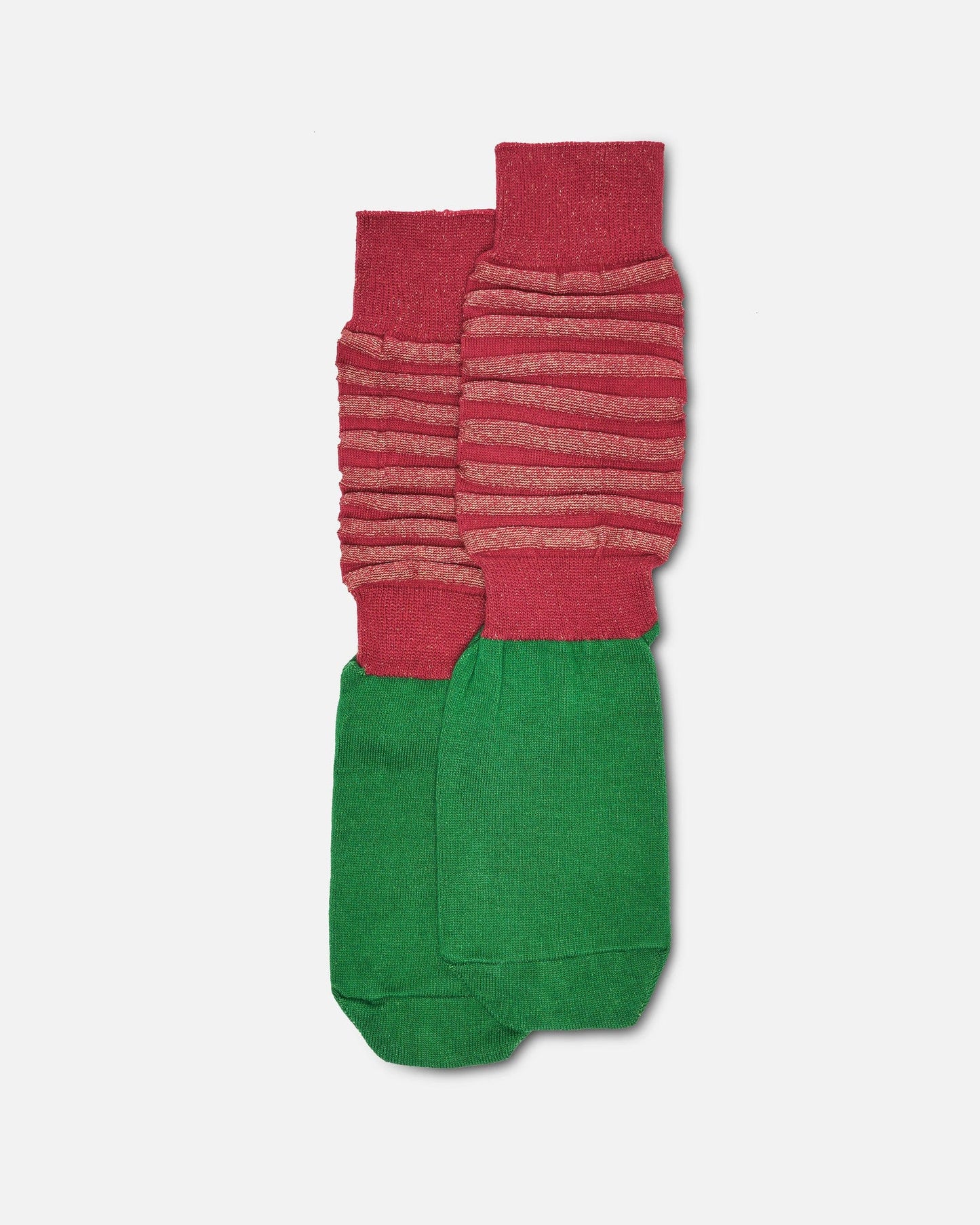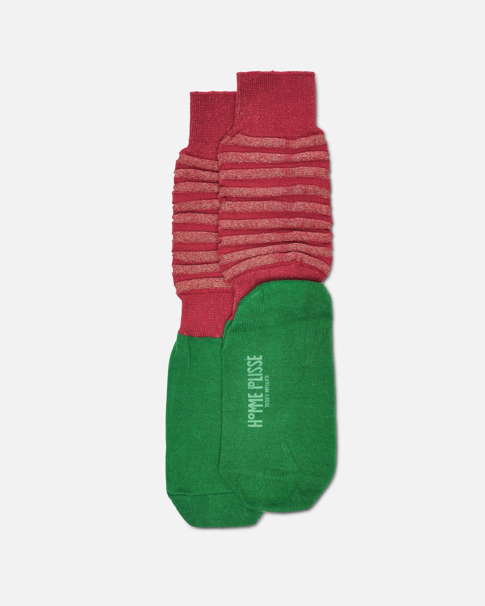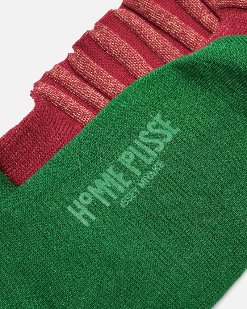 Homme Plissé Issey Miyake Fruitful Socks in Apple. These two-tone socks have a mid-rise fit, ribbed cuff, a banded tube design and the Homme Plissé Issey Miyake logo printed on the bottom.