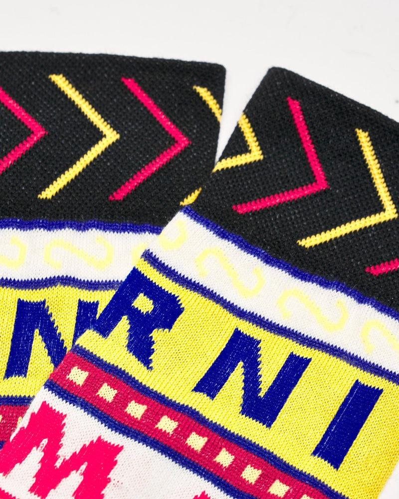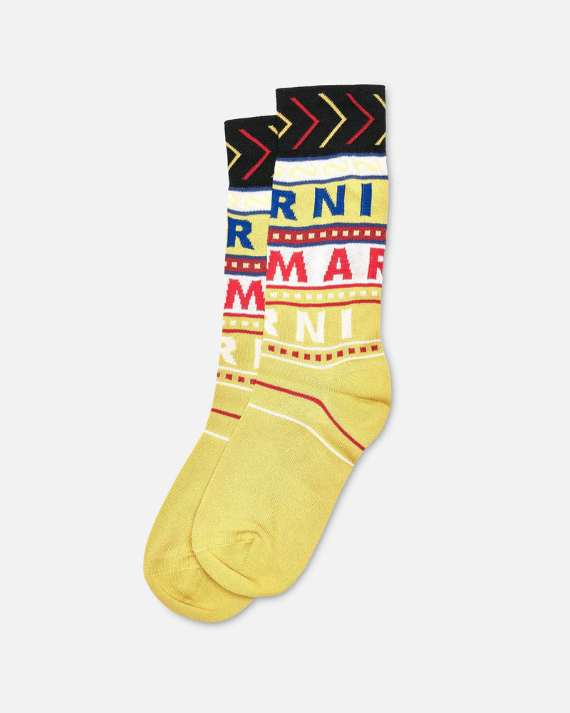 Marni men's jacquard print logo socks in yellow. These socks are mid-calf length and feature a repeat logo pattern throughout the body.