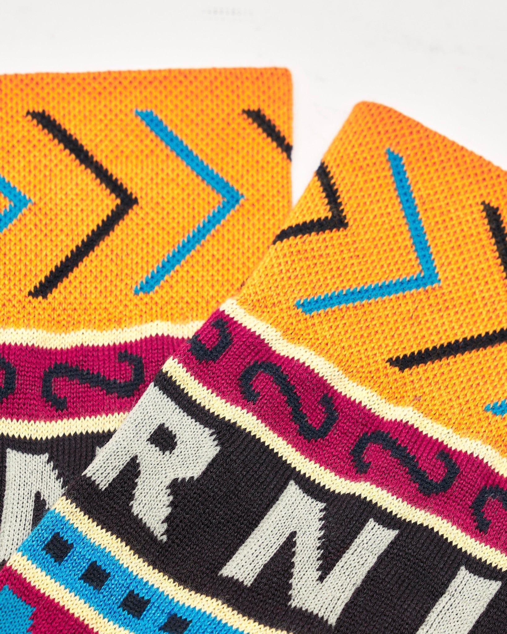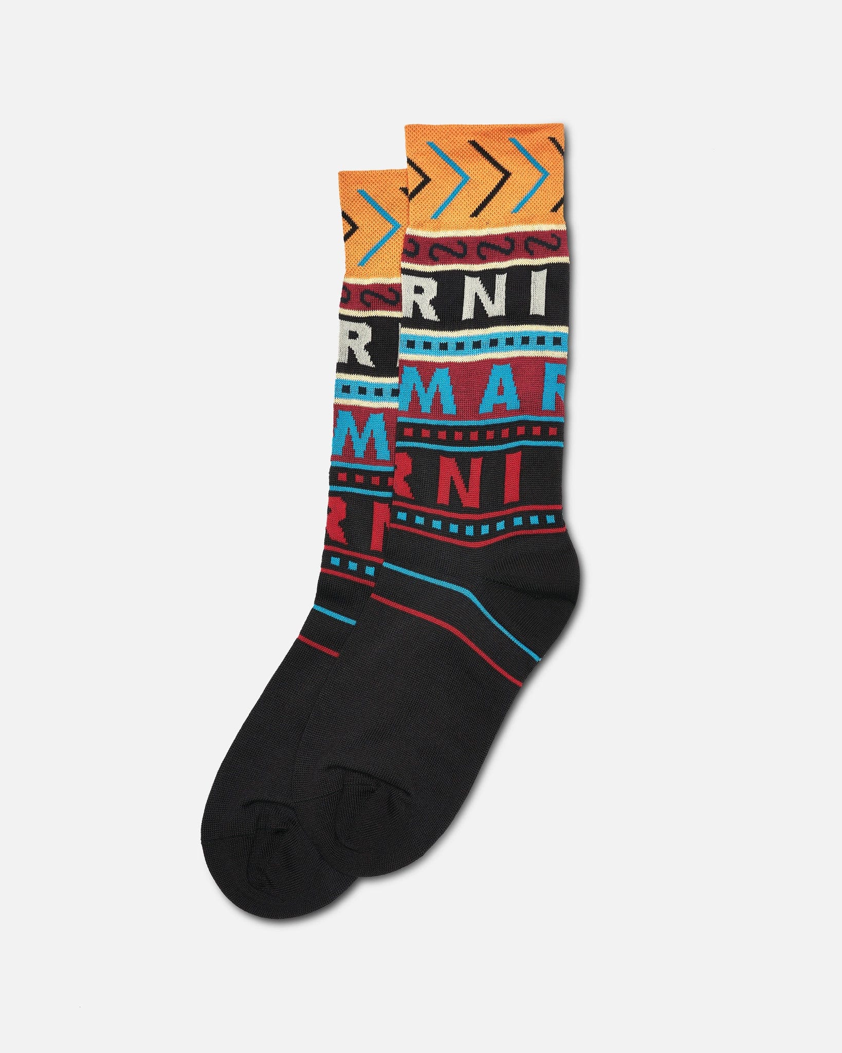 Marni men's jacquard print logo socks in brown. These socks are mid-calf length and feature a repeat logo pattern throughout the body.