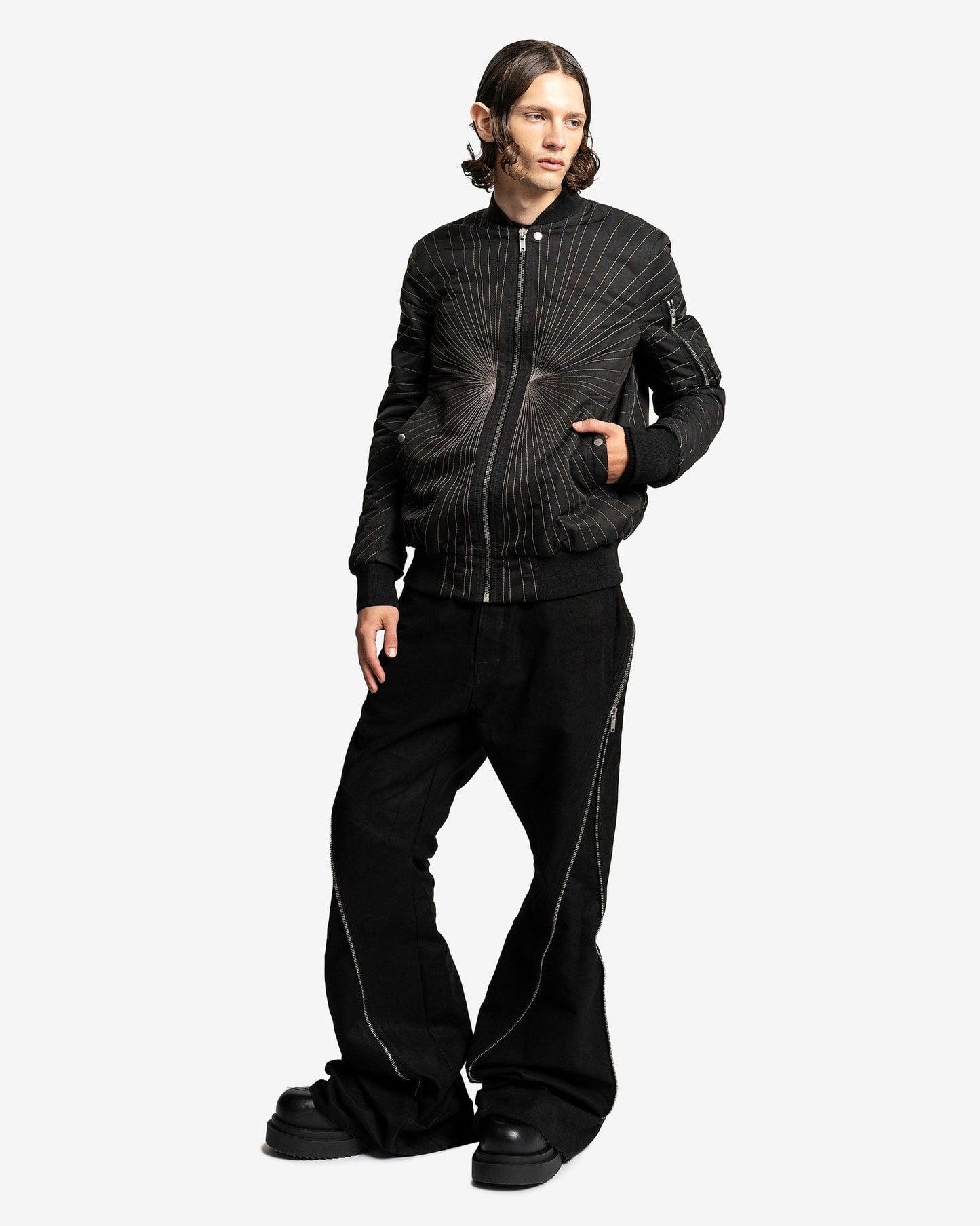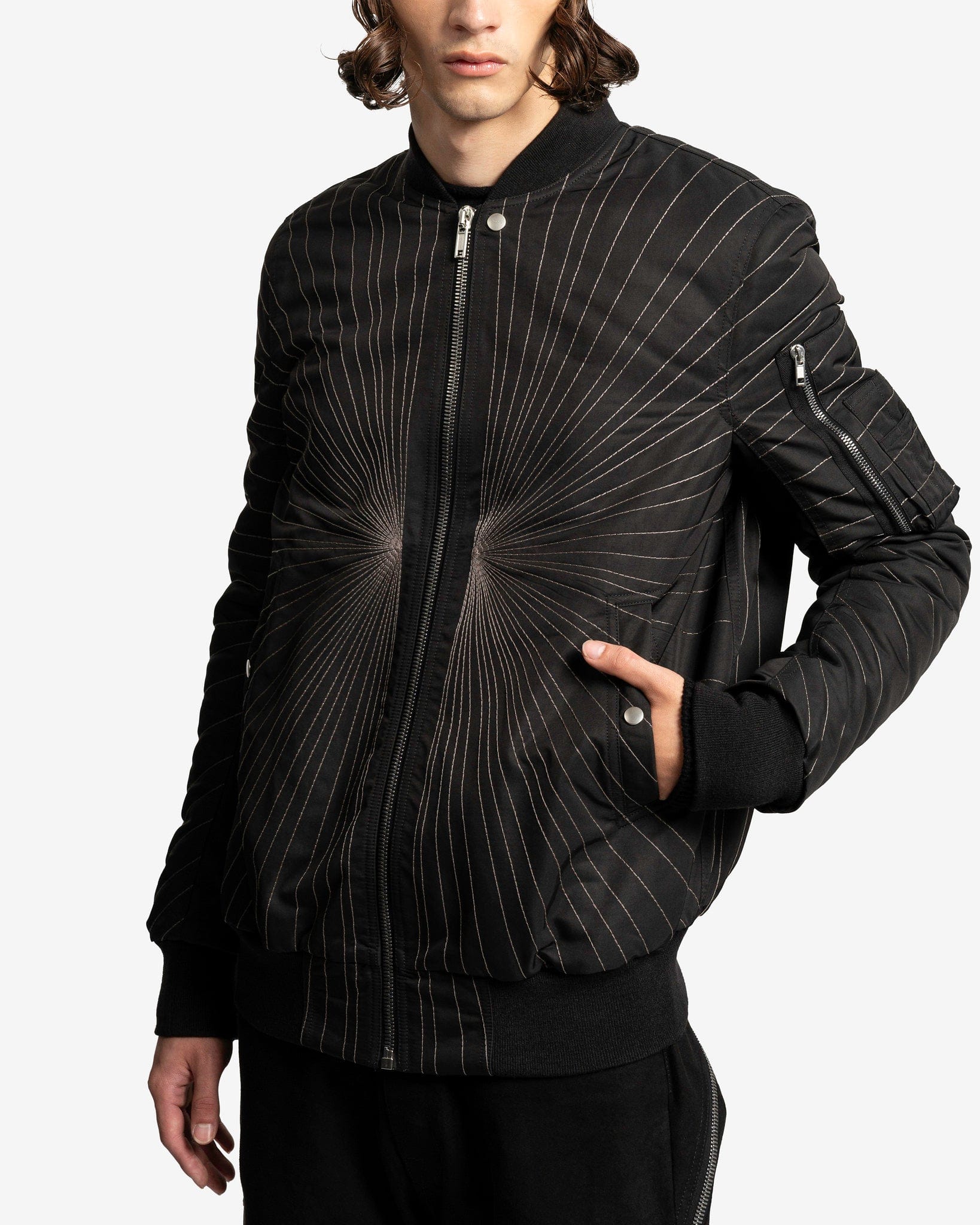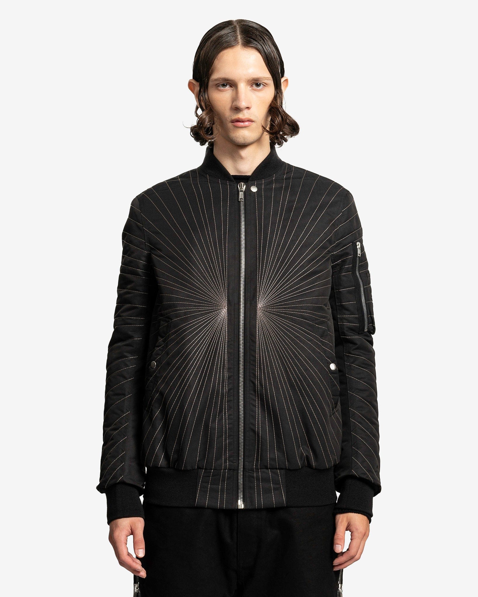 Rick Owens FW23 Luxor men's embroidered flight jacket in black. This bomber style jacket has a shawl collar, elasticated hem and cuffs, sun-burst like embroidery and a zip pocket on the left sleeve.