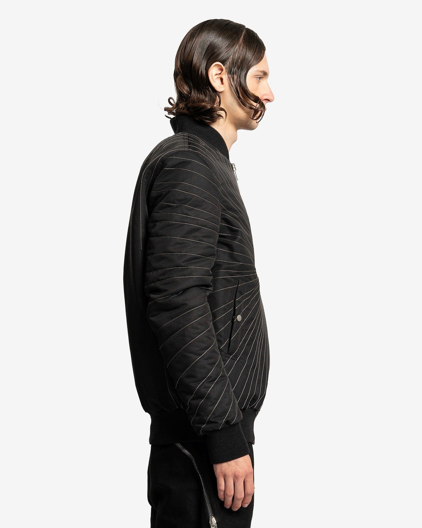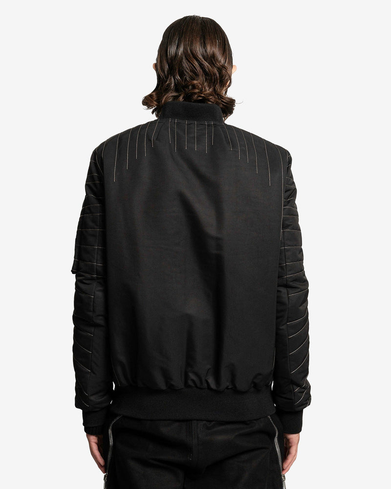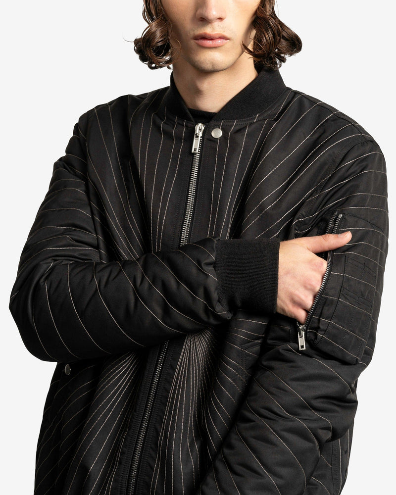 Rick Owens FW23 Luxor men's embroidered flight jacket in black. This bomber style jacket has a shawl collar, elasticated hem and cuffs, sun-burst like embroidery and a zip pocket on the left sleeve.