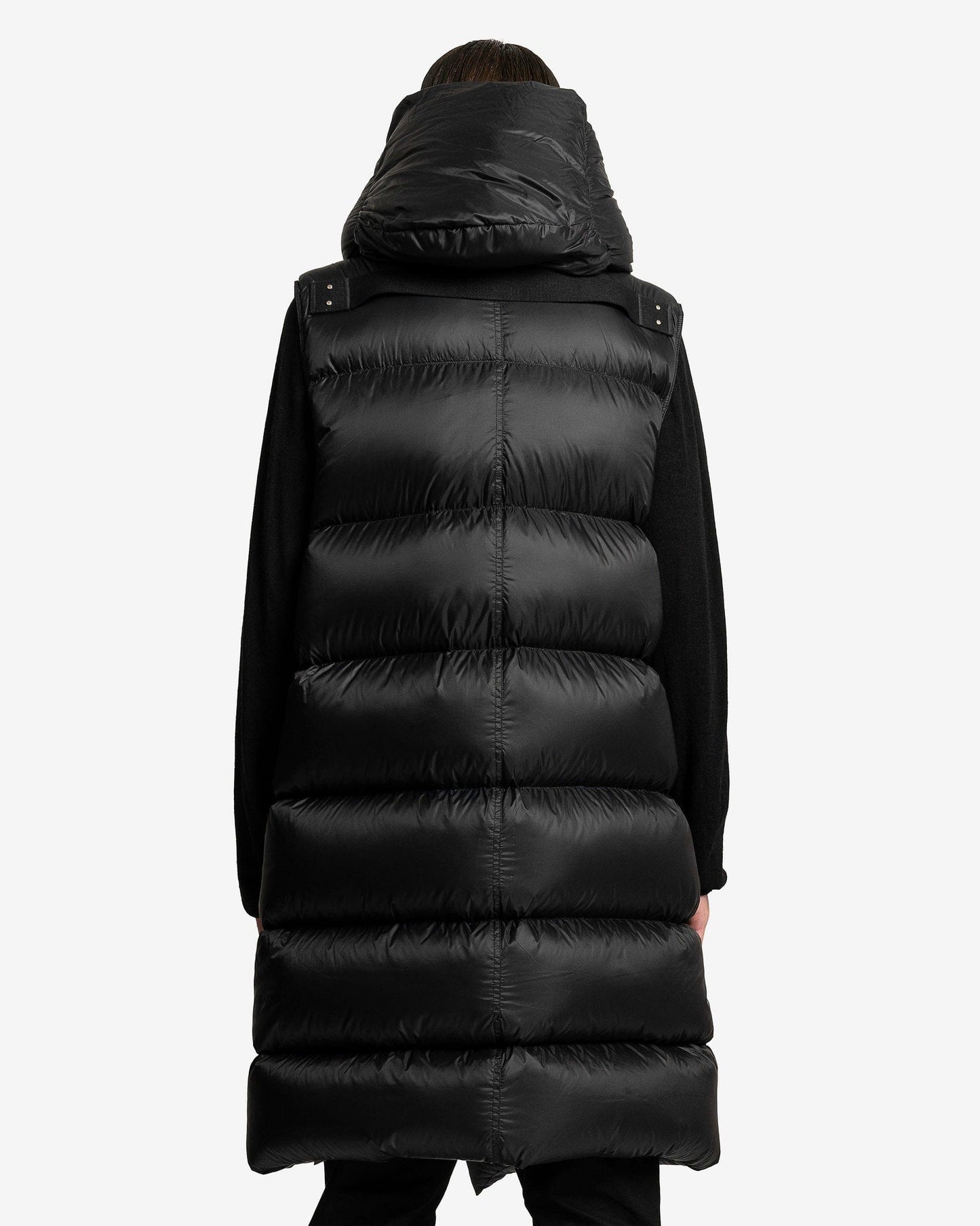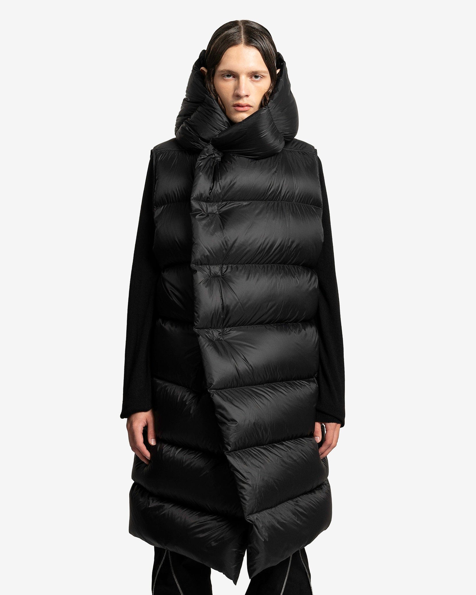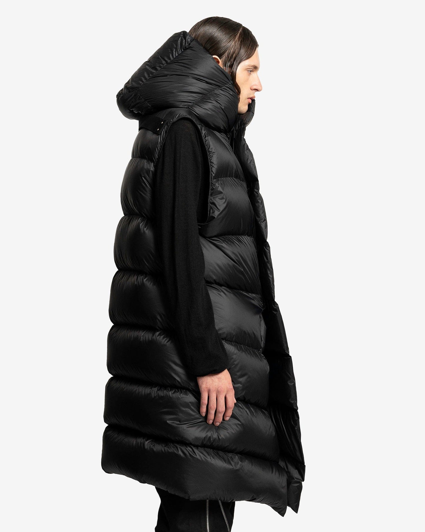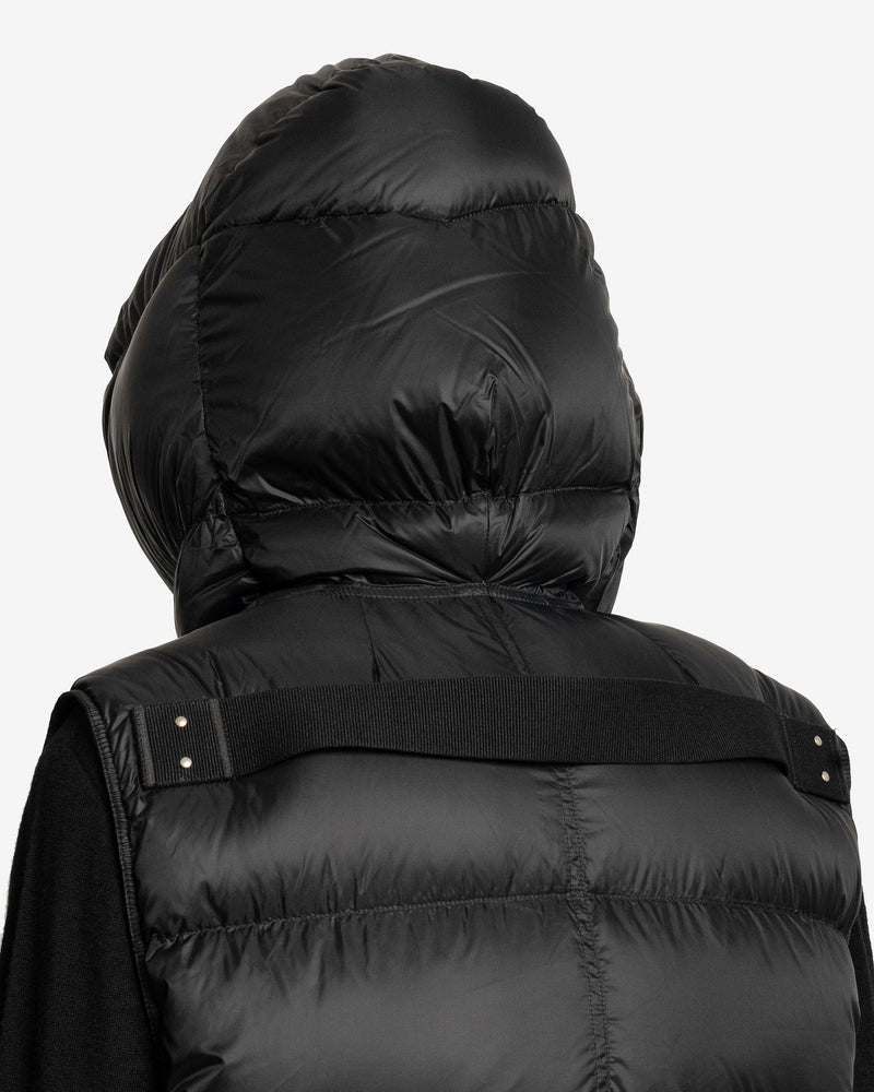 Rick Owens FW23 Luxor men's hooded puffer vest. This lightweight jacket is made of quilted nylon taffeta. It uses offset front stud button closure that is concealed. There are welt pockets at the sides and zip pockets on the interior.