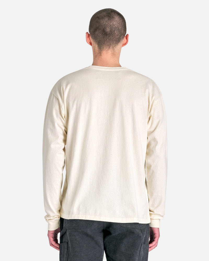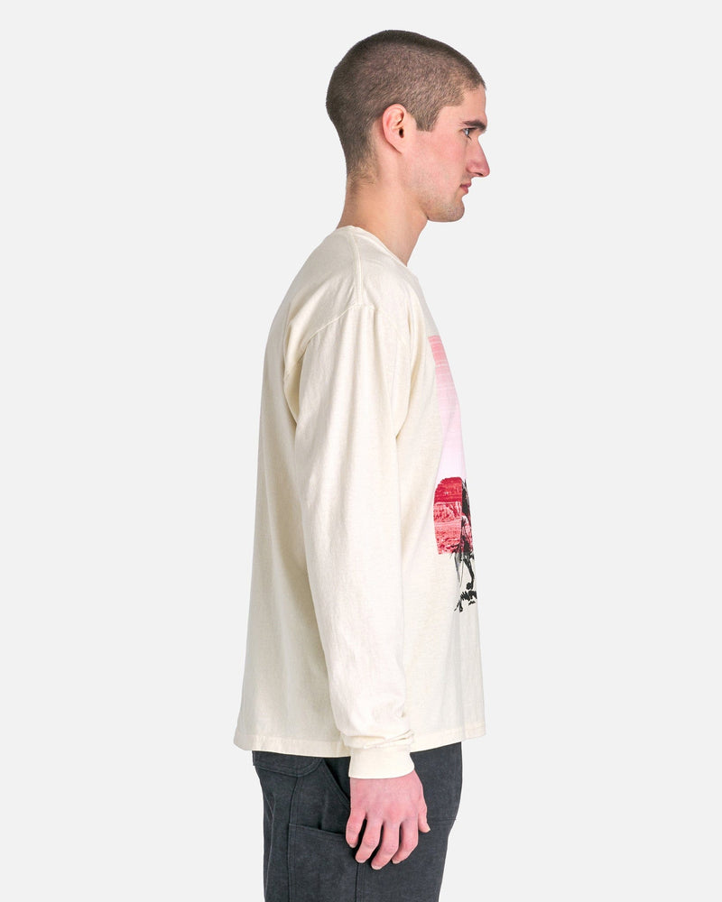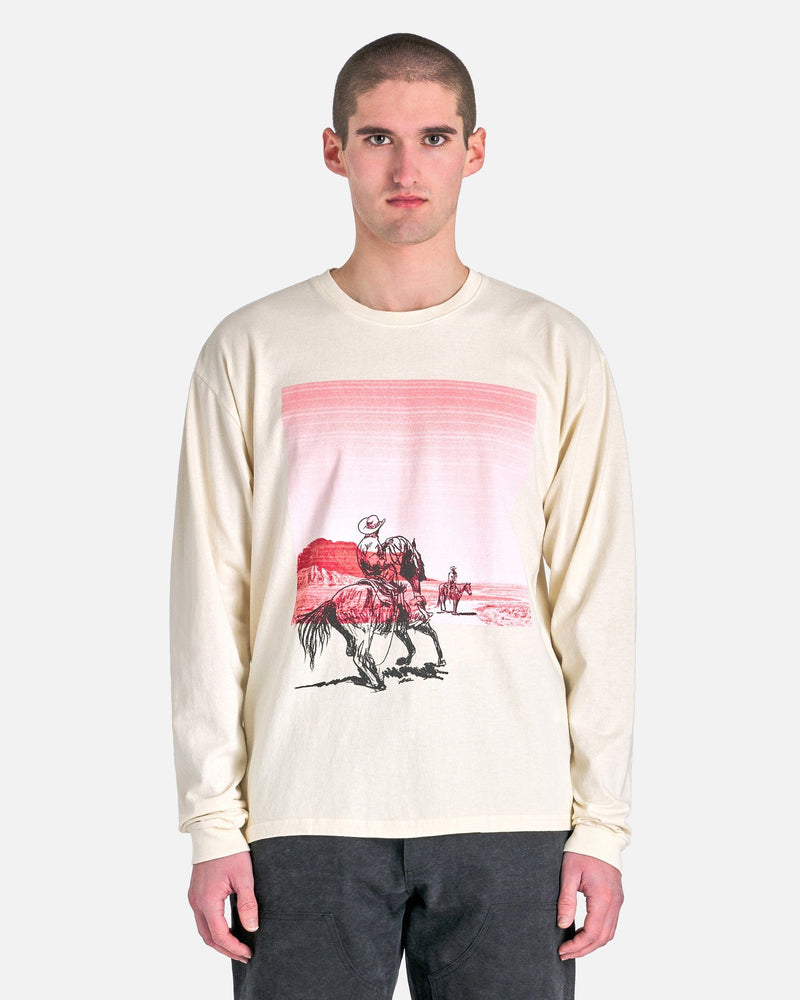 One of These Days men's graphic long sleeve t-shirt in off-white. This shirt features a graphic of cowboys on the beach at the front.