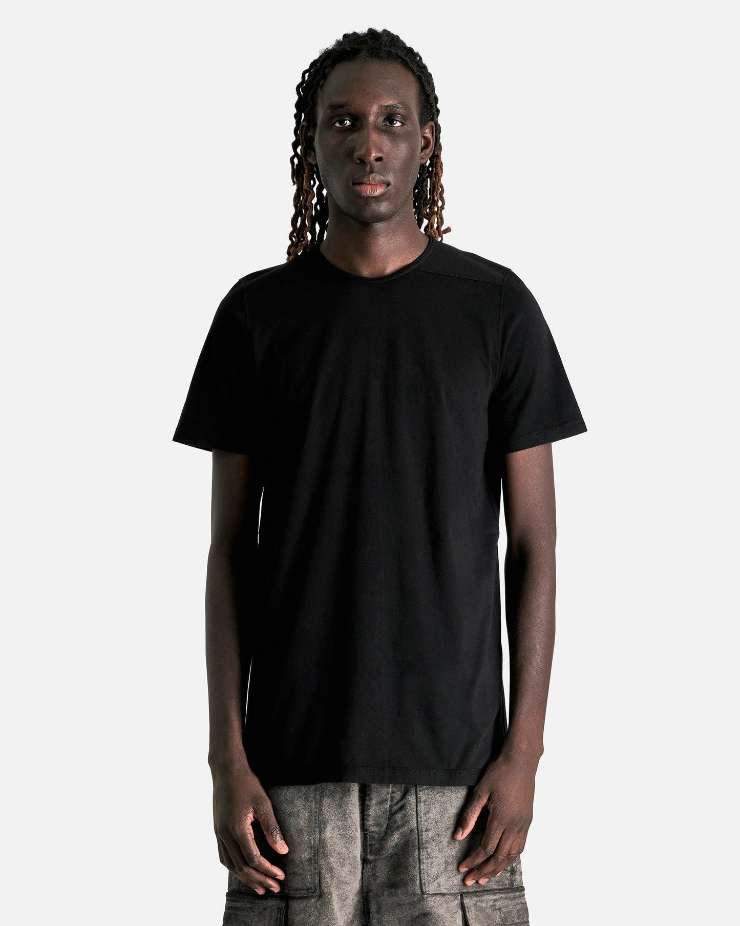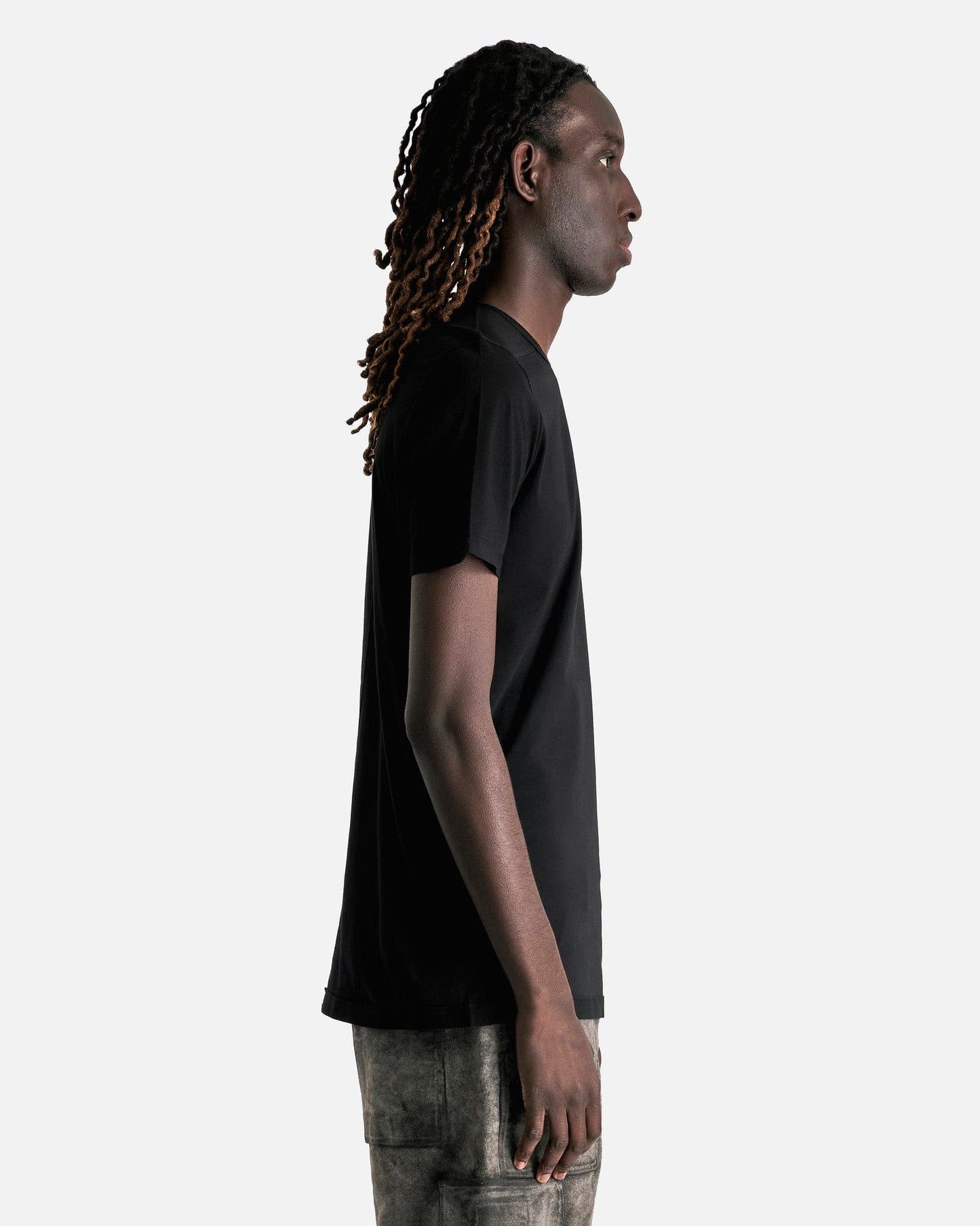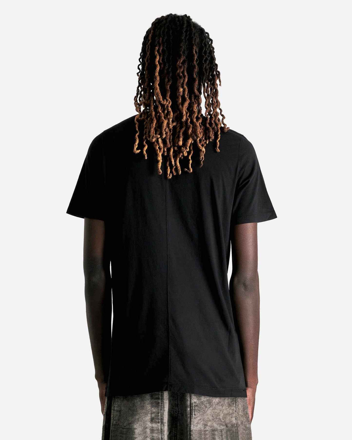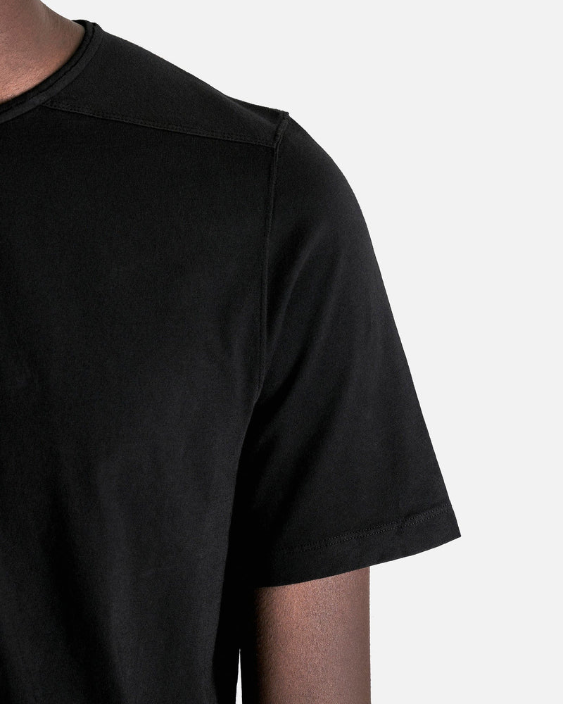 Rick Owens DRKSHDW Level T in Black. This shirt features a rolled rib knit crewneck, signature level shoulder seams, center seam down the spine and a straight hem.