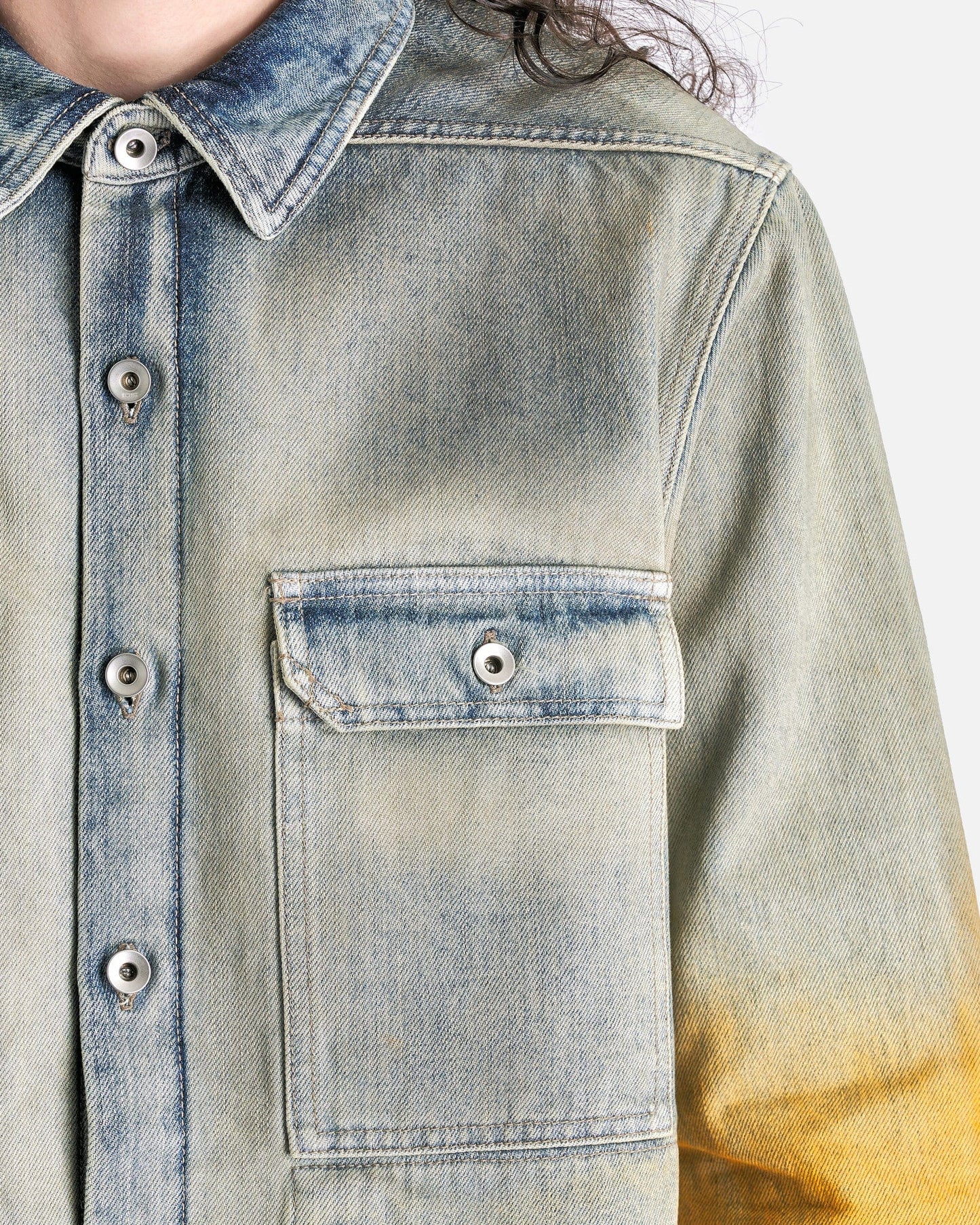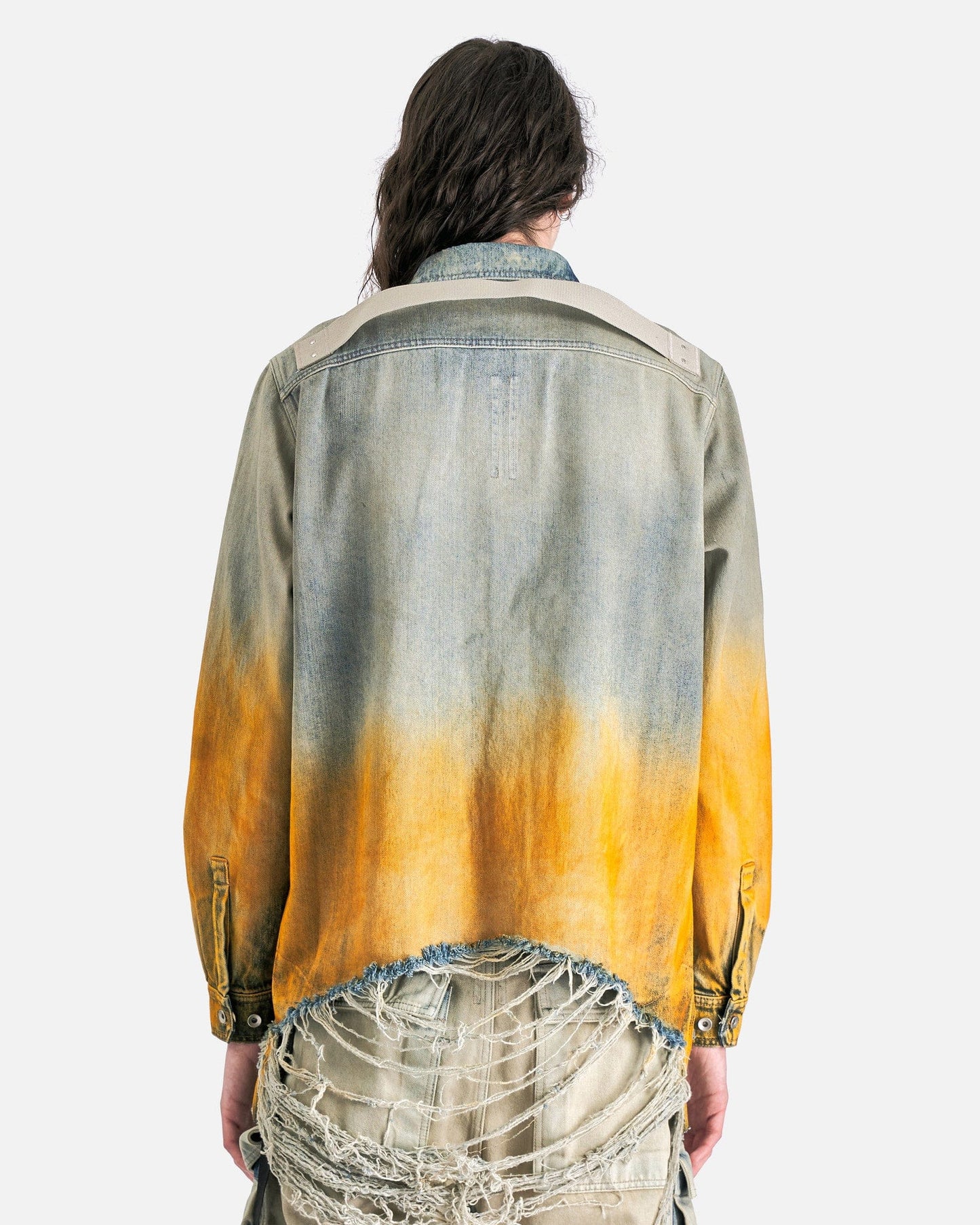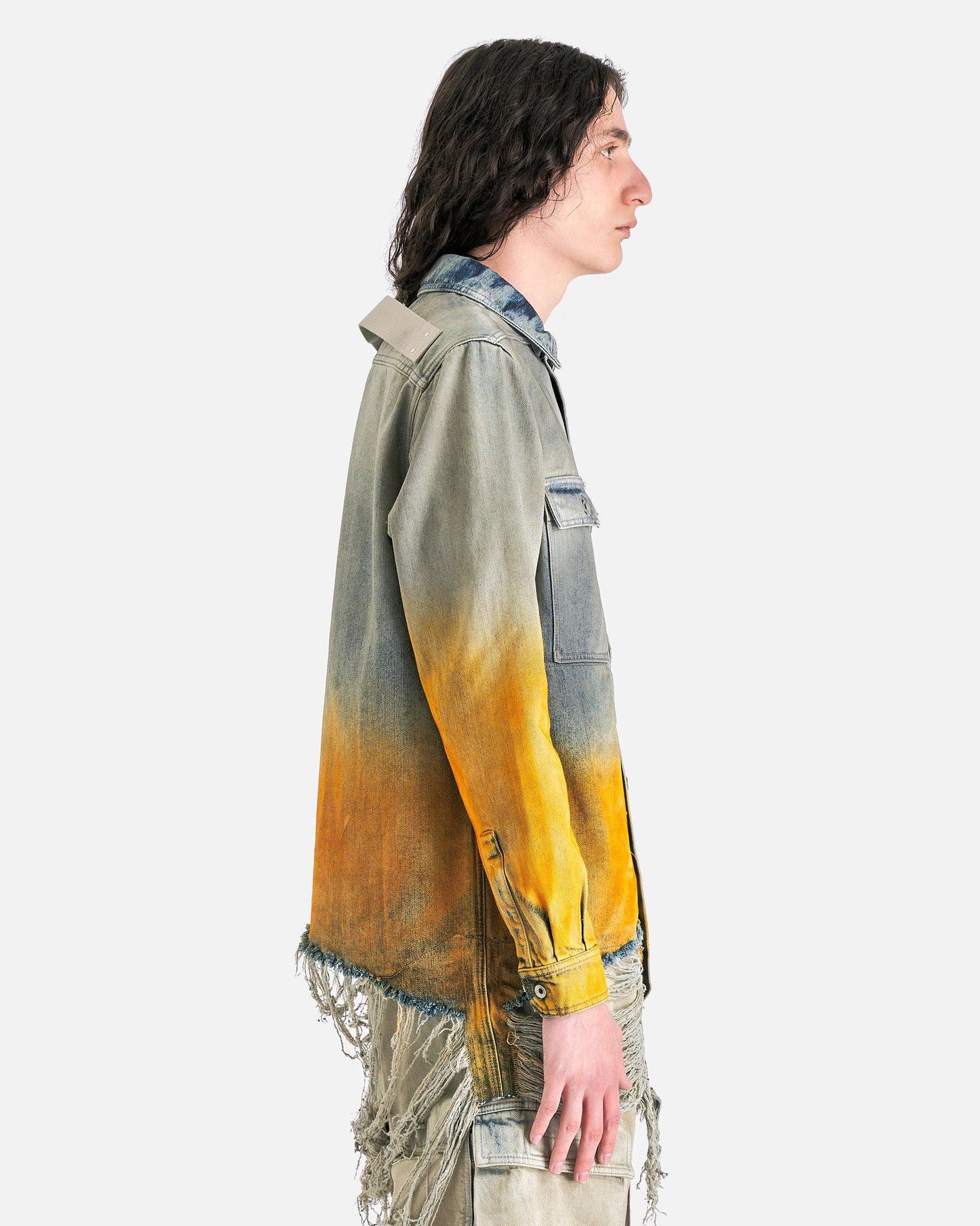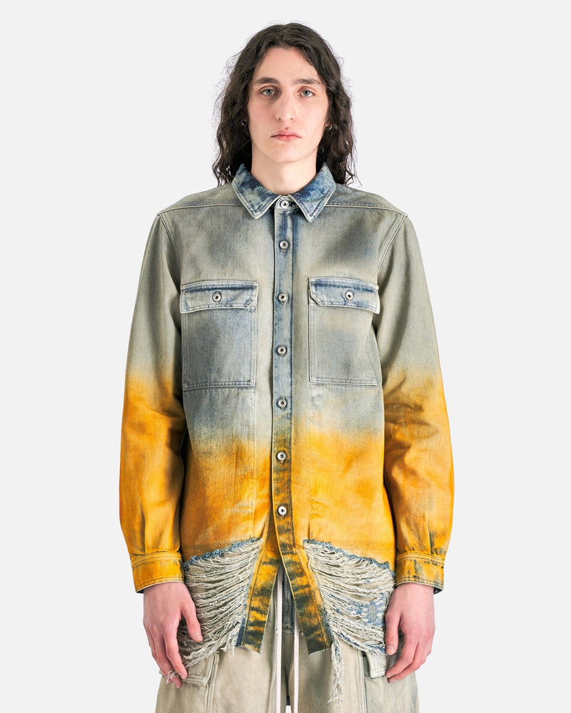Rick Owens DRKSHDW Outershirt in Sky/Orange Degrade. This outershirt features a classic collar, center placket with metal button closure, two chest pockets with button fastening, cotton webbing strap on the back yoke, frayed and distressed bottom hem and single buttoned cuffs. This outershirt is stone washed with degrade mineral coloration while the orange color is hand sprayed on the fabric. The frayed distressed detailing is laser treated and artisanally handworked.