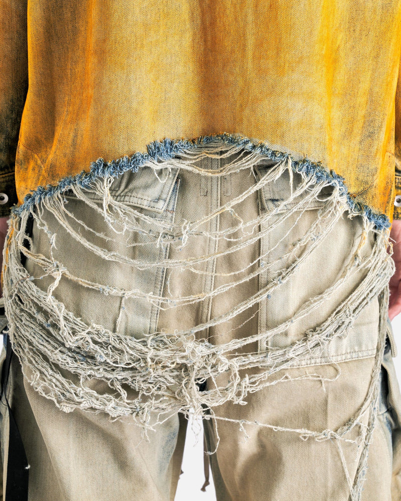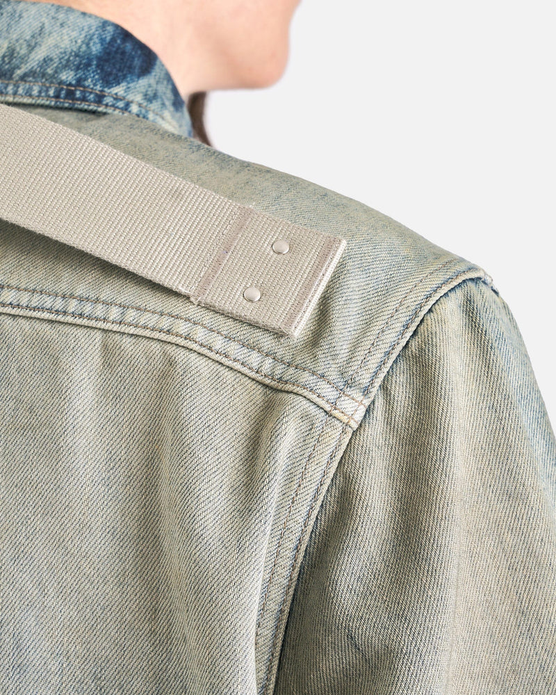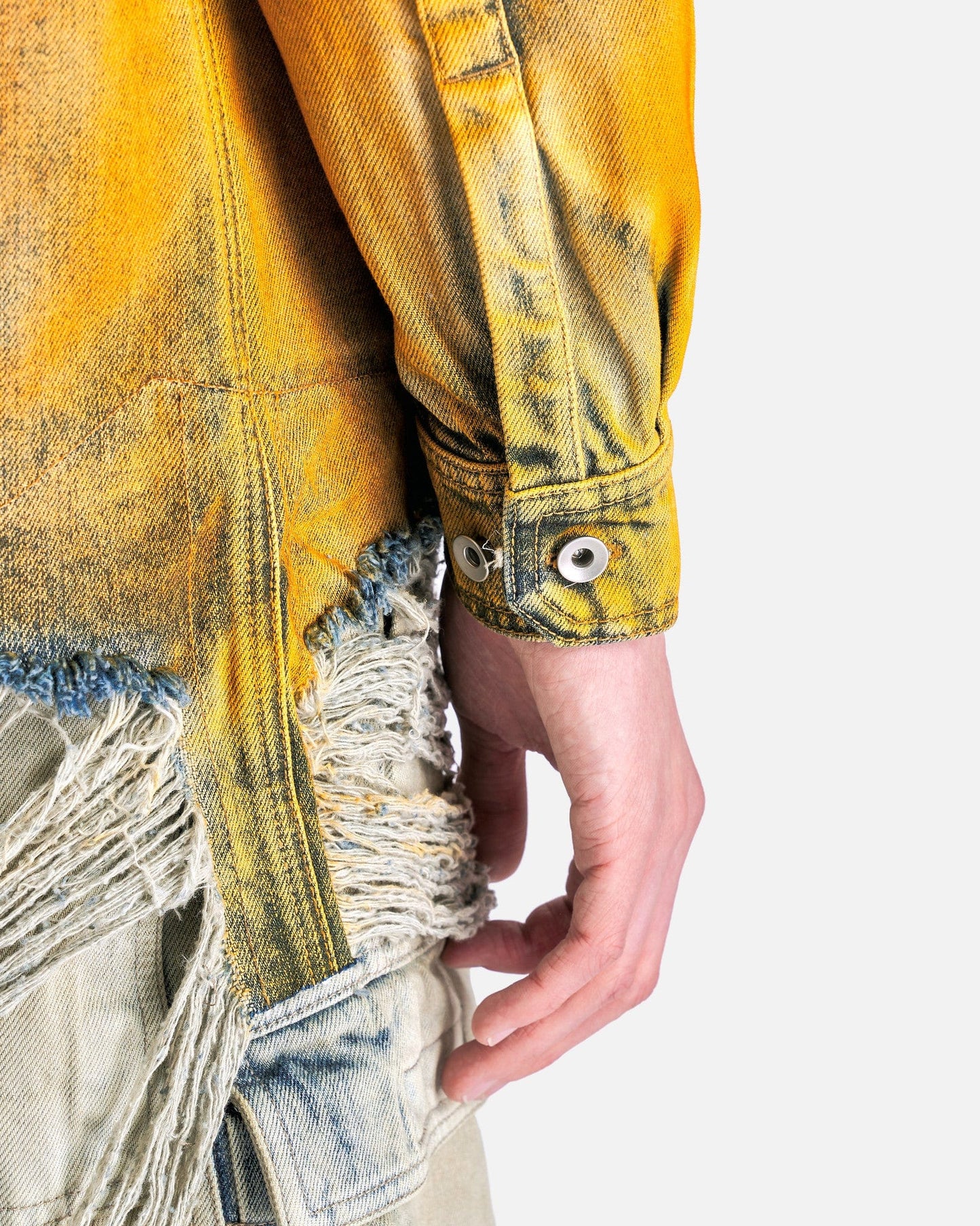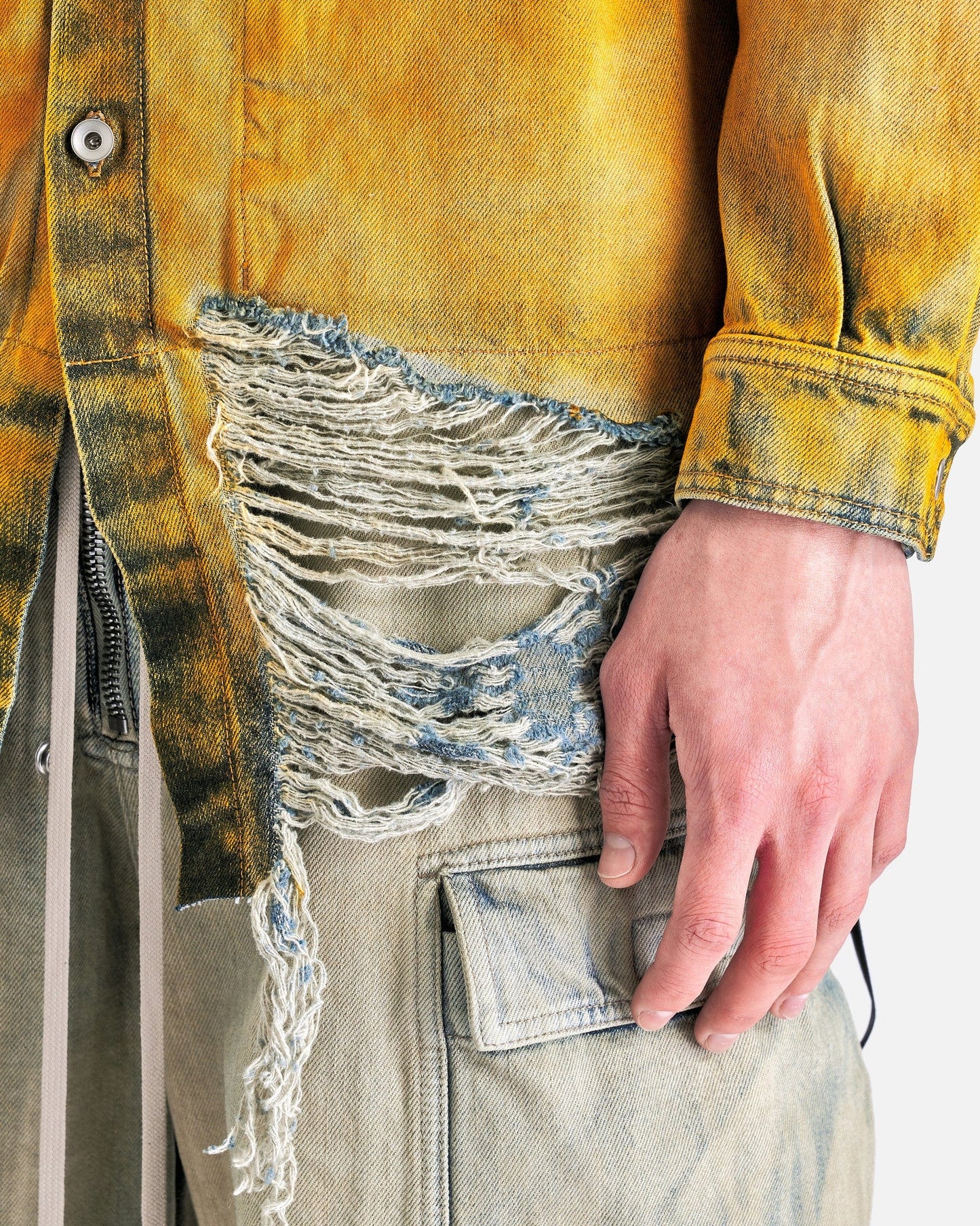 Rick Owens DRKSHDW Outershirt in Sky/Orange Degrade. This outershirt features a classic collar, center placket with metal button closure, two chest pockets with button fastening, cotton webbing strap on the back yoke, frayed and distressed bottom hem and single buttoned cuffs. This outershirt is stone washed with degrade mineral coloration while the orange color is hand sprayed on the fabric. The frayed distressed detailing is laser treated and artisanally handworked.