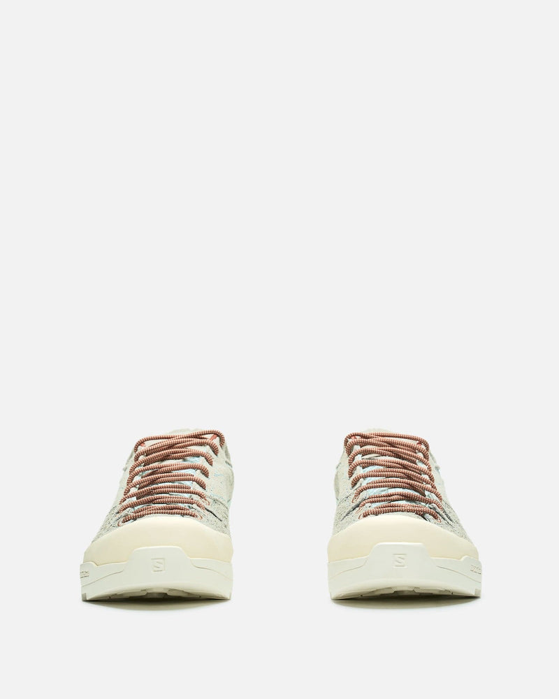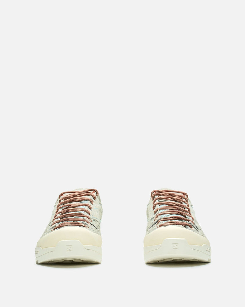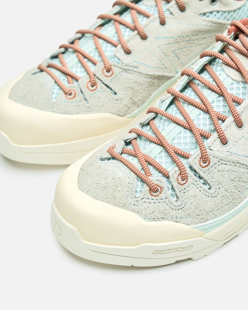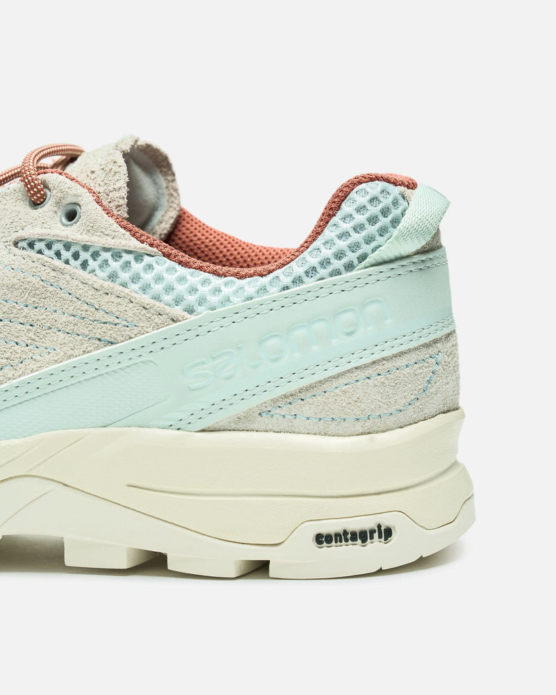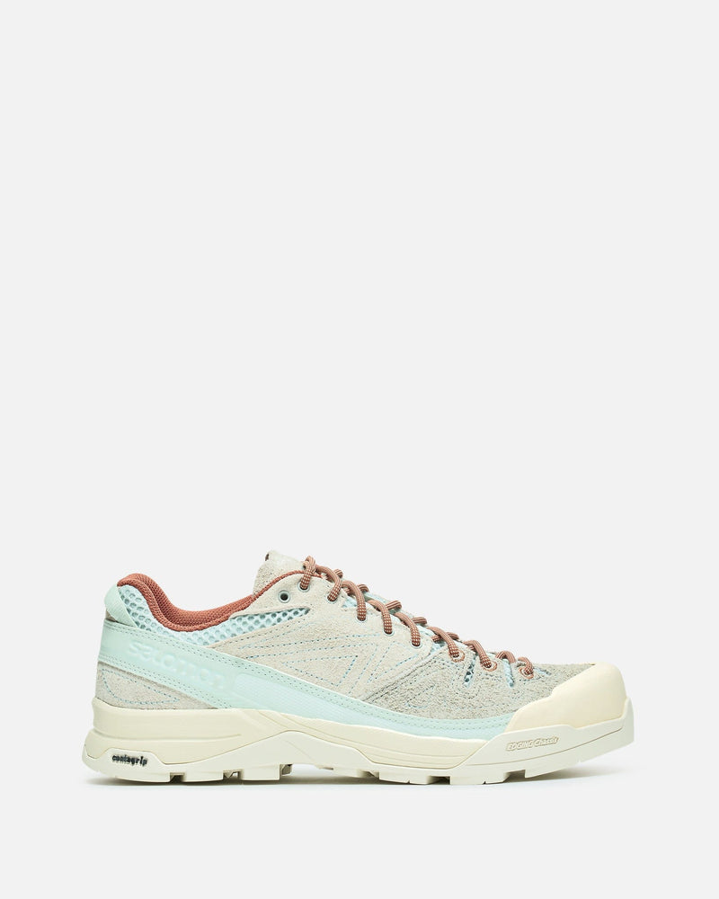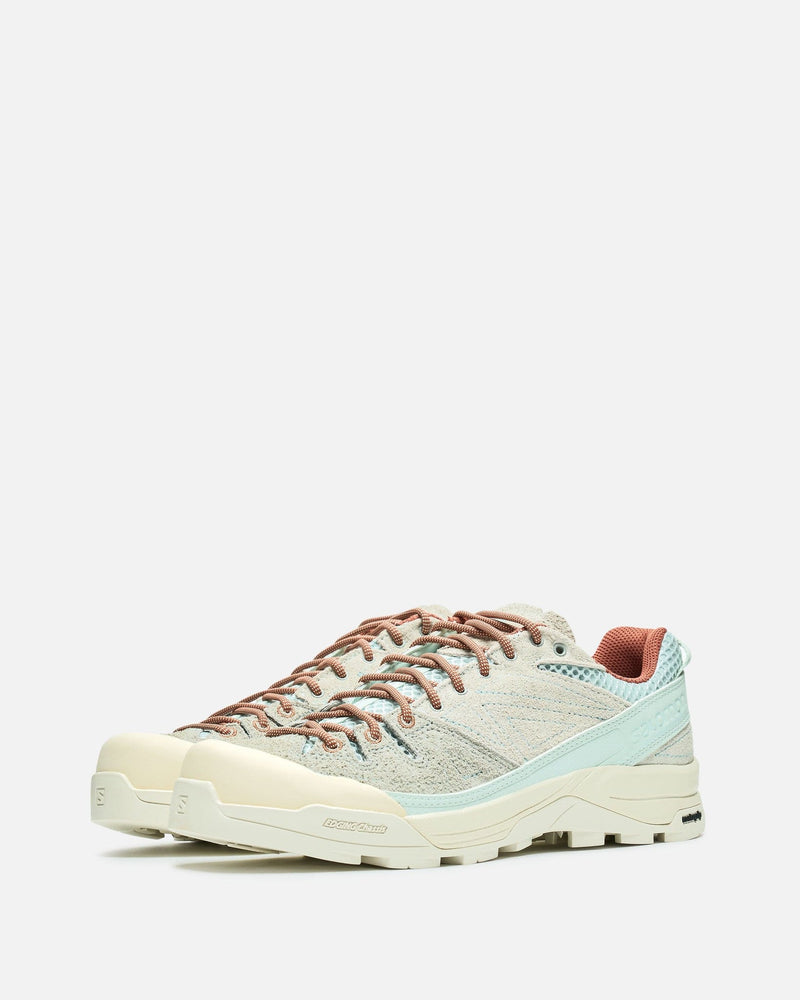 Salomon X-ALP Suede in Ice Flow/Quarry. These shoes feature a suede and canvas upper, rubberized toe box, a stitched lateral power band, 3D Edging Chassis™ for lateral stability and a treaded sole.