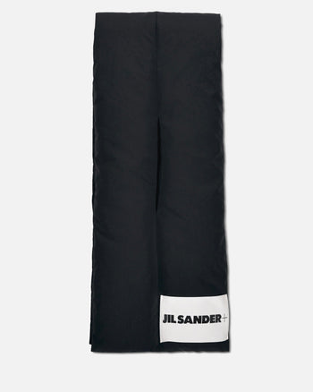 Jil Sander Recycled Polyester Down Scarf in Black. This is a medium fill scarf comprised mostly of goose down and feather. The outer lining is water repellent.