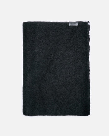 LEMAIRE Maxi Fluffy Scarf in Black. This hand knit scarf is constructed from a fine alpaca wool, fringe at the ends and a leather embossed logo patch sewn at the hem.