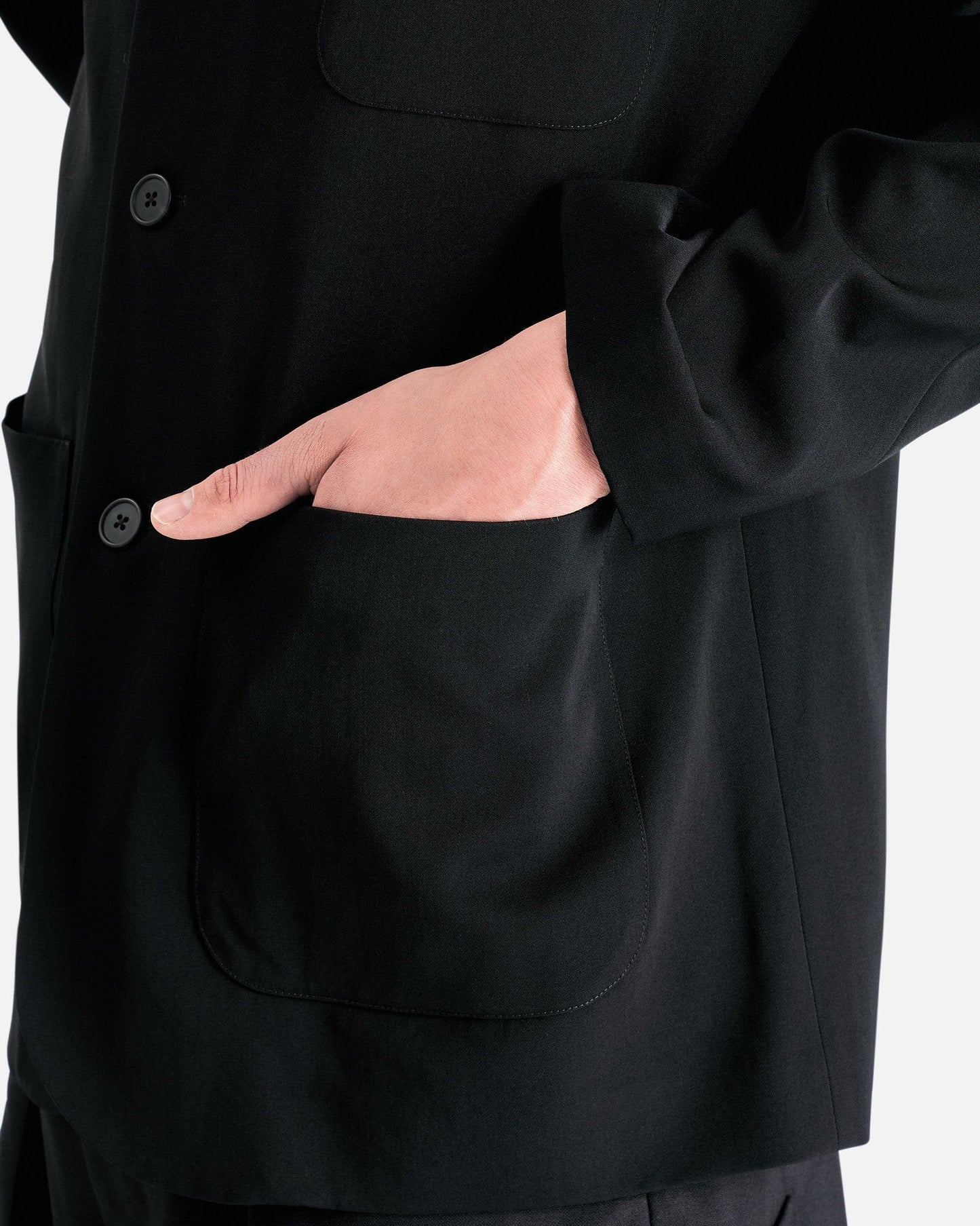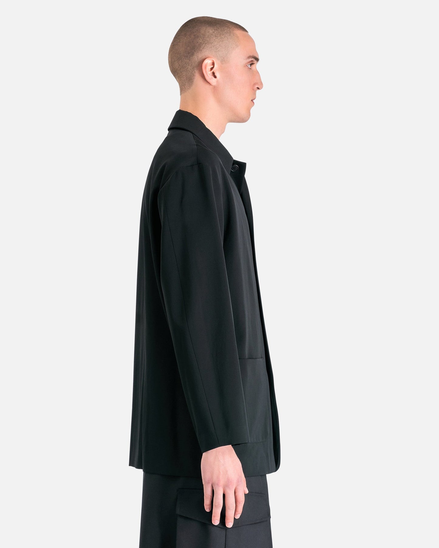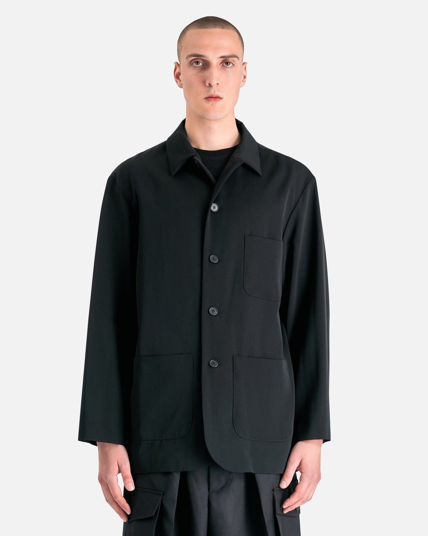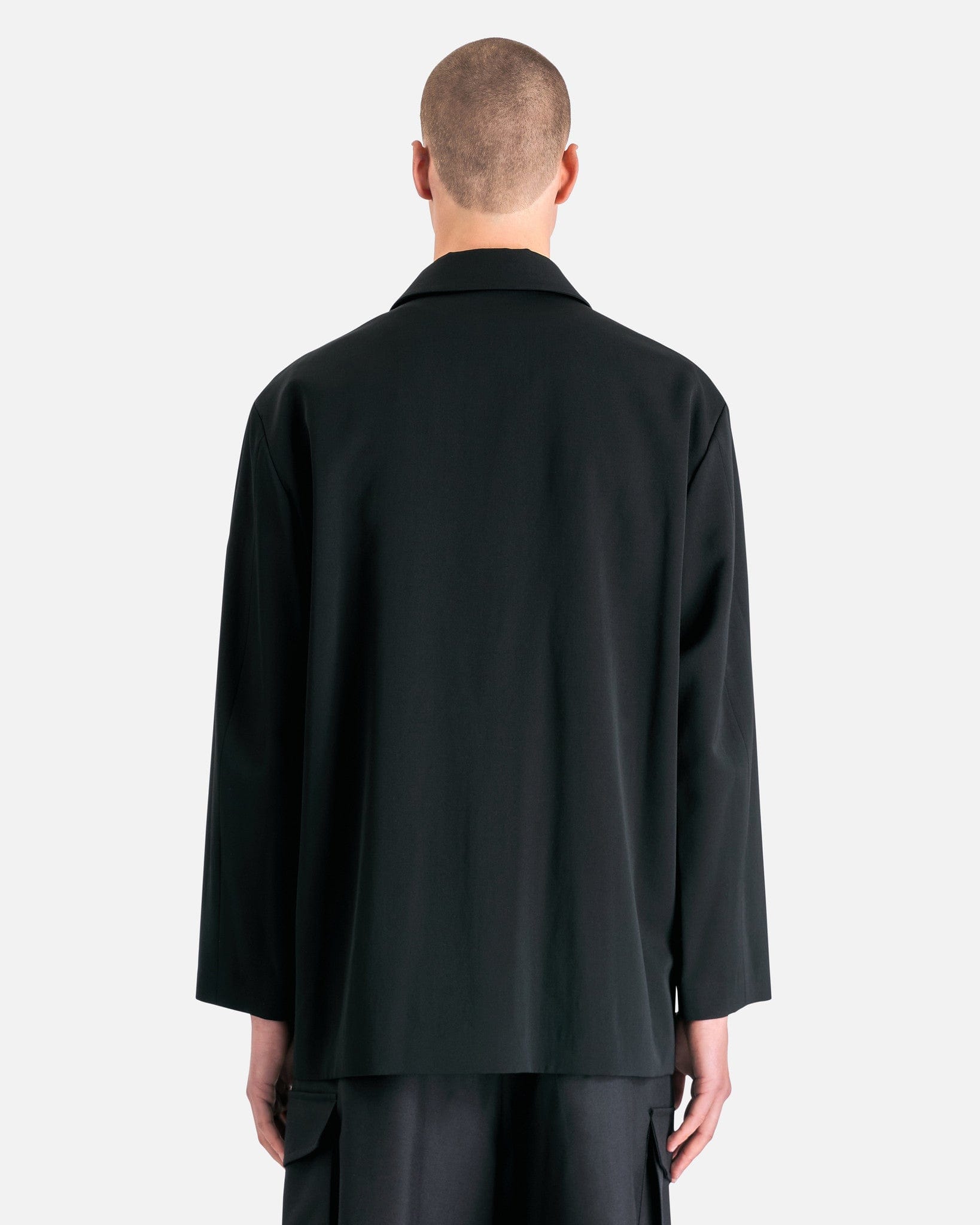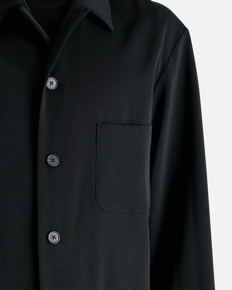The Row Casey Shirt in Black. This shirt jacket features a textured wool composition, front button closure, patch pockets on the front and horn button closure.