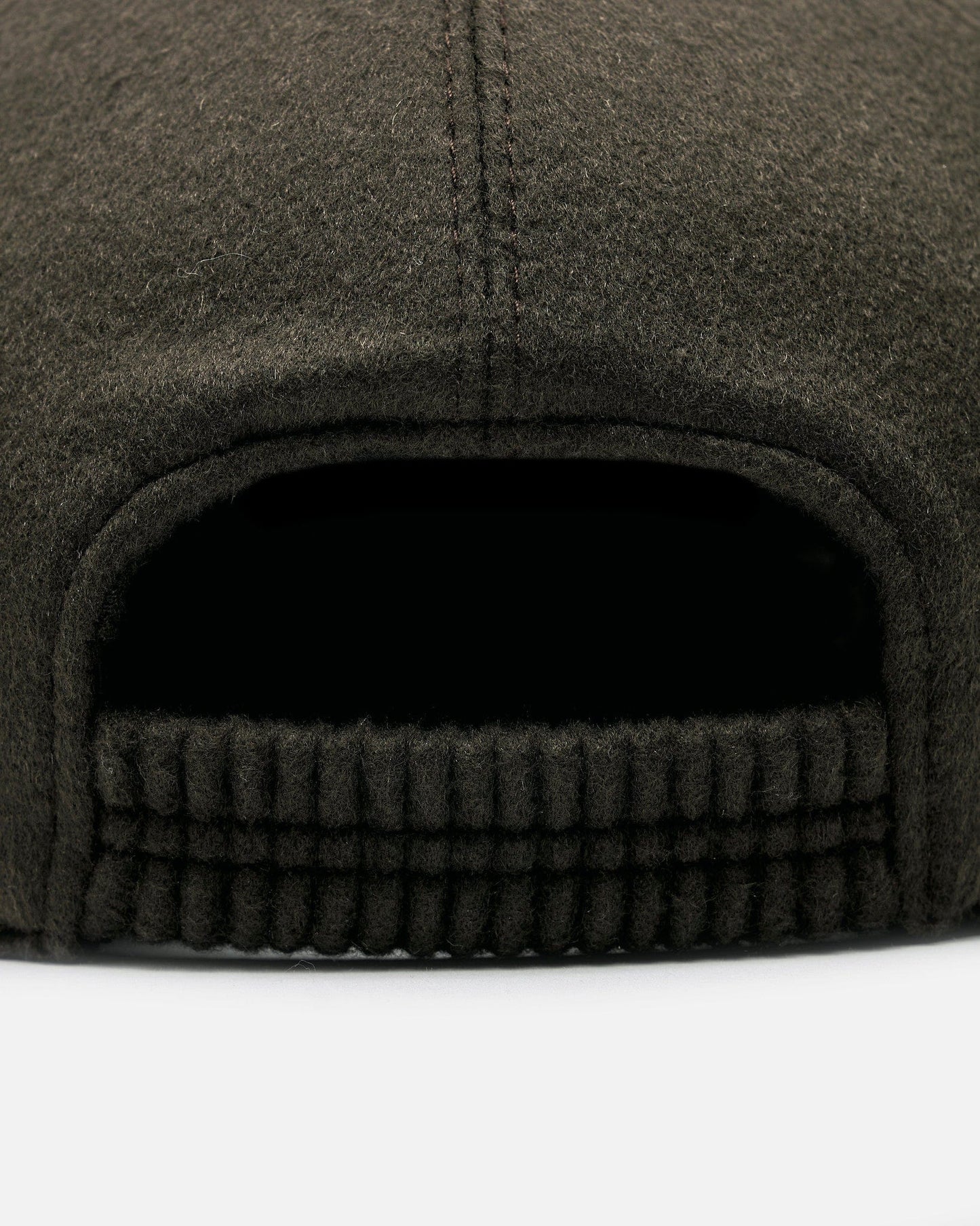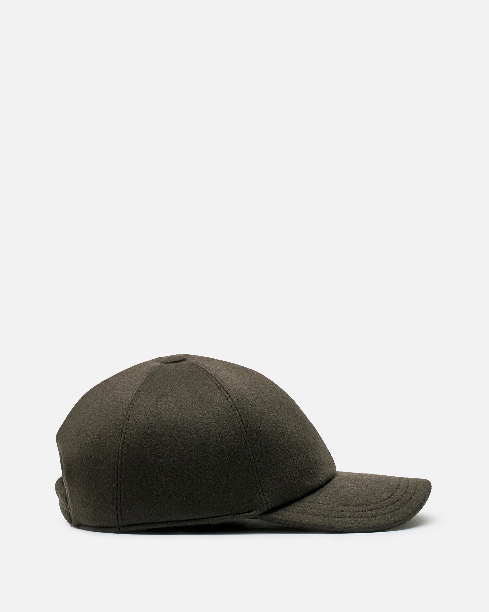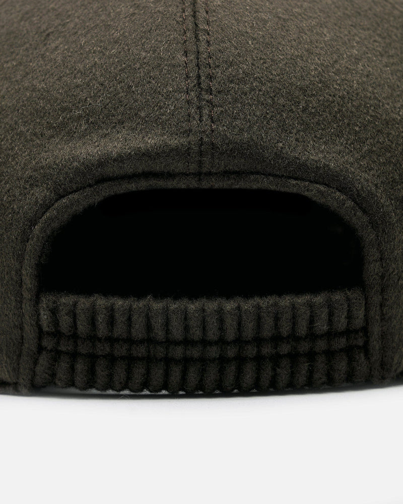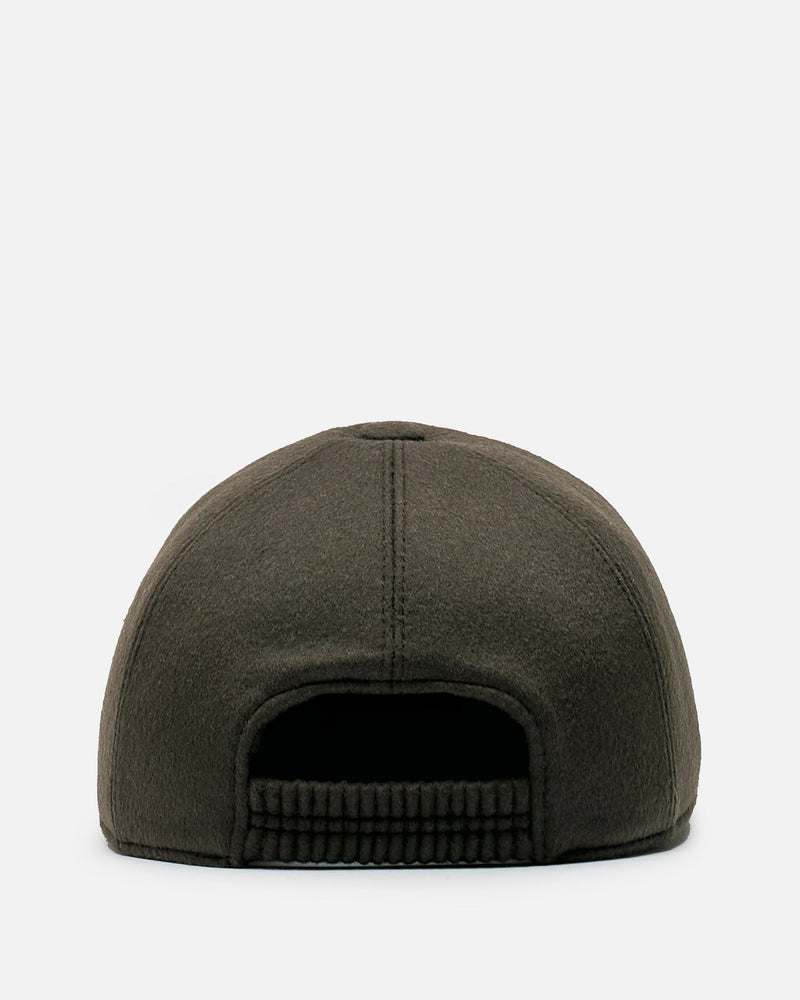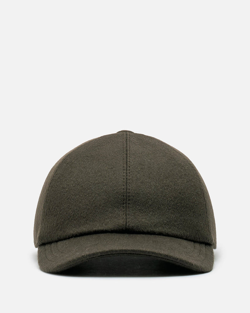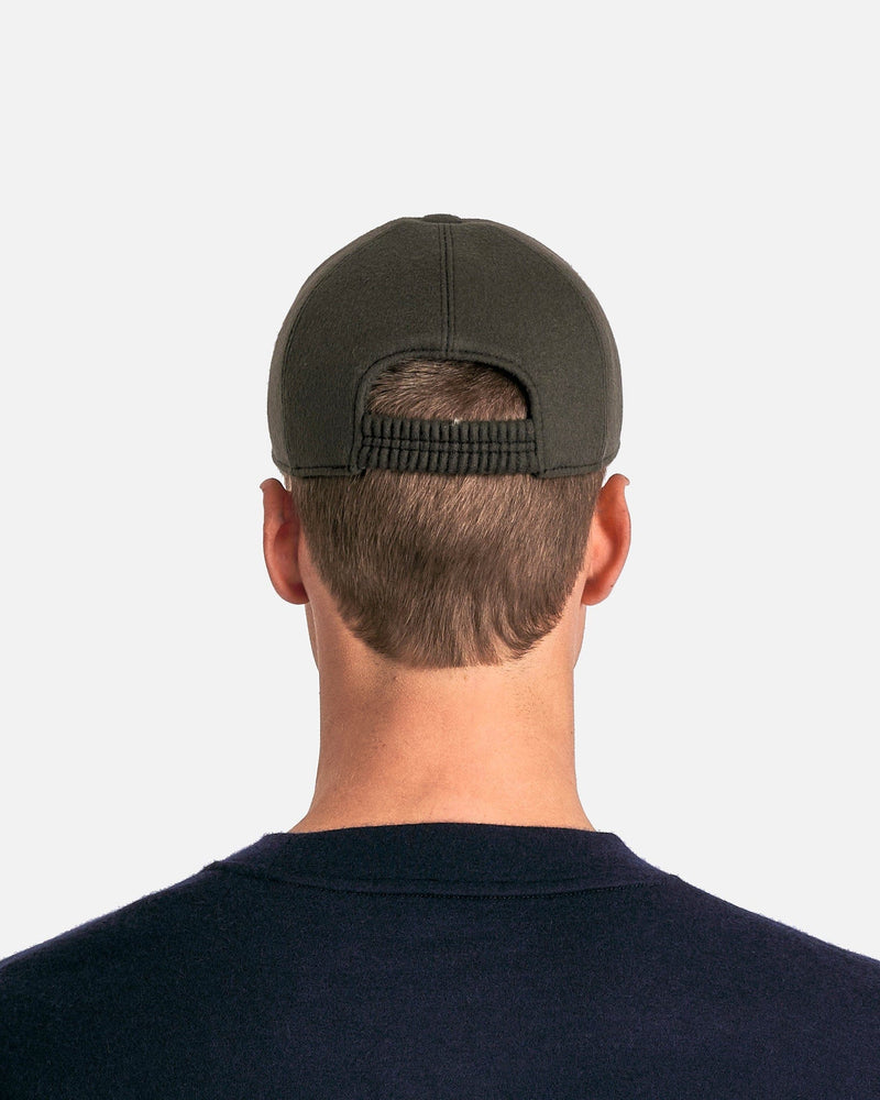 The Row Caspian Hat in Cashmere Black. This hat features a 6-panel design, curved brim and an elastic smocked band at the rear.