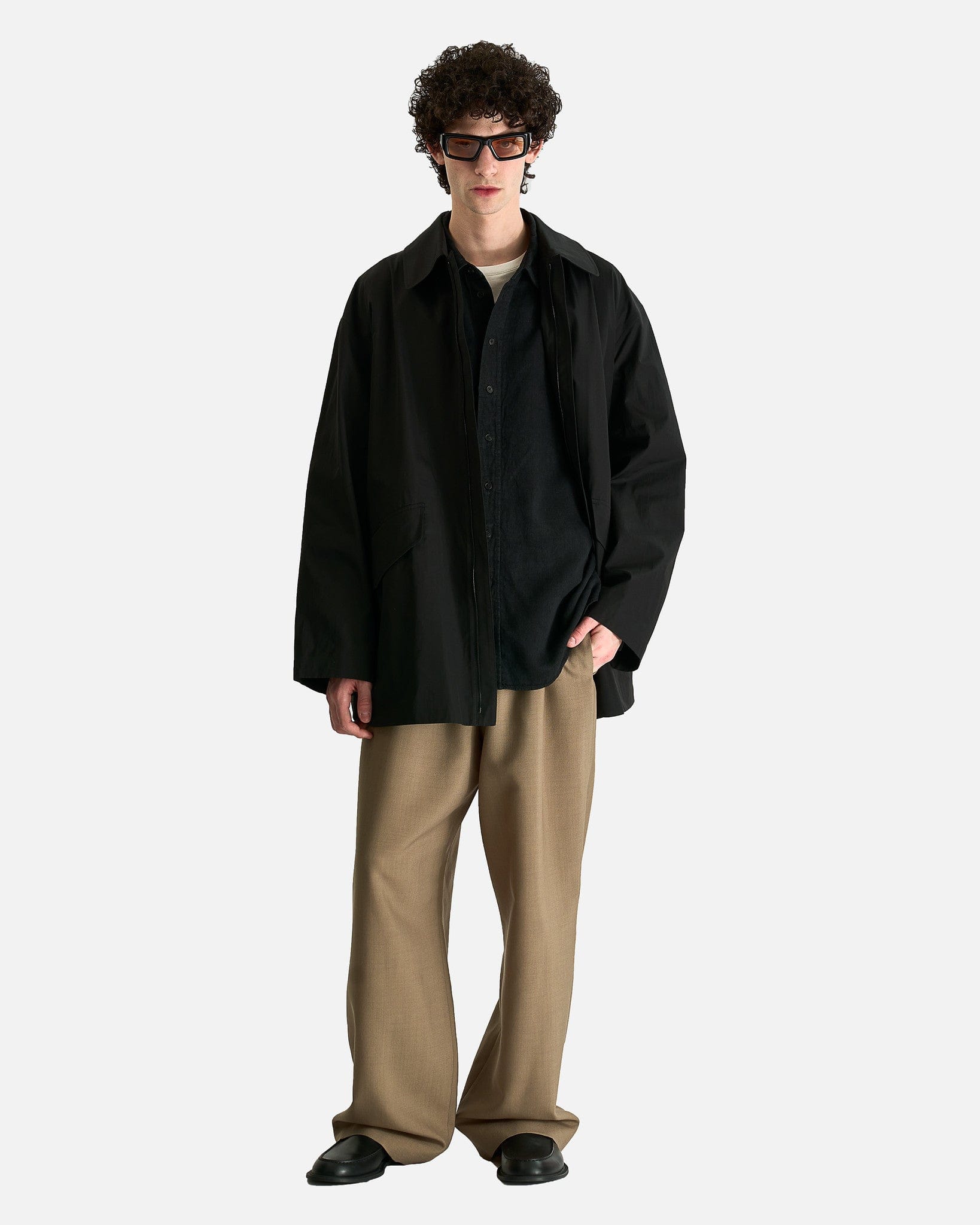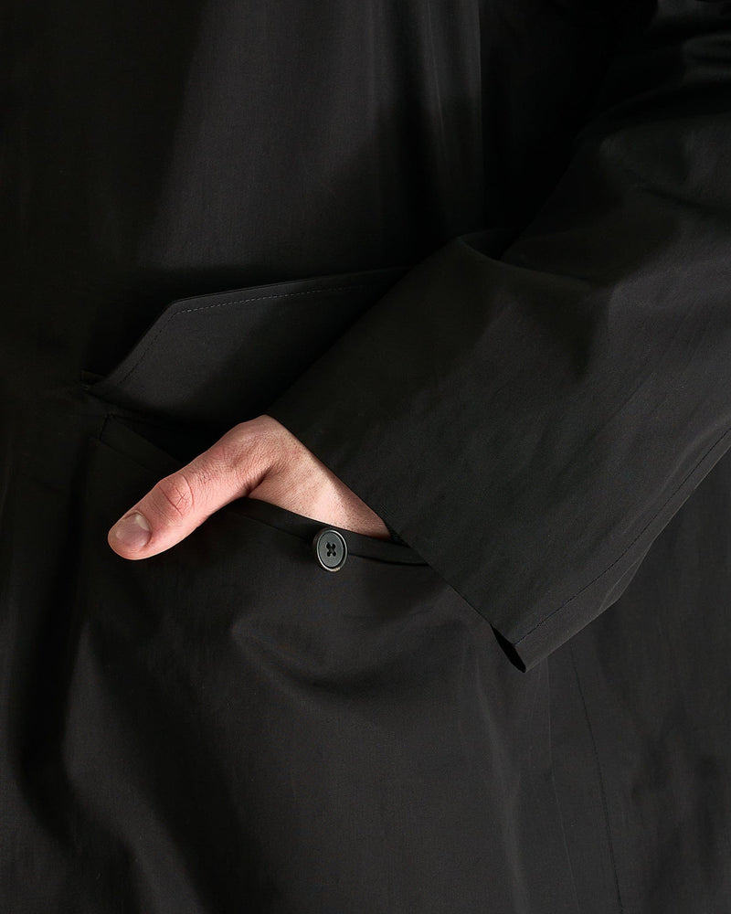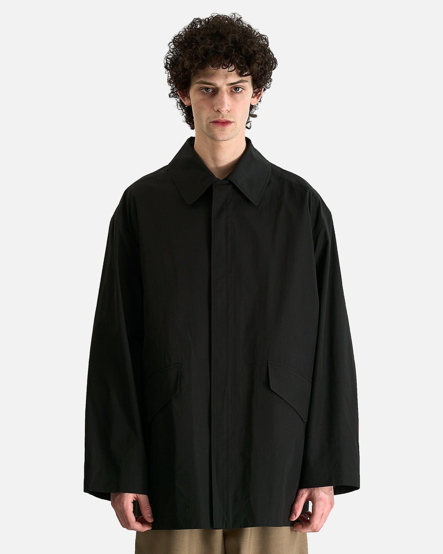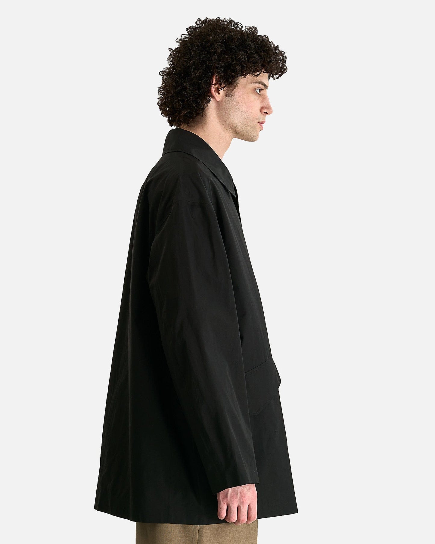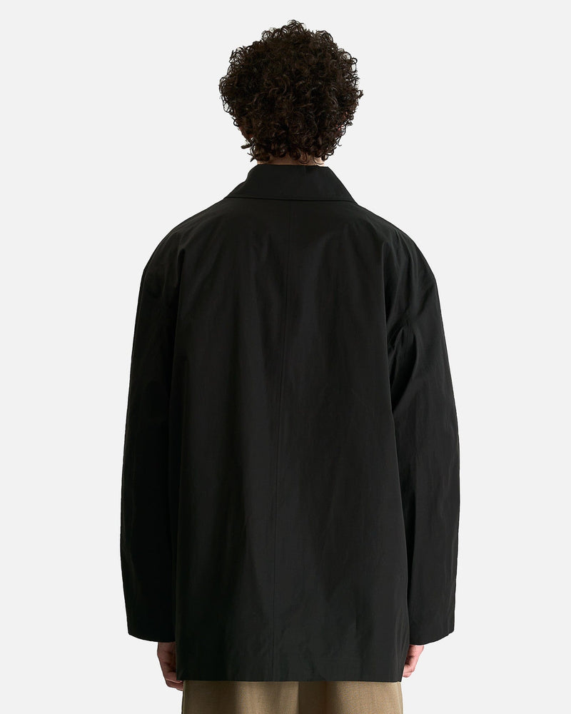 The Row Noe Jacket in Black. This jacket is crafted from a Pima cotton poplin and features a concealed front placket with a two-way zip closure and front slanted pockets with flap closure.