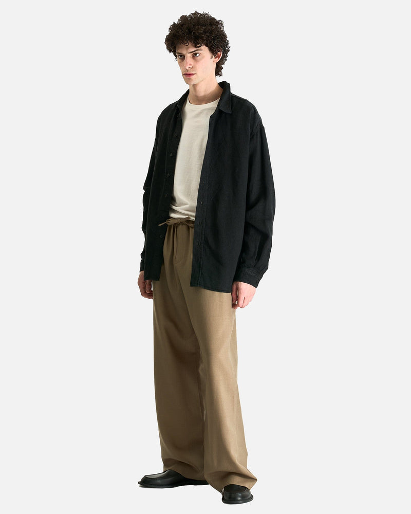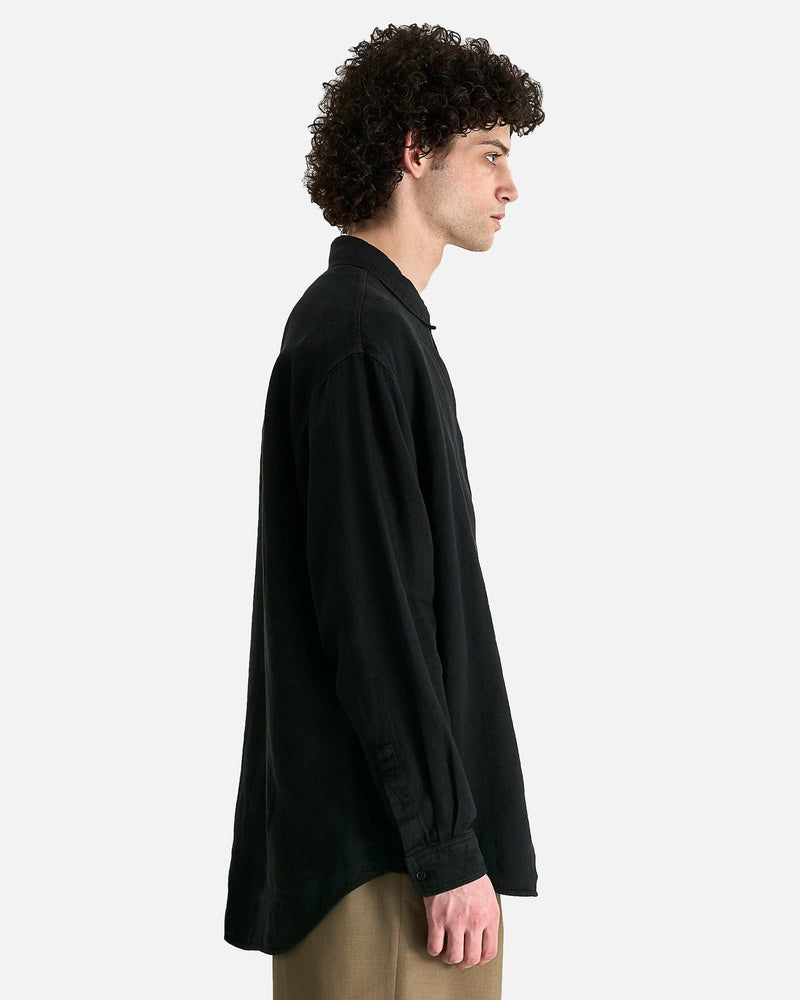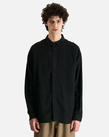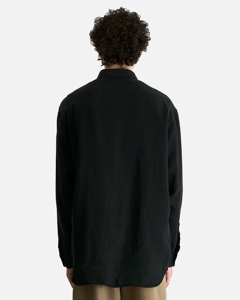 The Row Penn Shirt in Black. This shirt is crafted from a lightweight linen denim and features a classic collar, center front button closure and a curved hem.