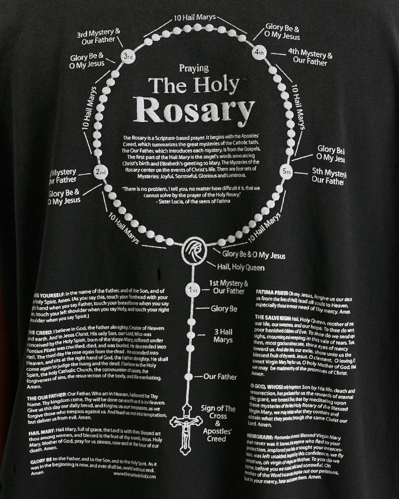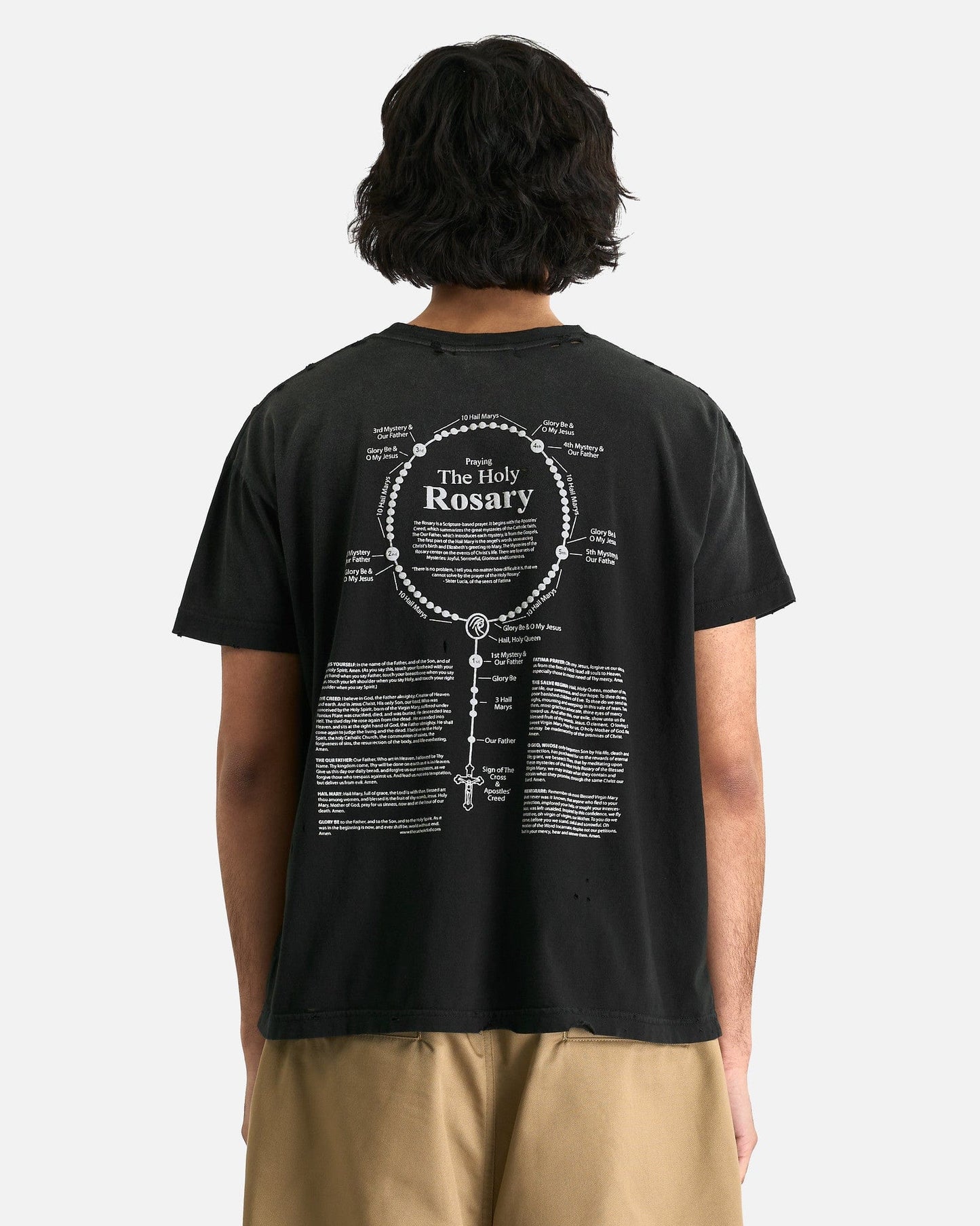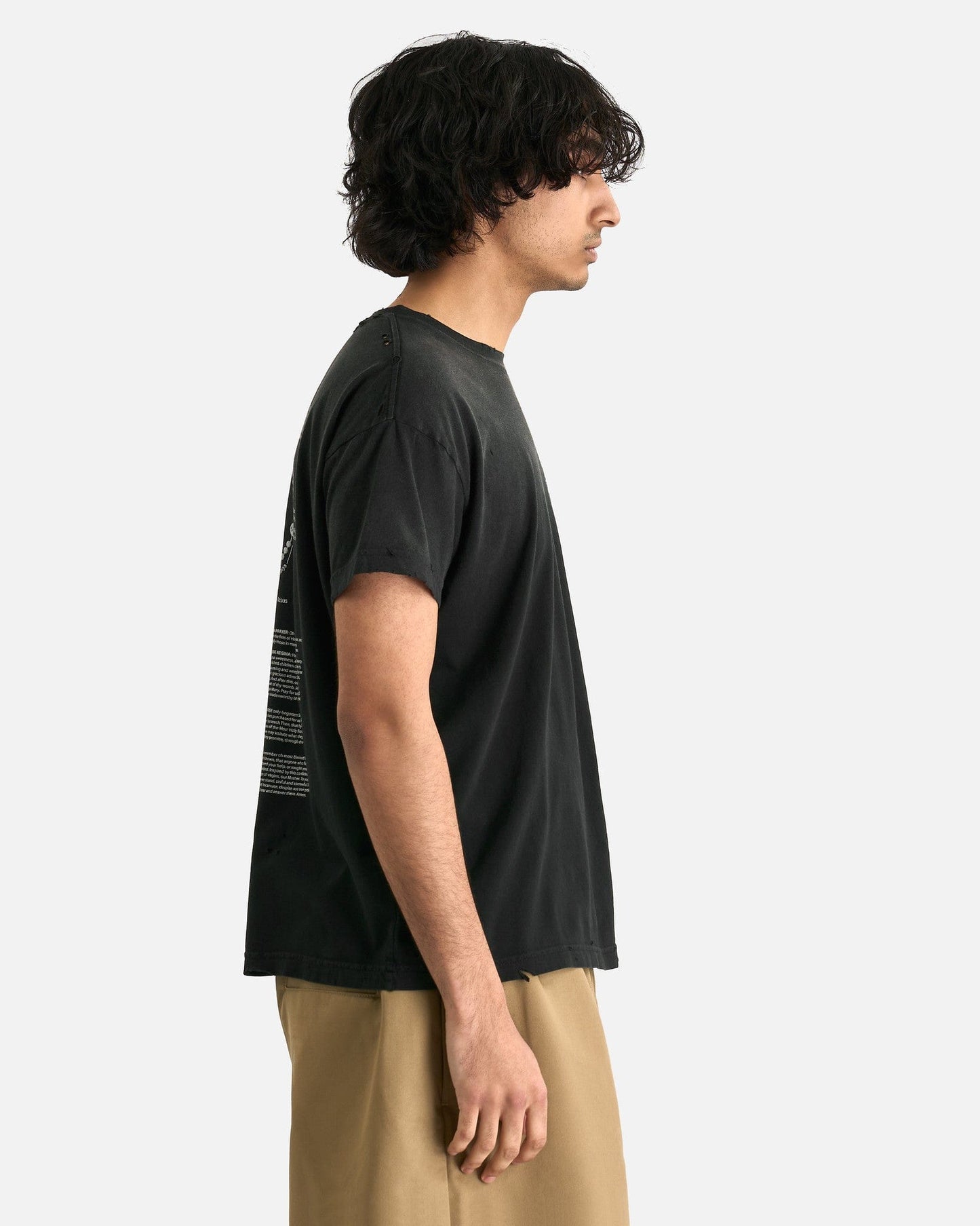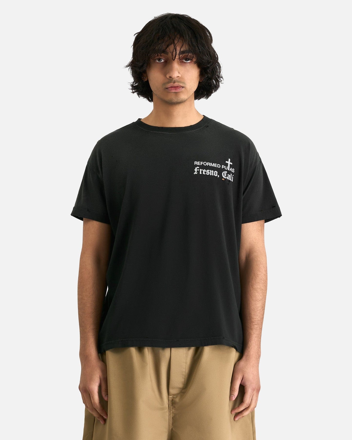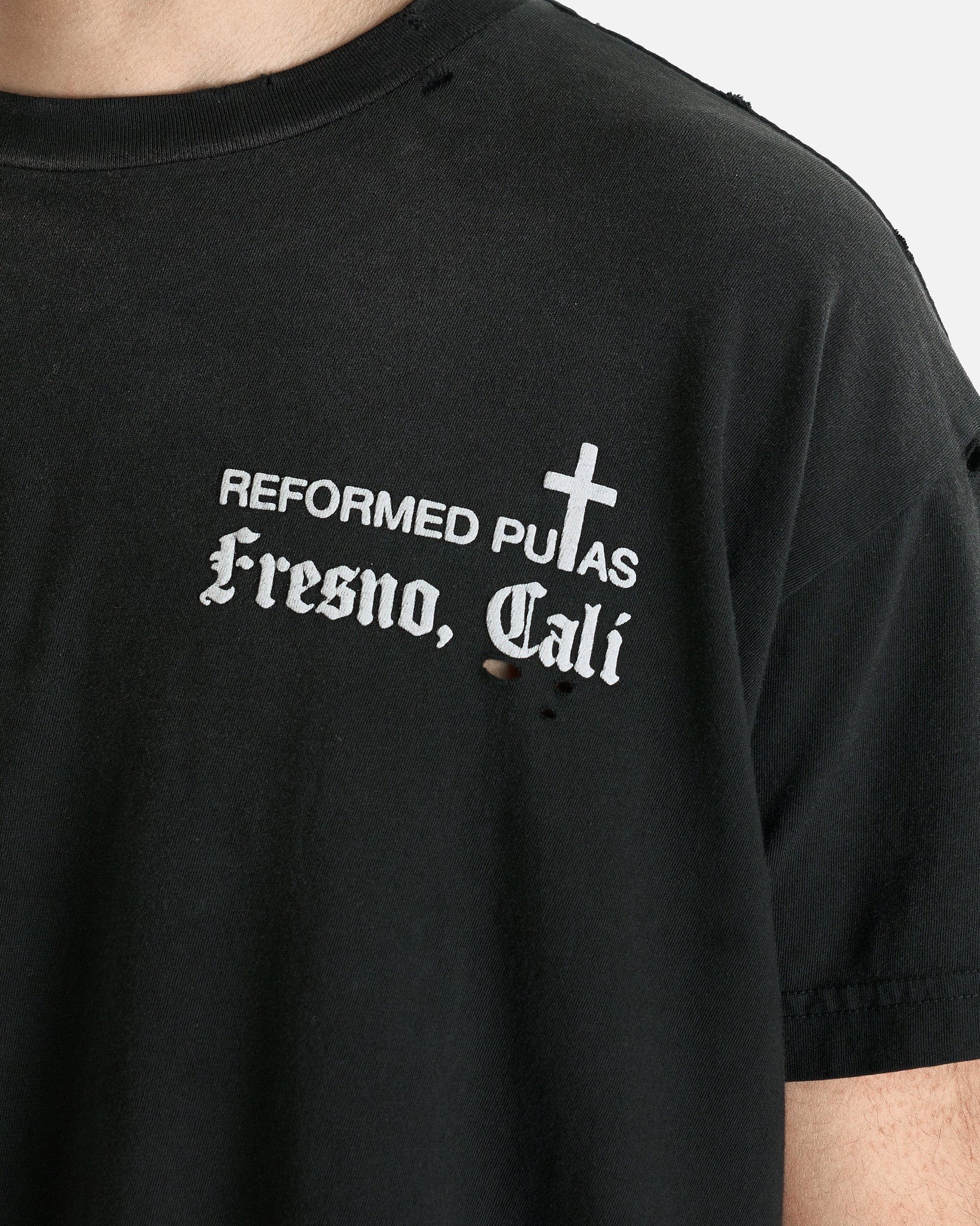 Willy Chavarria Reformed Putas Destroyed Easy Tee in Black. This t-shirt is crafted from a lightweight cotton jersey and features a crewneck collar, distressed details and puff print graphics on the face and rear.