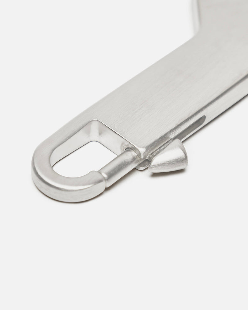Rick Owens SS24 Lido Cerberus Keyring in Silver. This keyring features 3-headed lobster-clasp fastenings, keyrings at bottom and logo engraved detailing on the side.