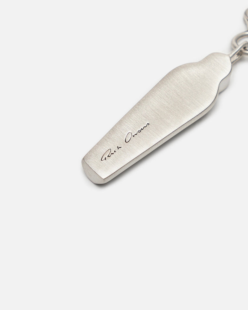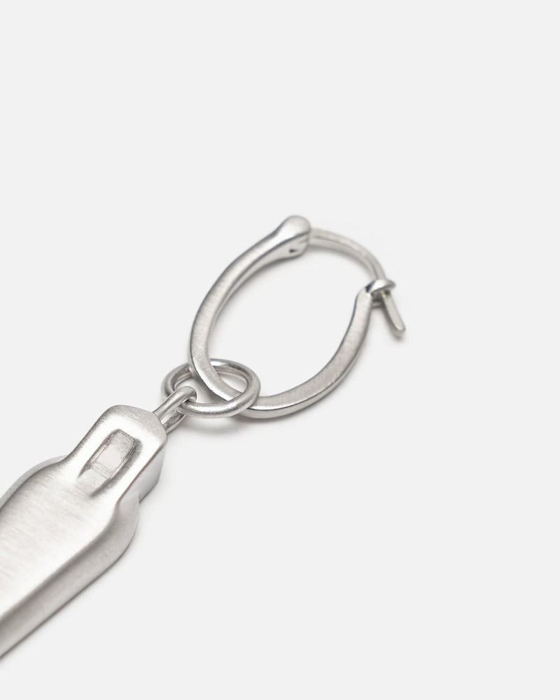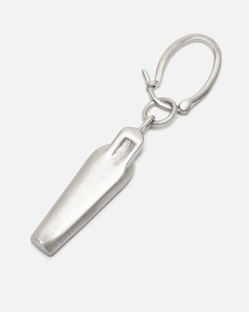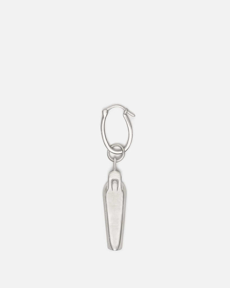 Rick Owens SS24 Lido Sarcophagus Earring in Silver. This earring features a sarcophagus charm, ringlet securing a hinged-post fastening and engraved logo on opposite side.