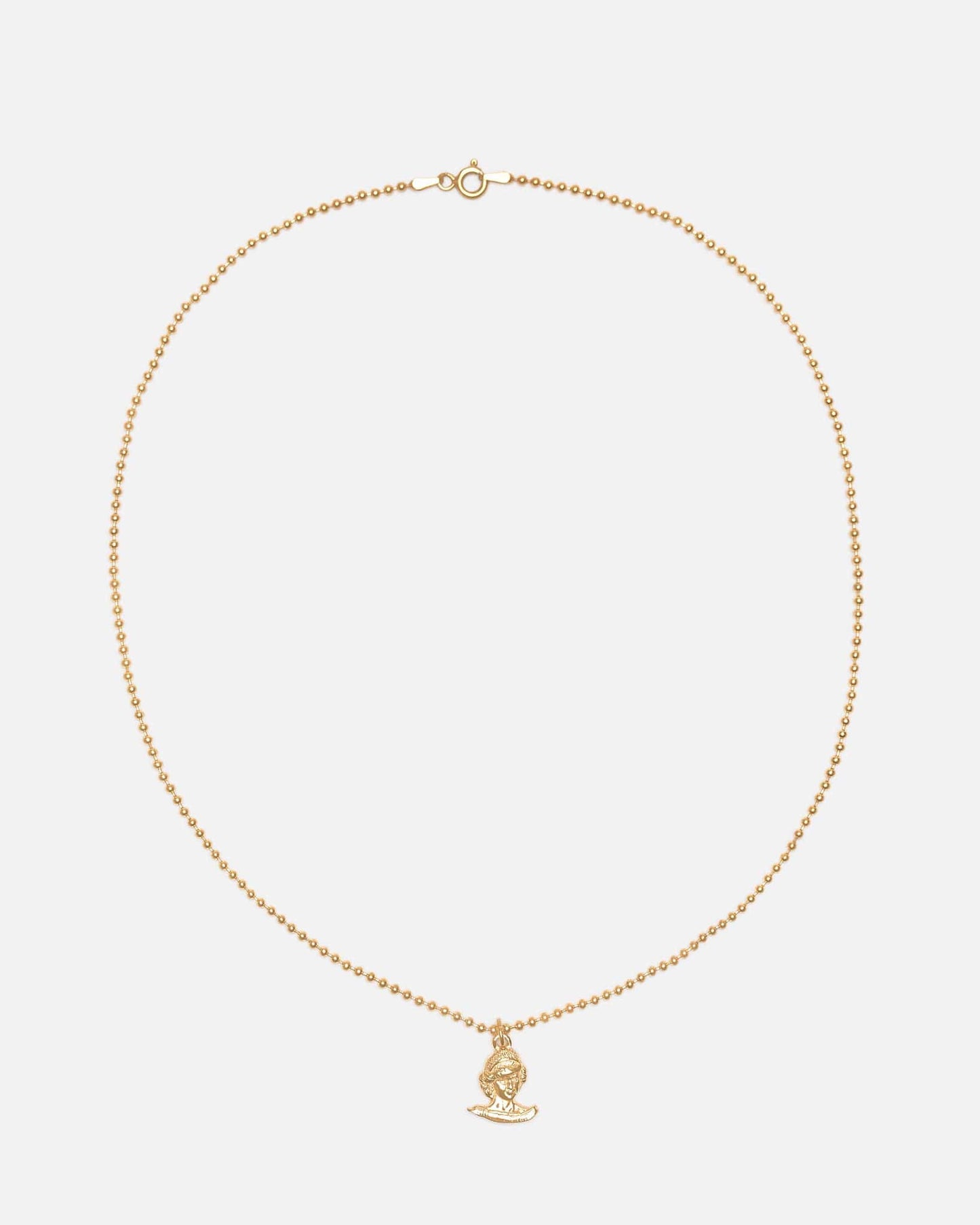 Secret of Manna Princess Diana necklace in gold. This necklace features a pendant of Princess Diana on a ball chain.