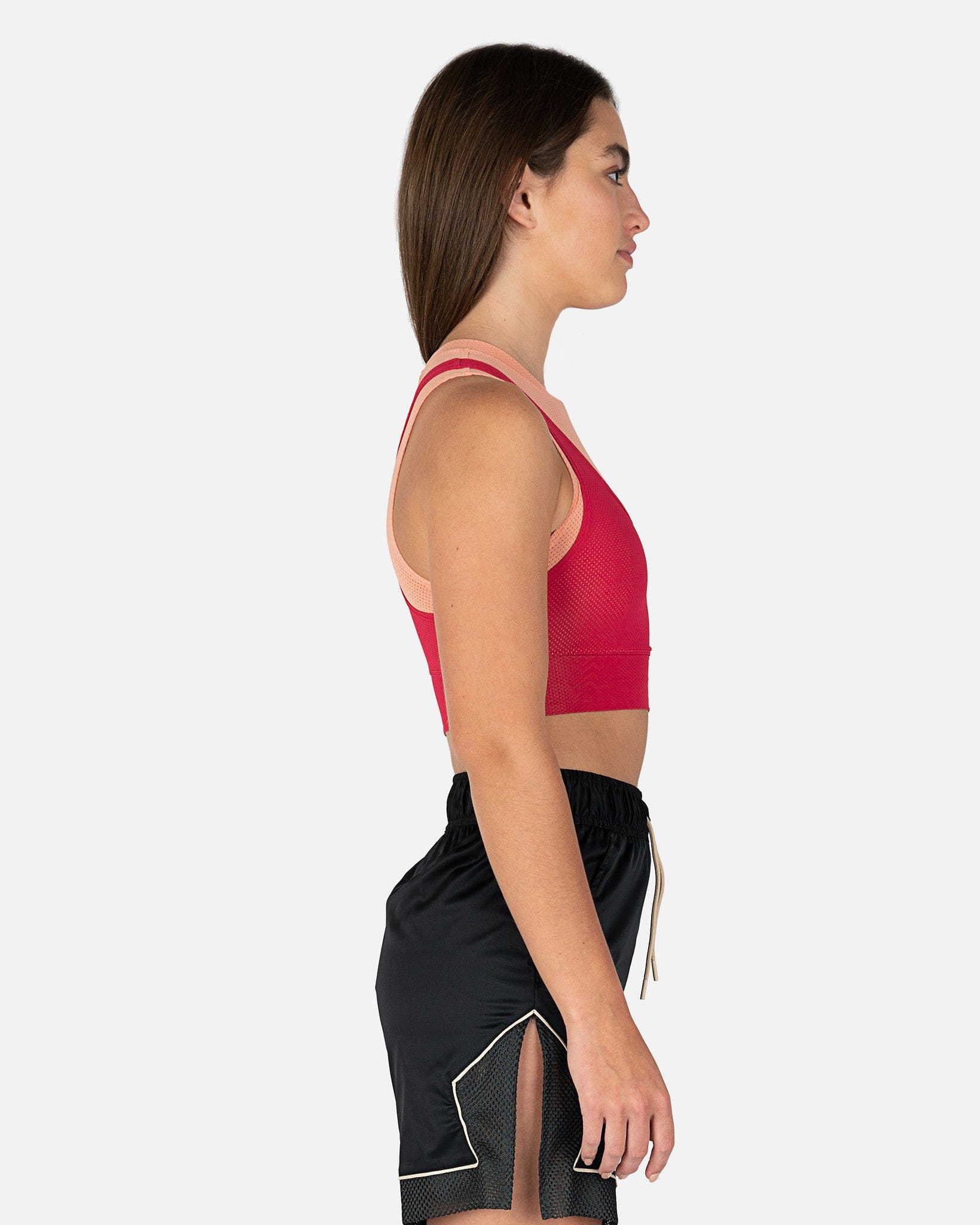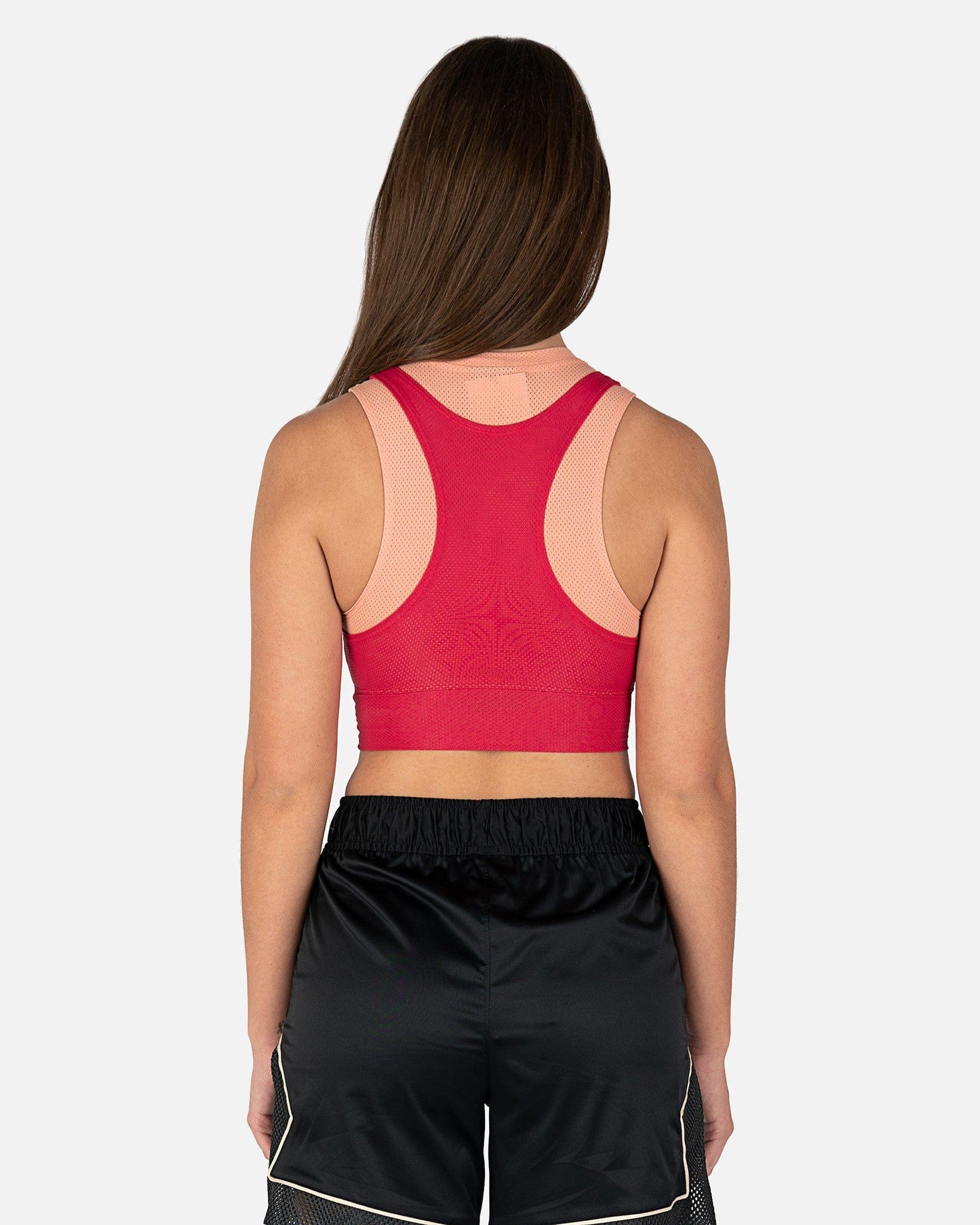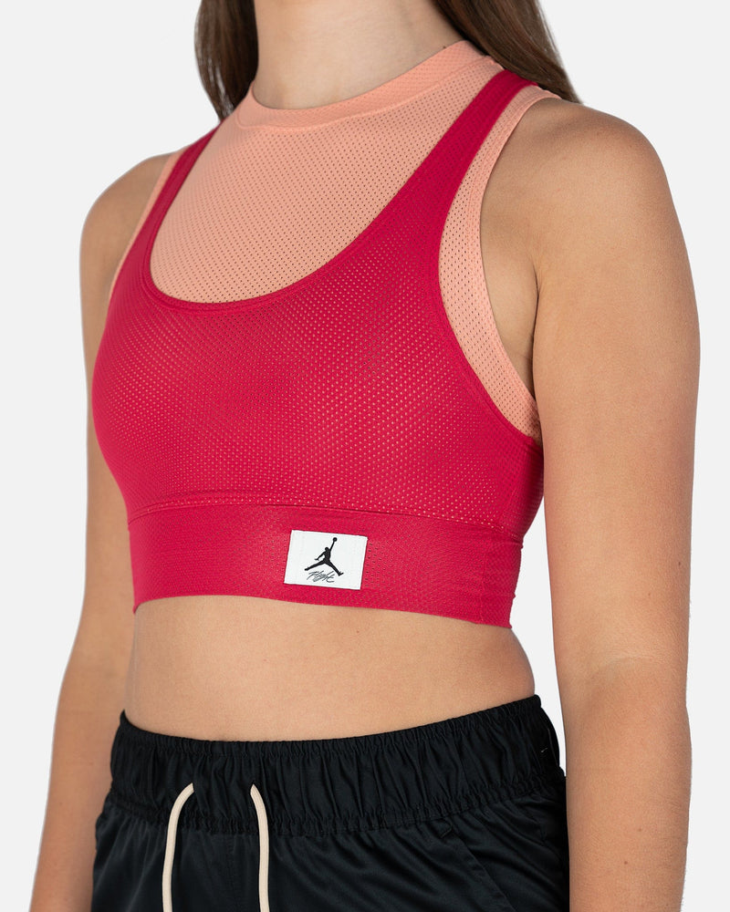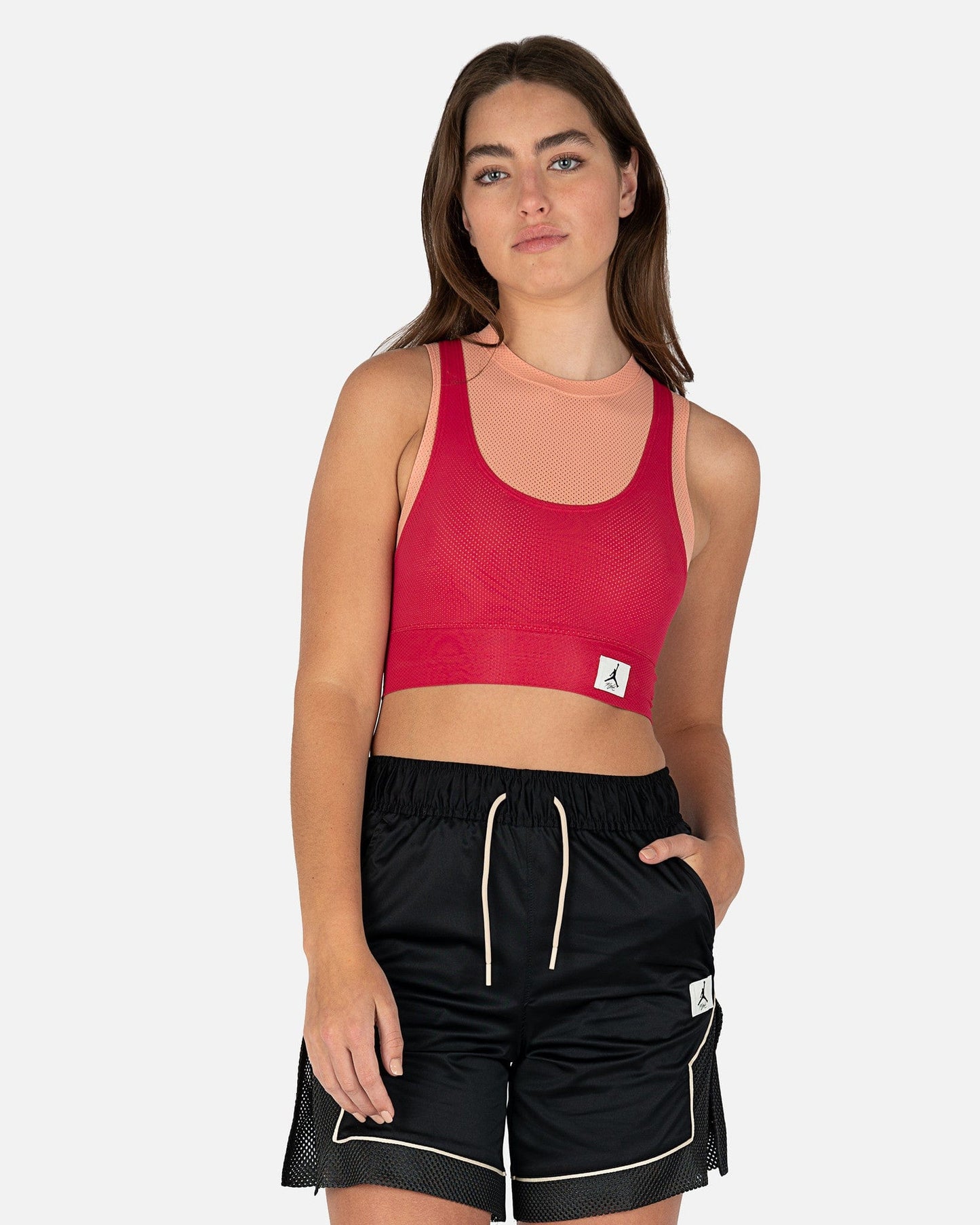 Jordan women's double layered crop top in peach and raspberry. The under layer has a crew neckline and the top layer has a scoop neckline and racerback silhouette. There is a Jordan logo on the front hem.