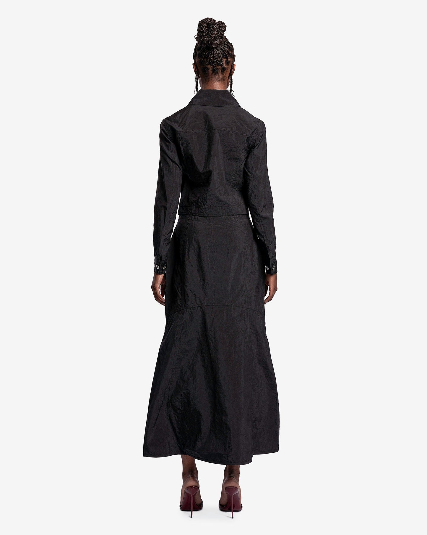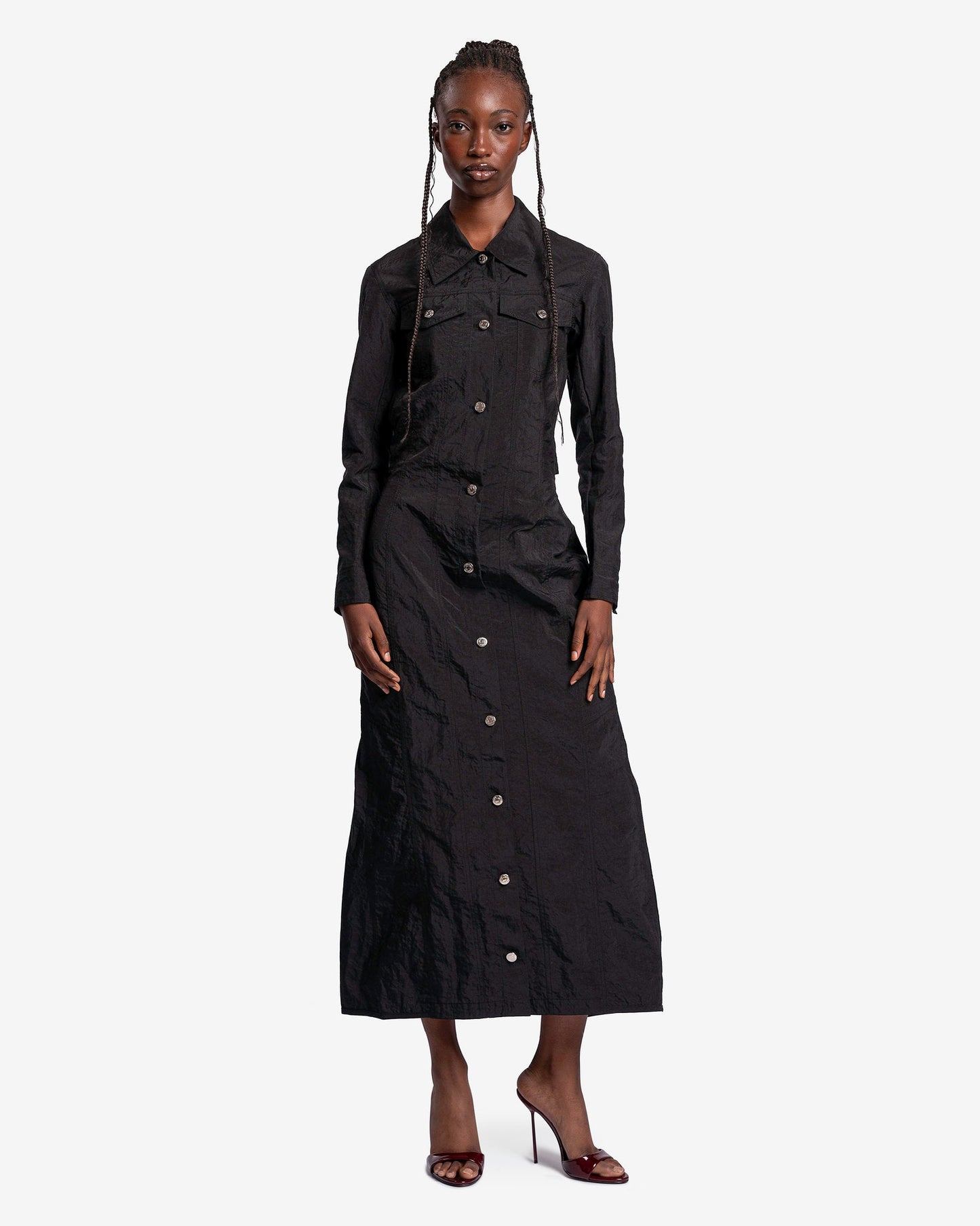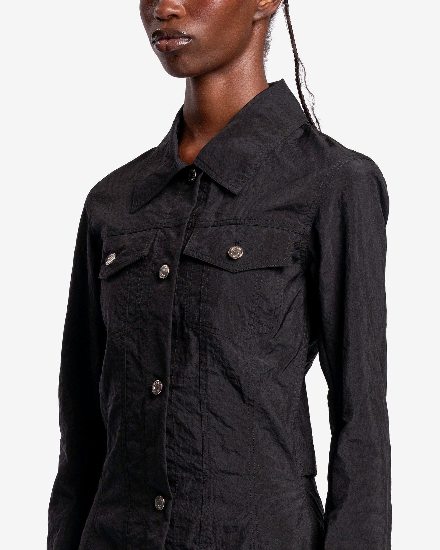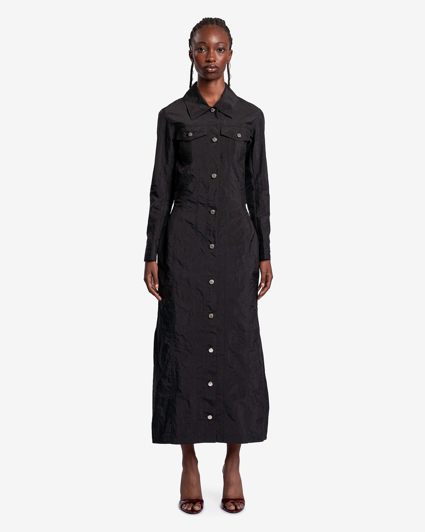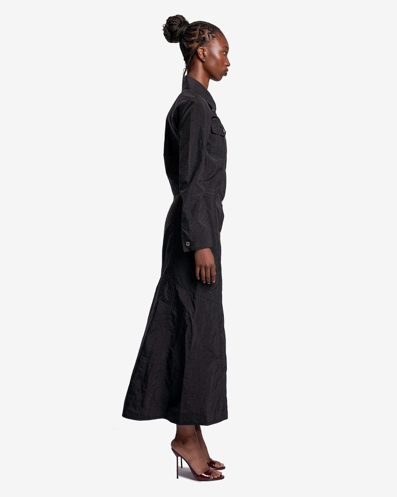 KANGHYUK women's button up dress in black. This maxi dress is constructed from recycled airbags and features a trucker jacket inspired silhouette.