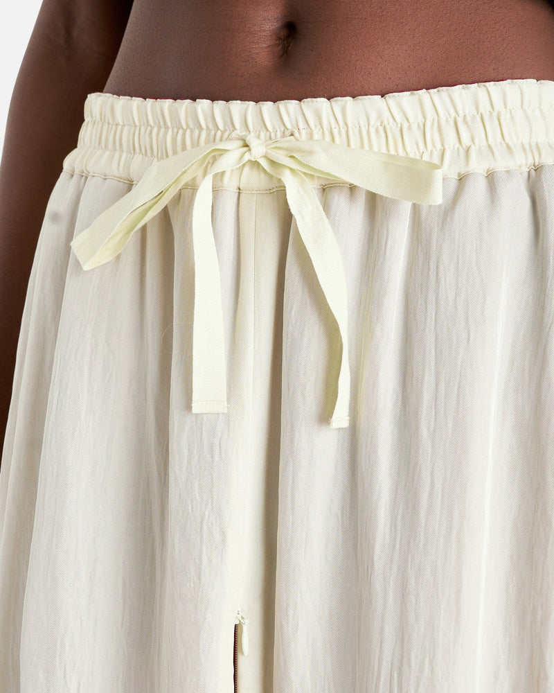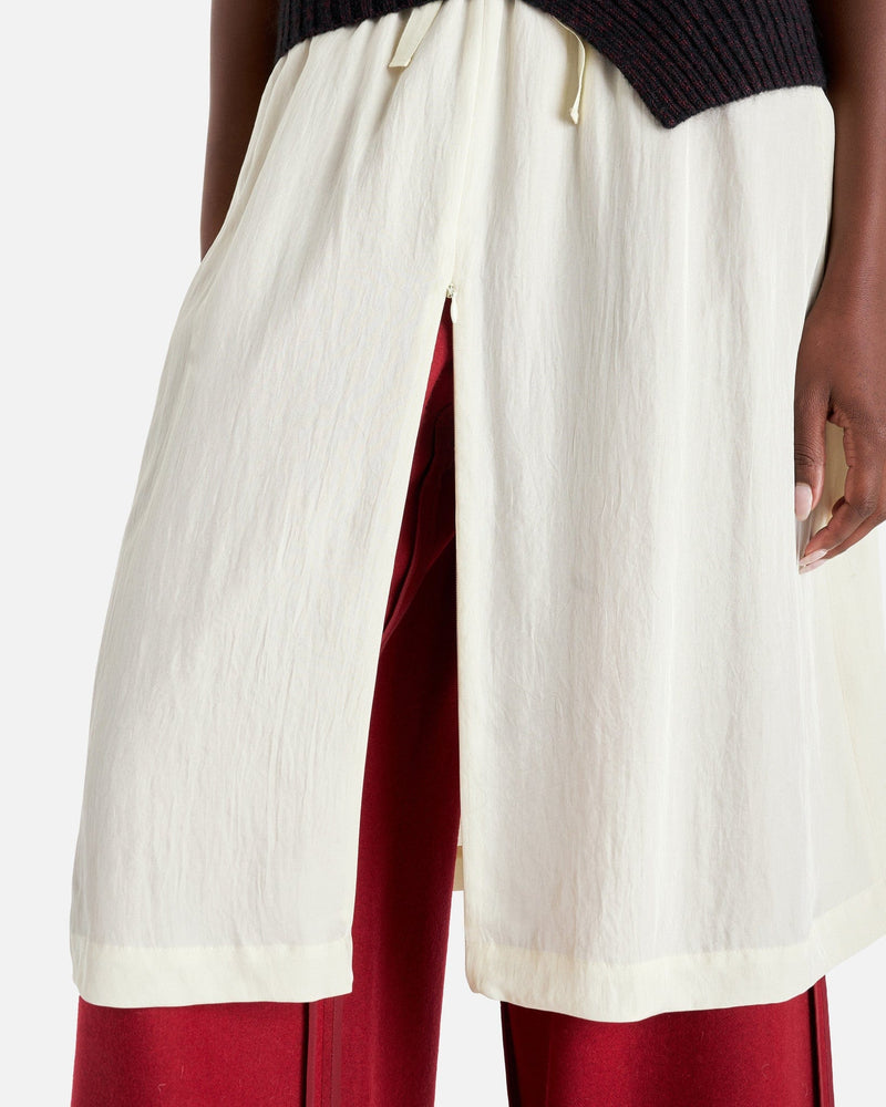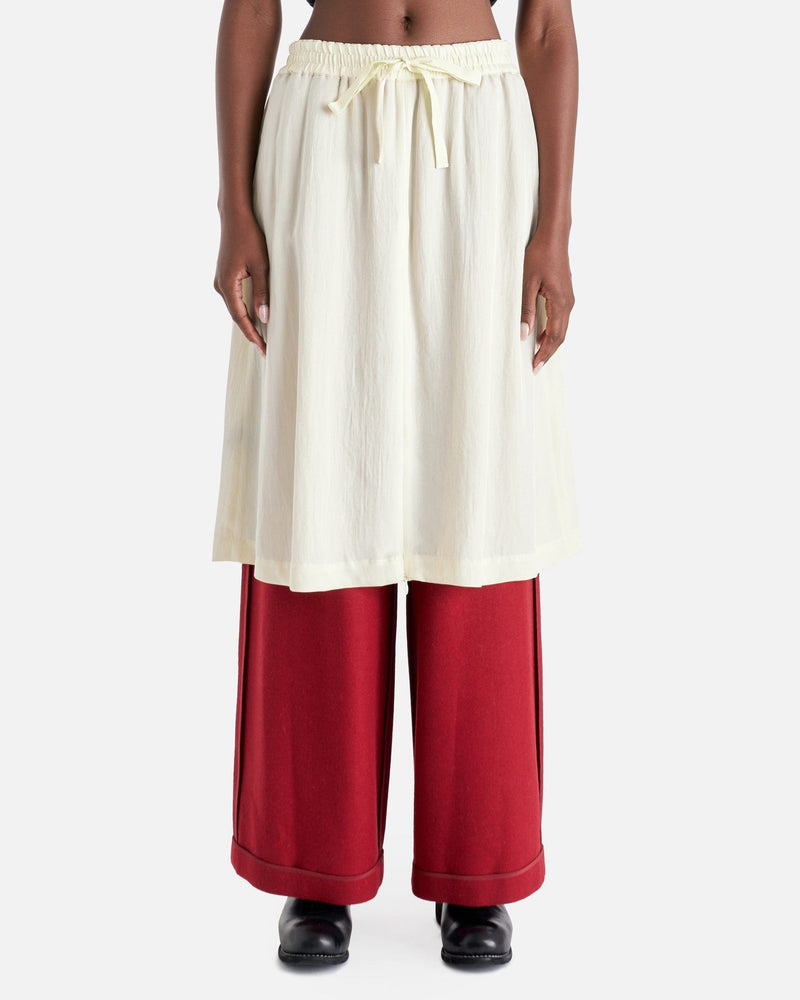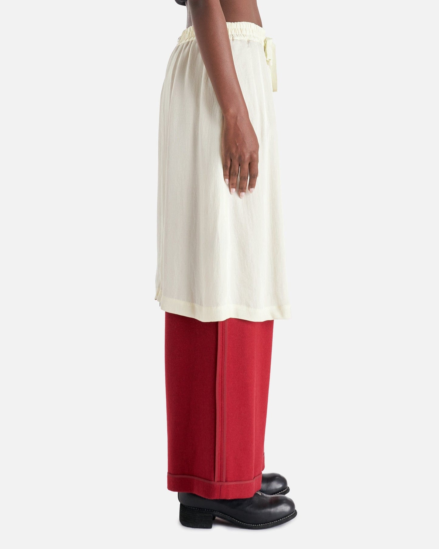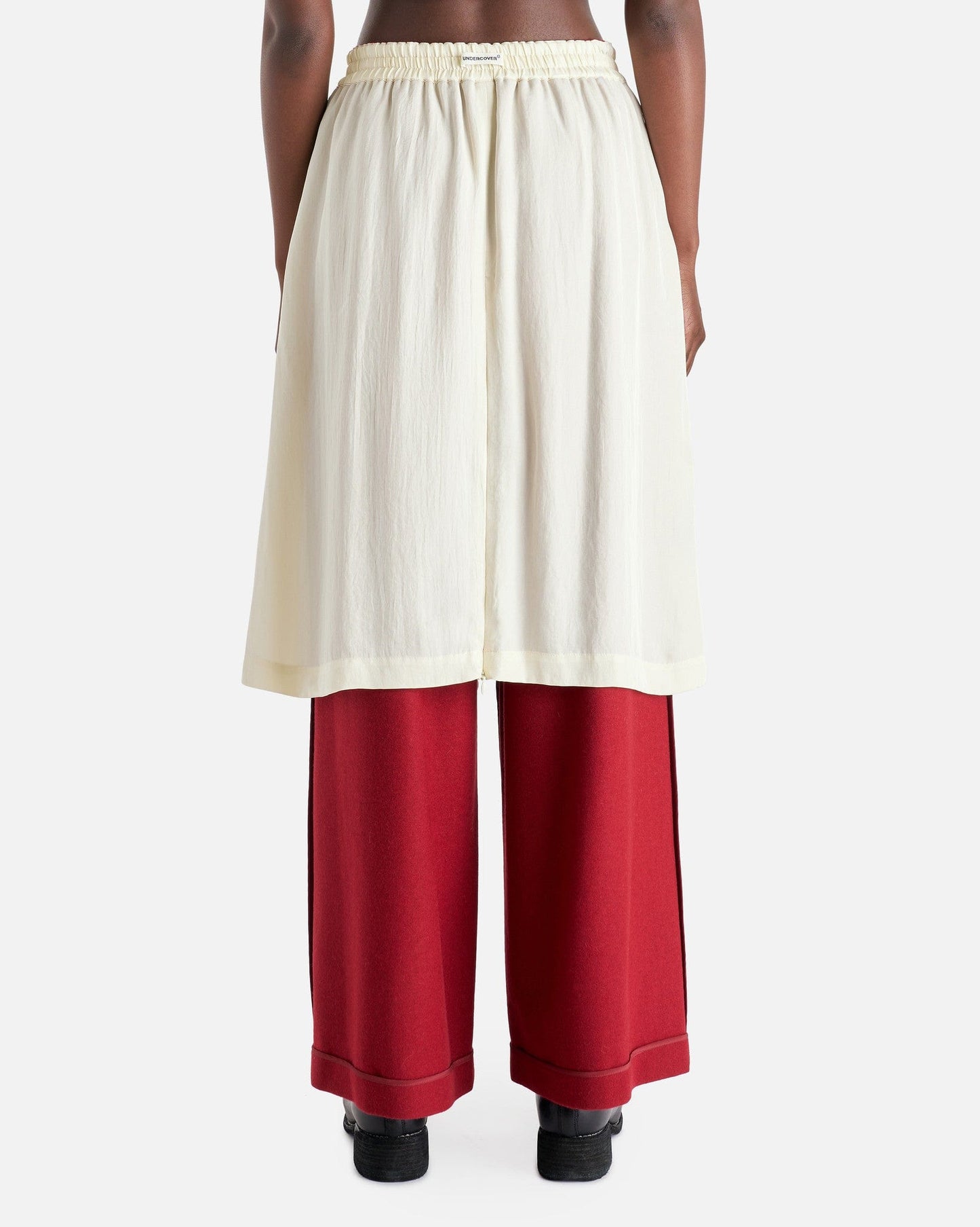 UNDERCOVER women's layered pants in red and white. These pants feature a red wide leg base with a white skirt like layer on top.