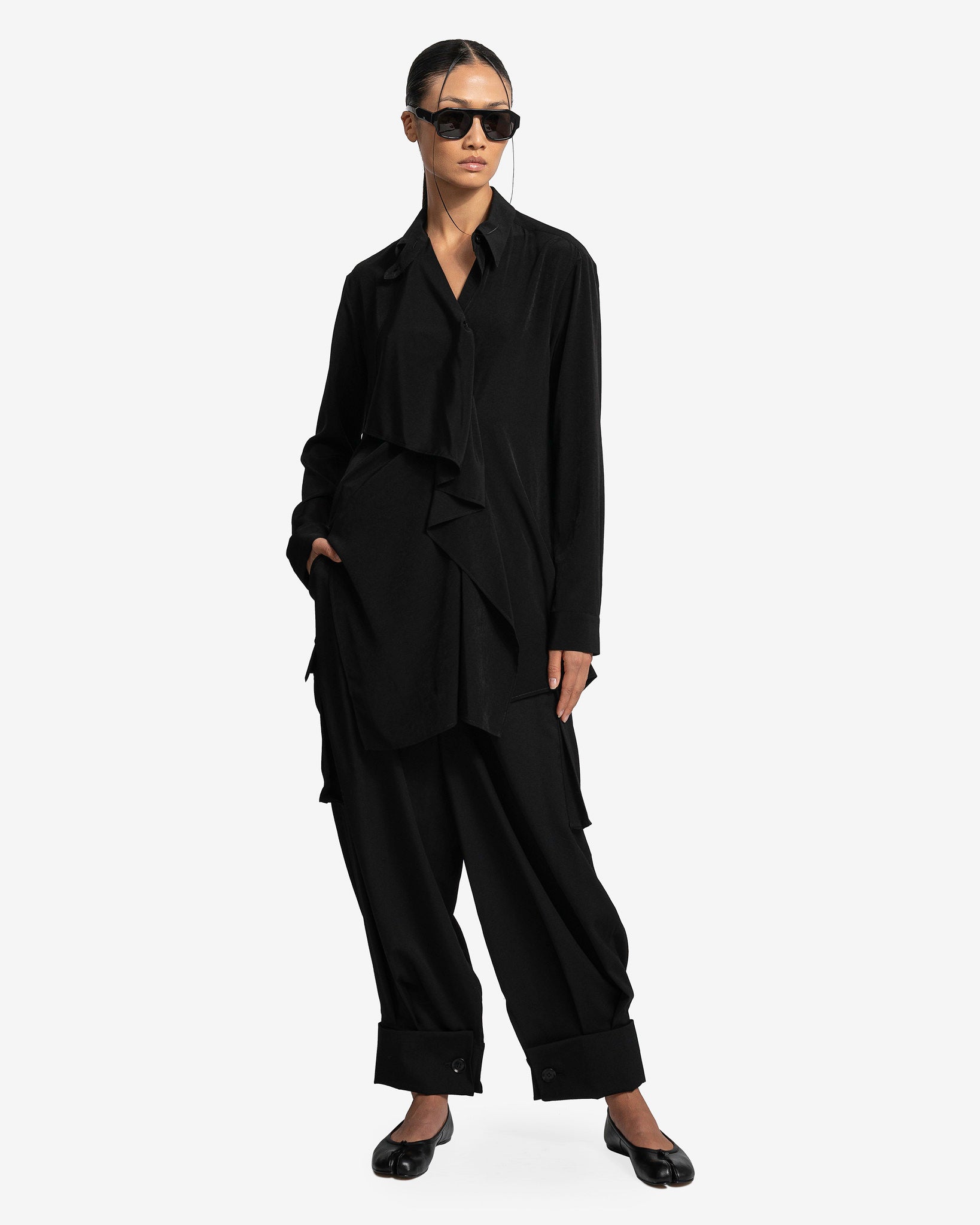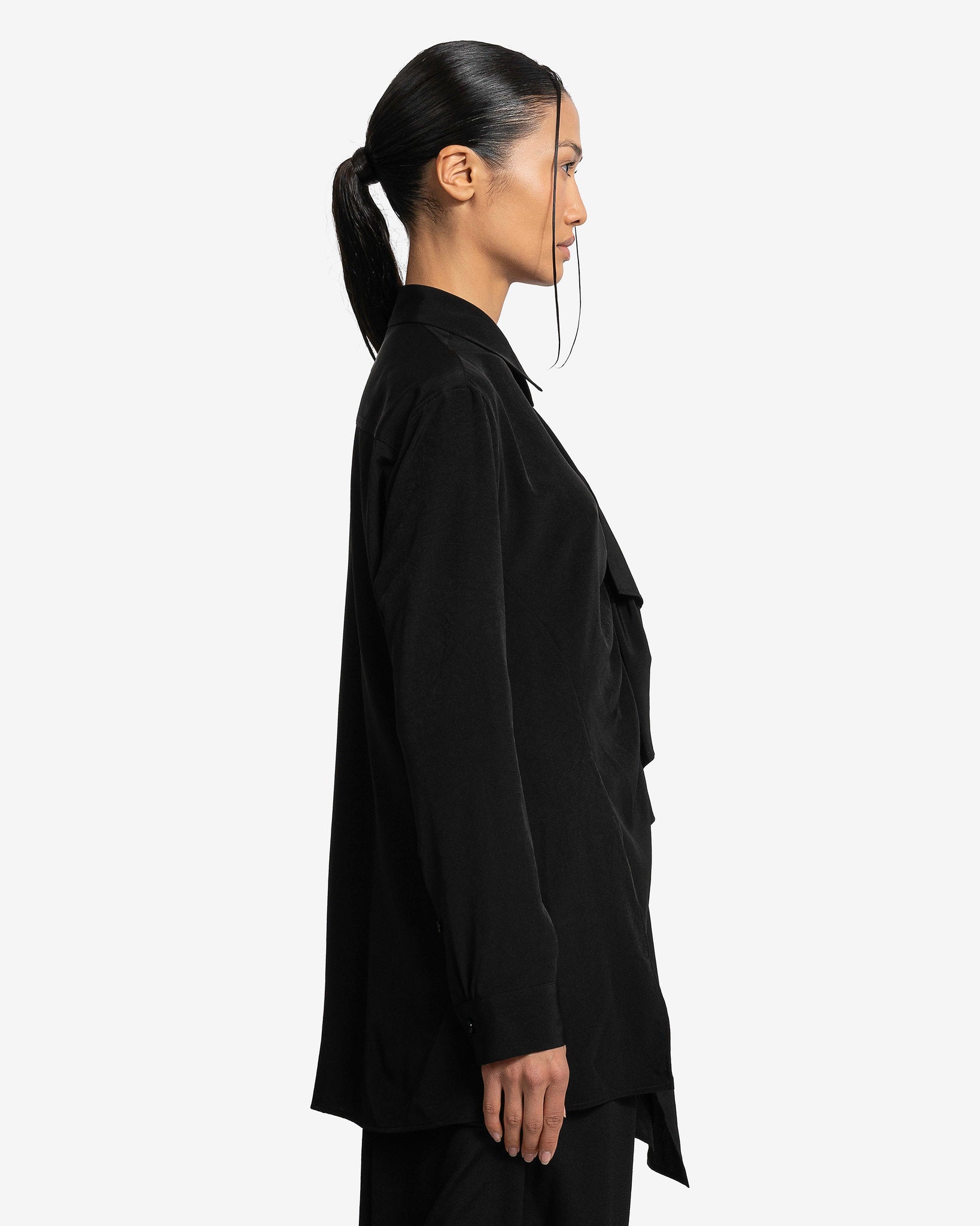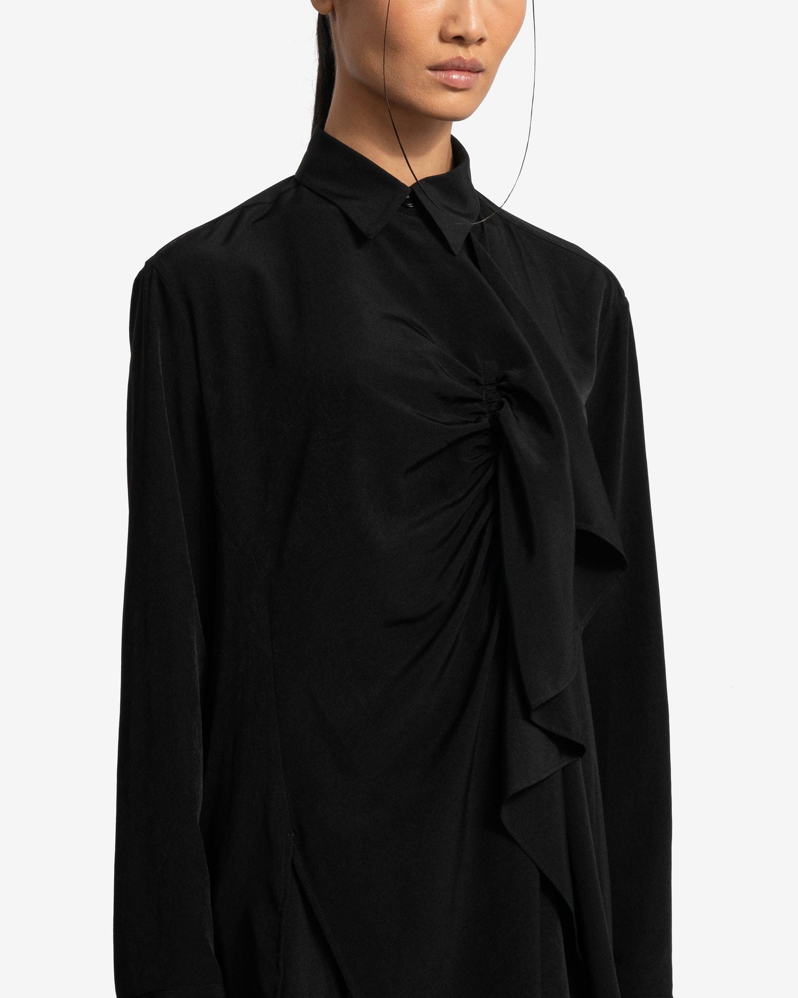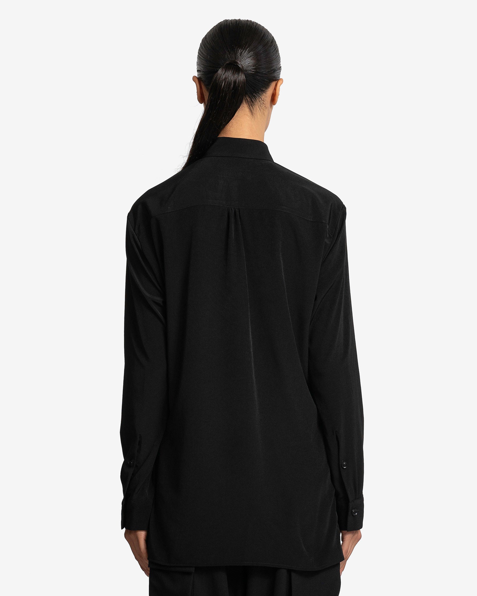 Y's by Yohji Yamamoto women's gathered blouse in black. This top features a classic collar and gathered details along the front, vents at the hem and pleats at the back.
