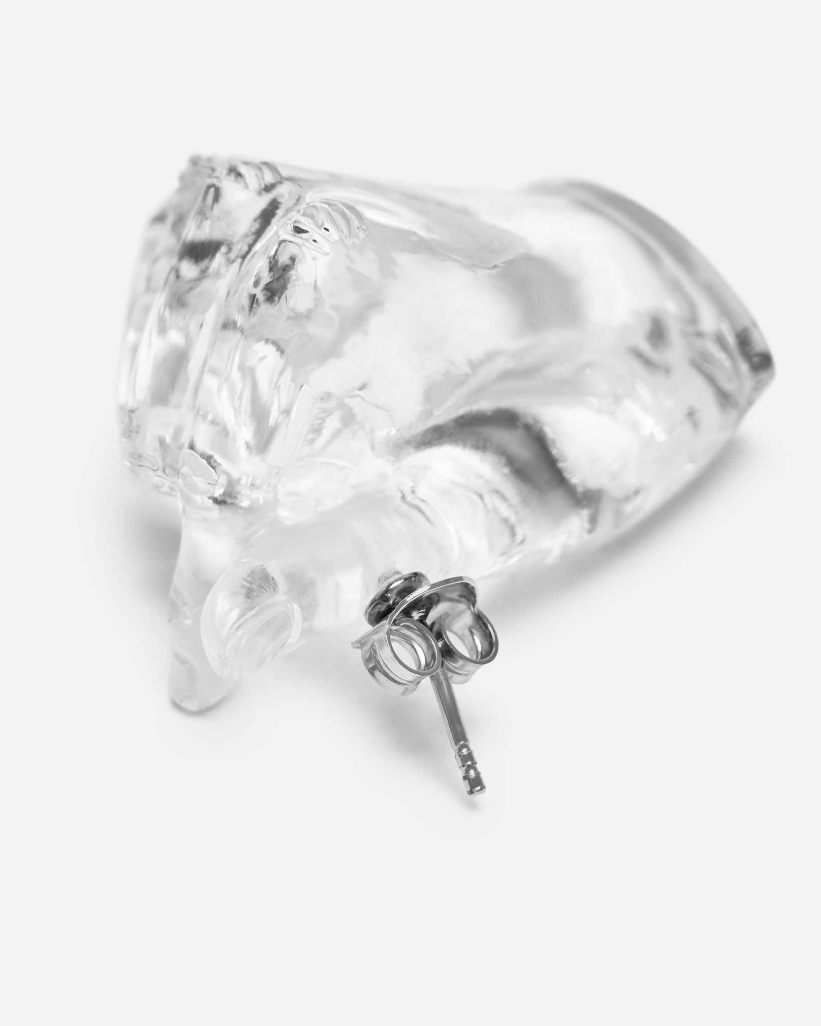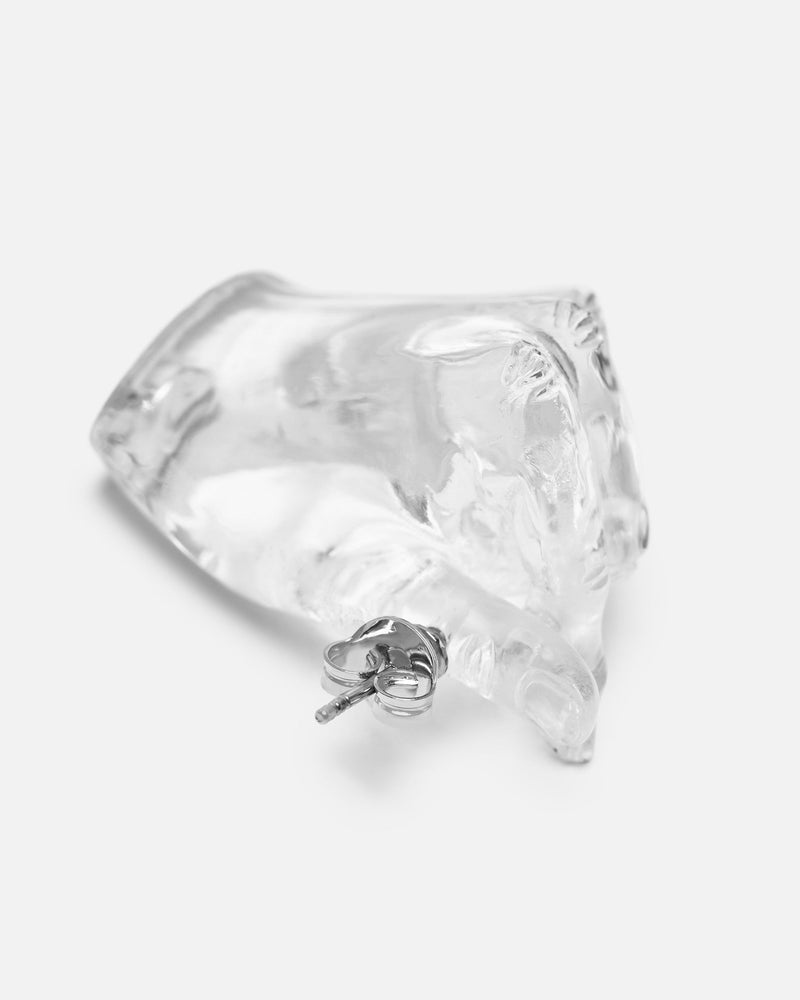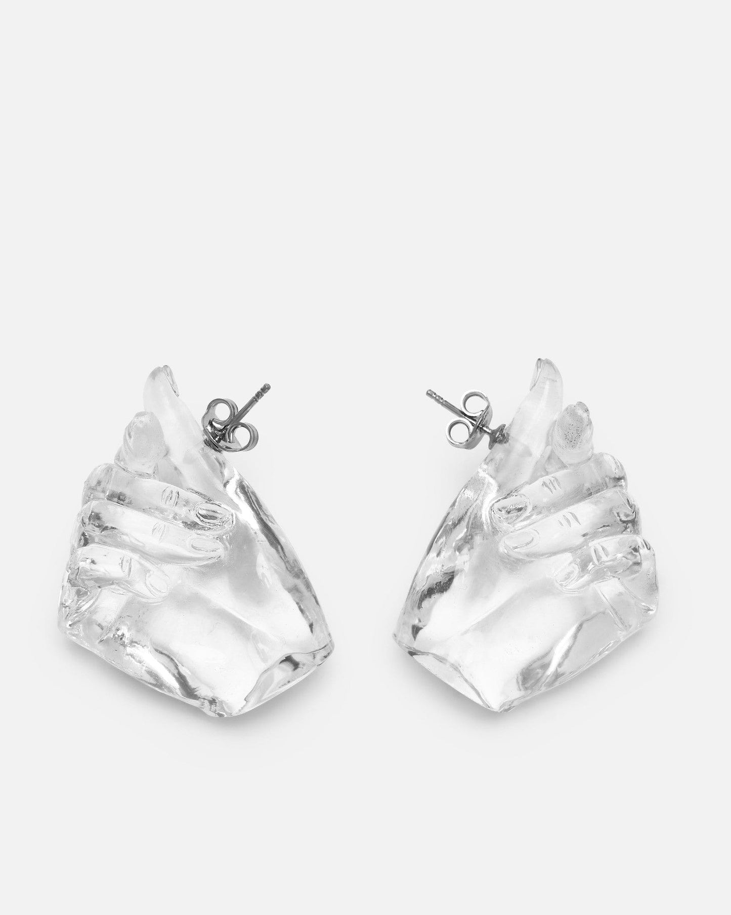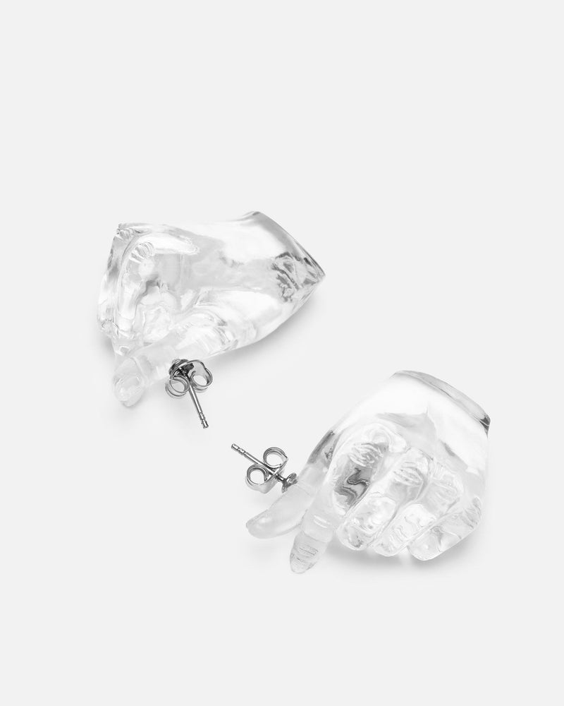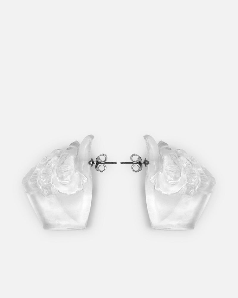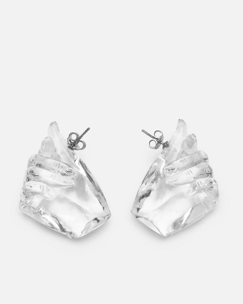 Y/Project Midi Finger Heart Pendant Earring in Transparent. These resin drop earrings feature a sculpture of identical hand gestures with post-stud fastening.