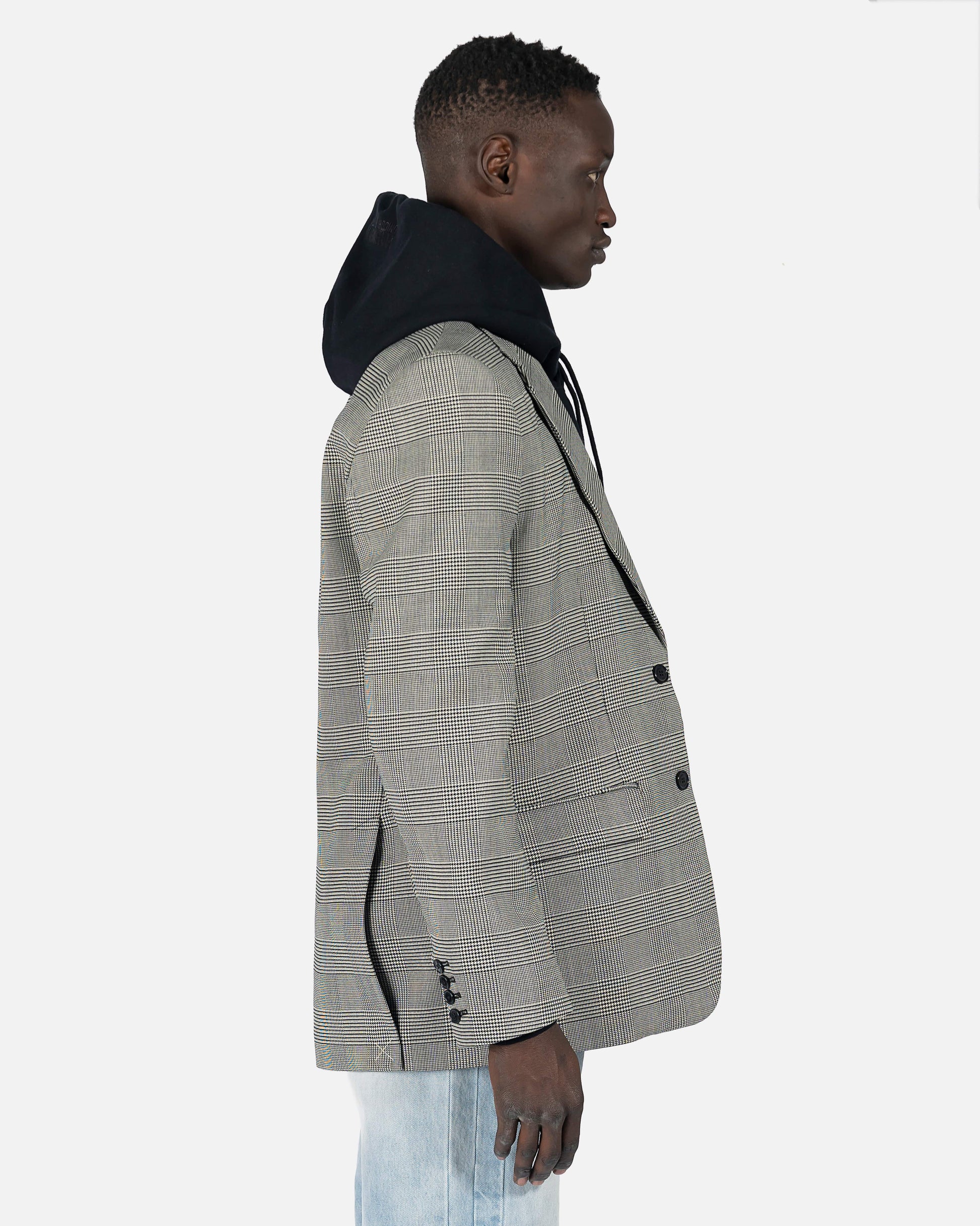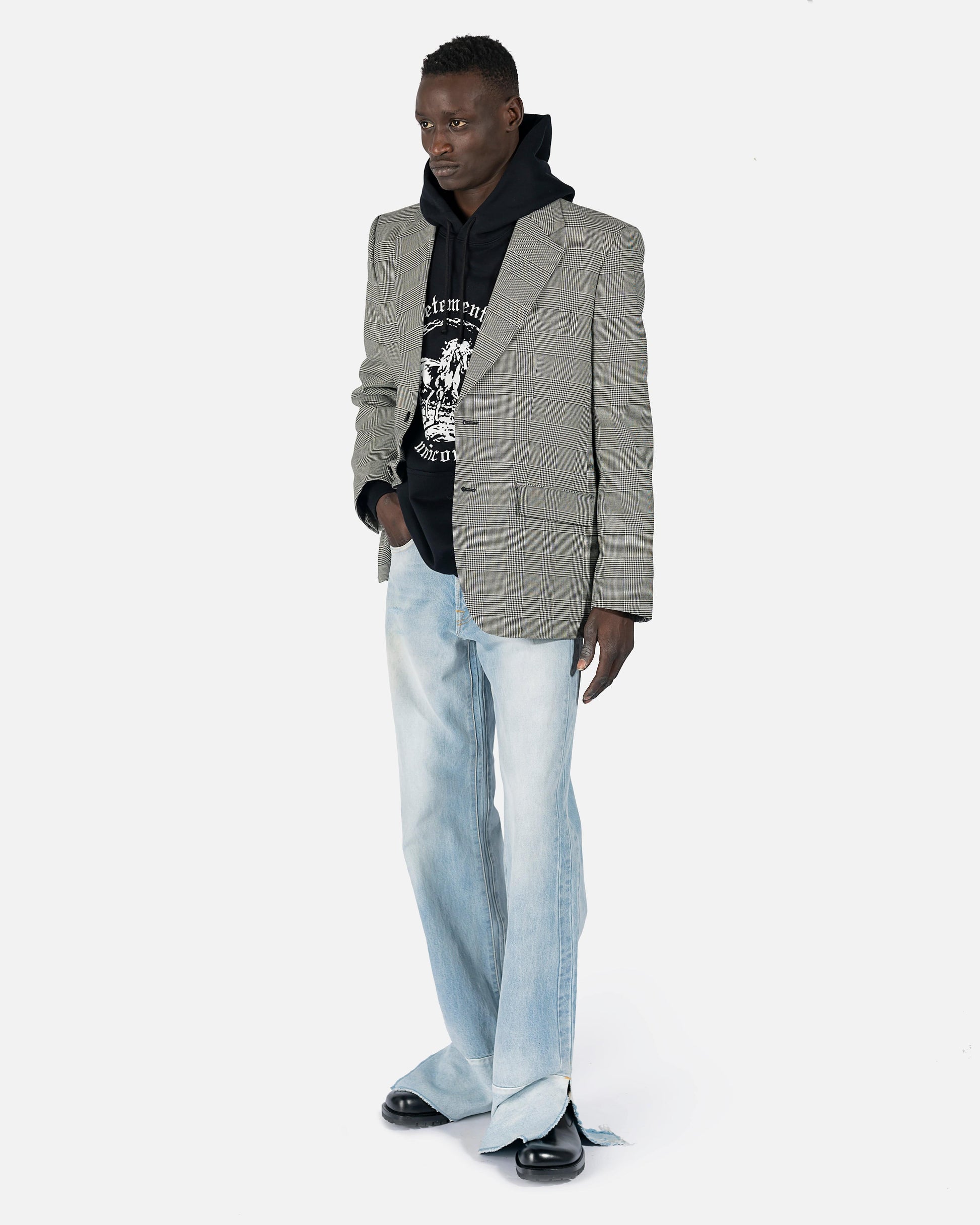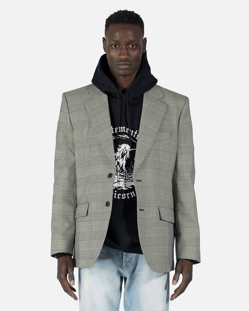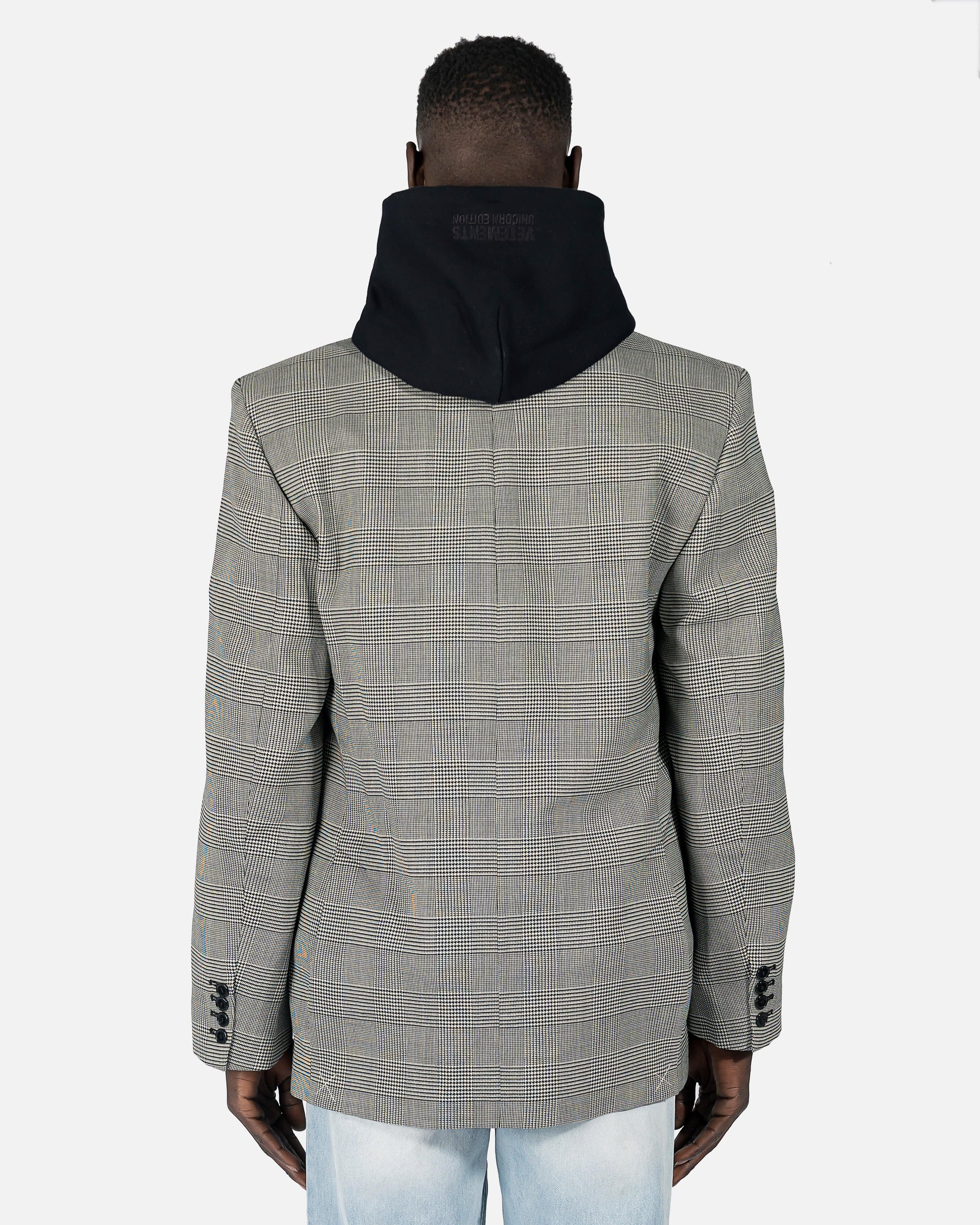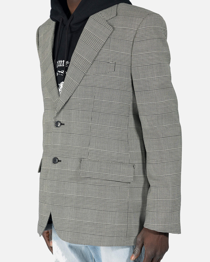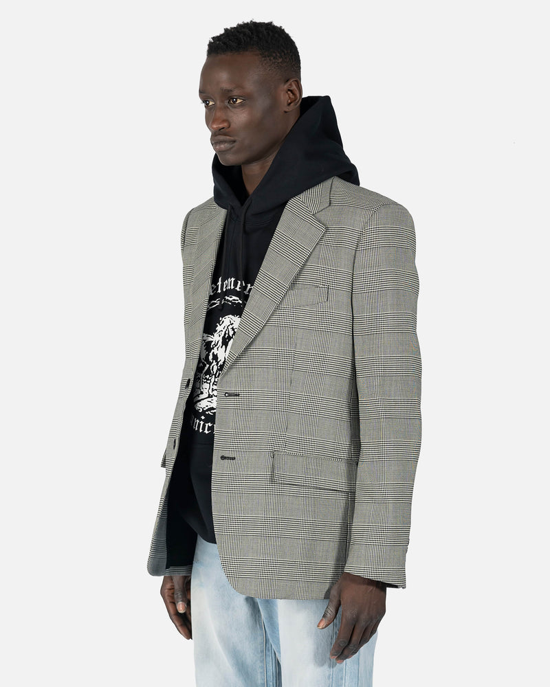 VETEMENTS men's wool blend blazer jacket in a grey check print. This jacket features a notched lapel collar with two button closure at the front. There is a welt pocket on the left chest and two flap pockets at the waist. The back hem has twin vents and the entire jacket is lined in satin. There is a black logo label underneath the back collar, reading "VETEMENTS".