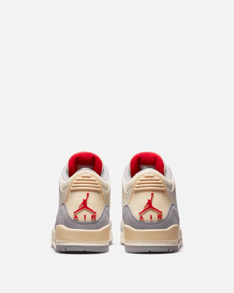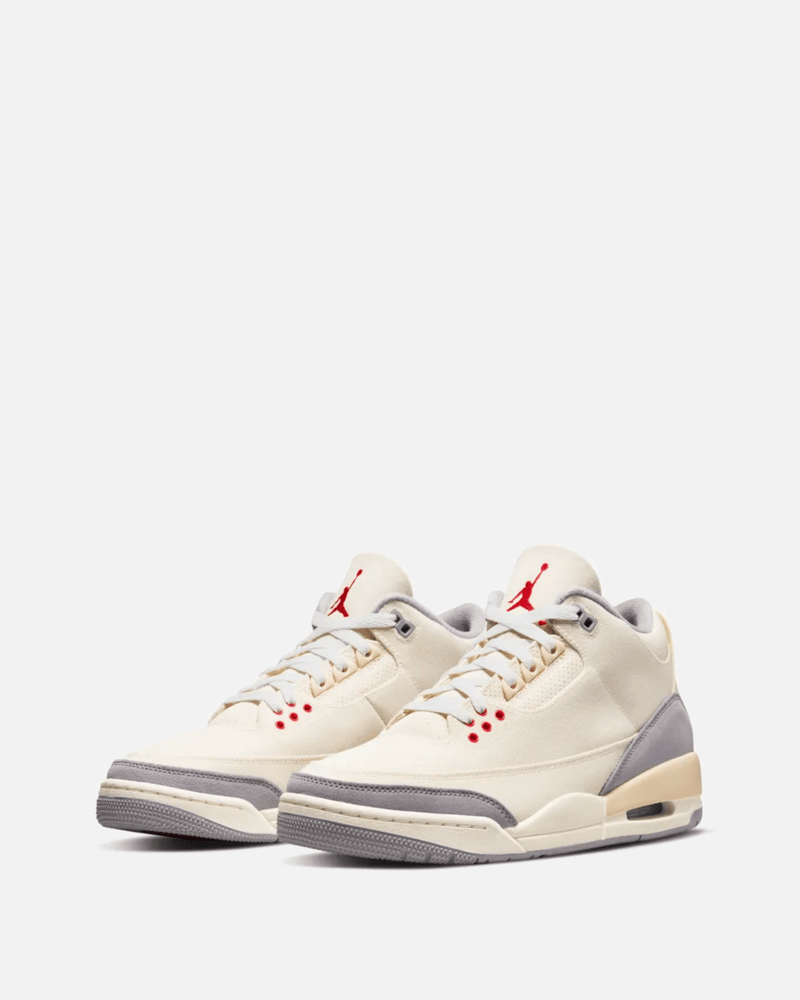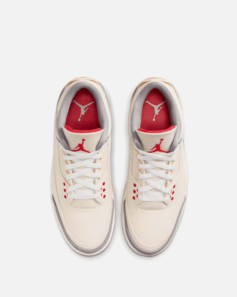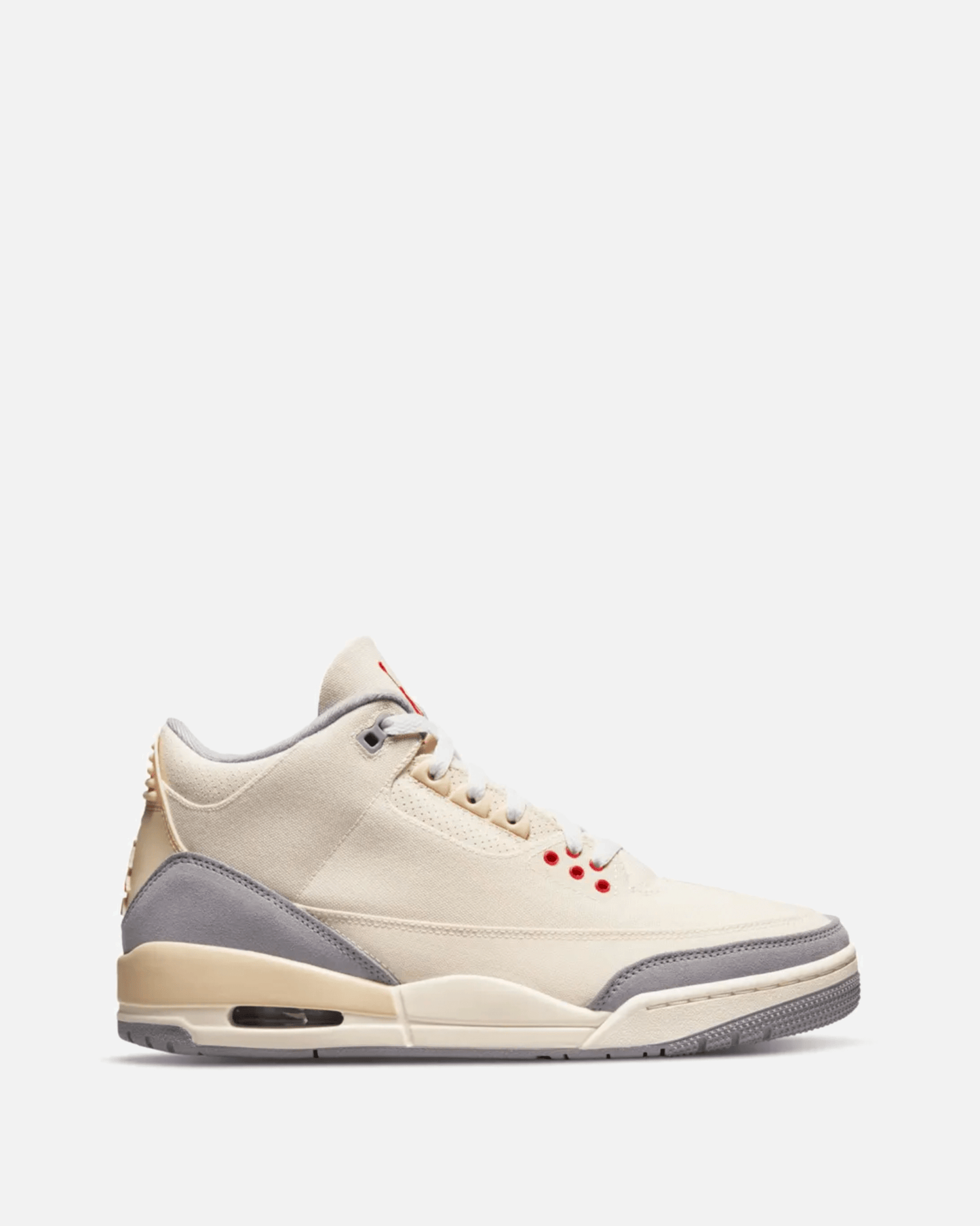 Throughout MJ's dynasty run, fans and teammates counted on his durability. His six championships, delivered in heroic fashion, were epitomised by toughness, strength and physical fortitude. Bringing that same attitude to a beloved retro, the Air Jordan 3 "Muslin" uses a heavy-duty canvas upper and strong Cement Grey suede to welcome everyday challenges with rugged style. Its Sail midsole finishes the vintage-inspired makeup, while University Red accents shout-out Air Jordan heritage.