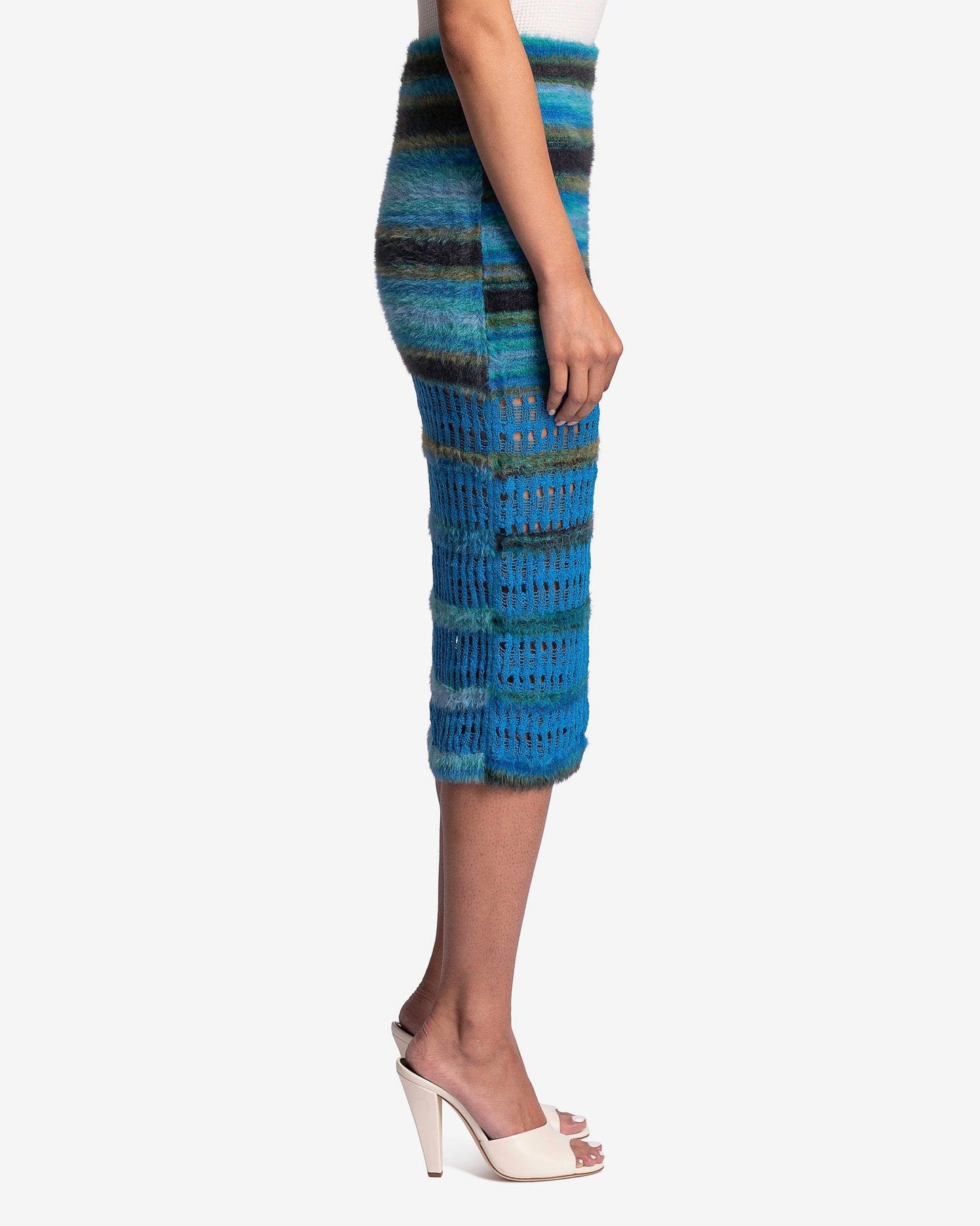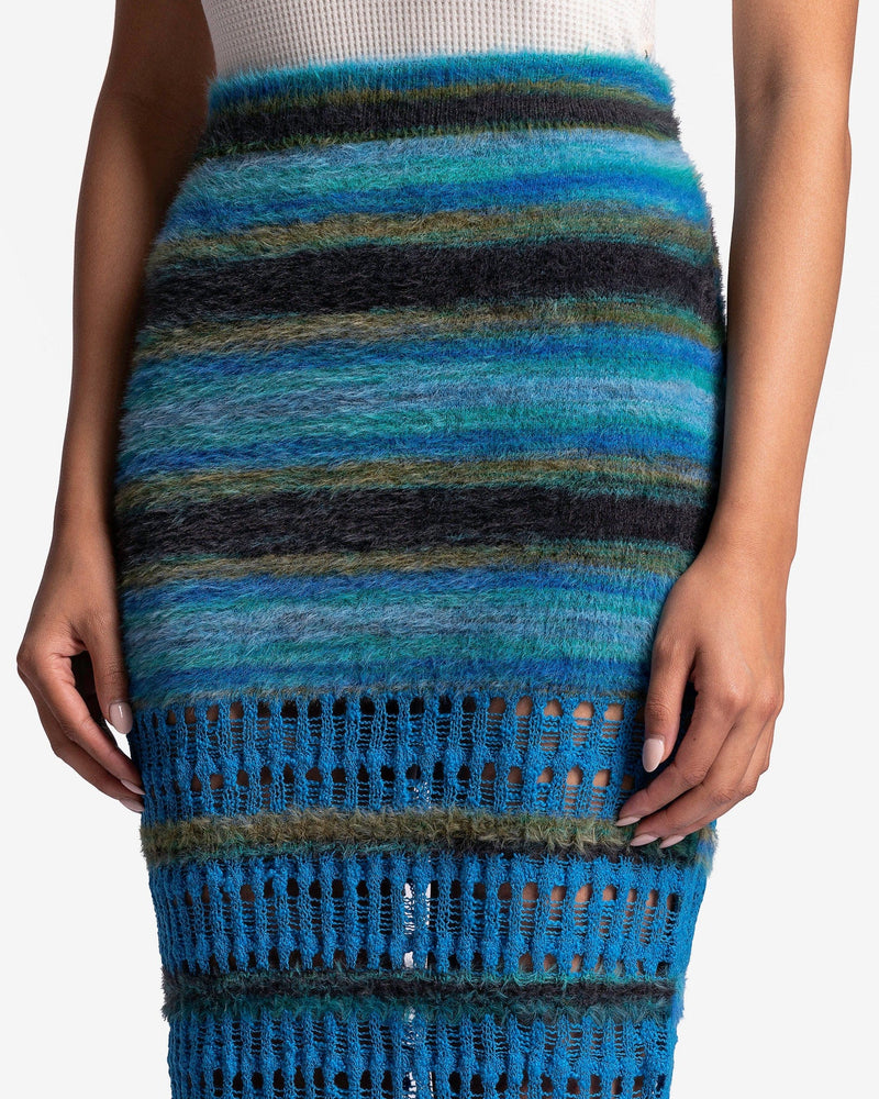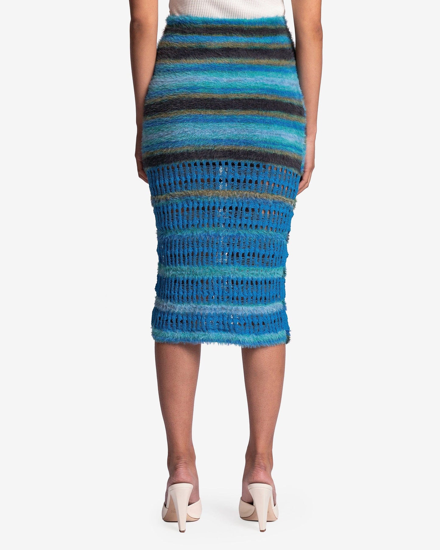 Andersson Bell women's striped knit skirt in blue. This skirt features a paneled design. The top half is a fuzzy striped pattern and the bottom half is a knitted cotton pattern.