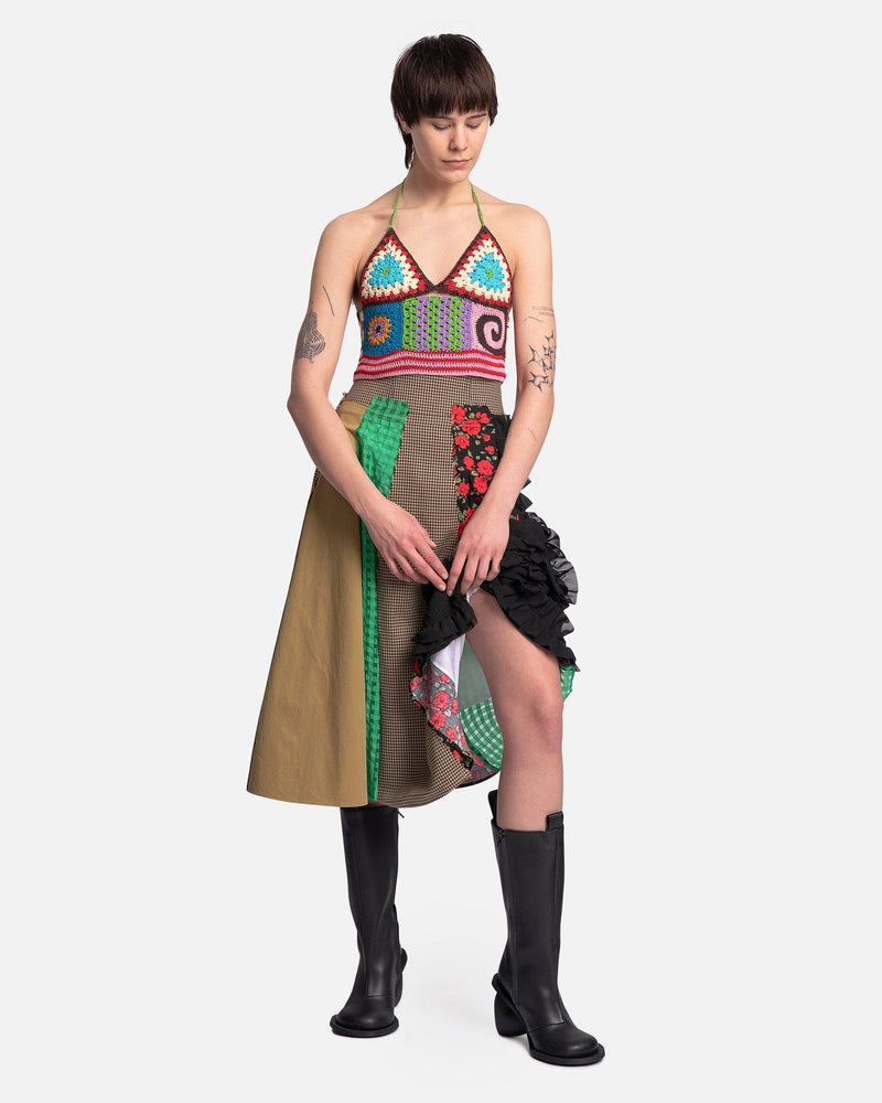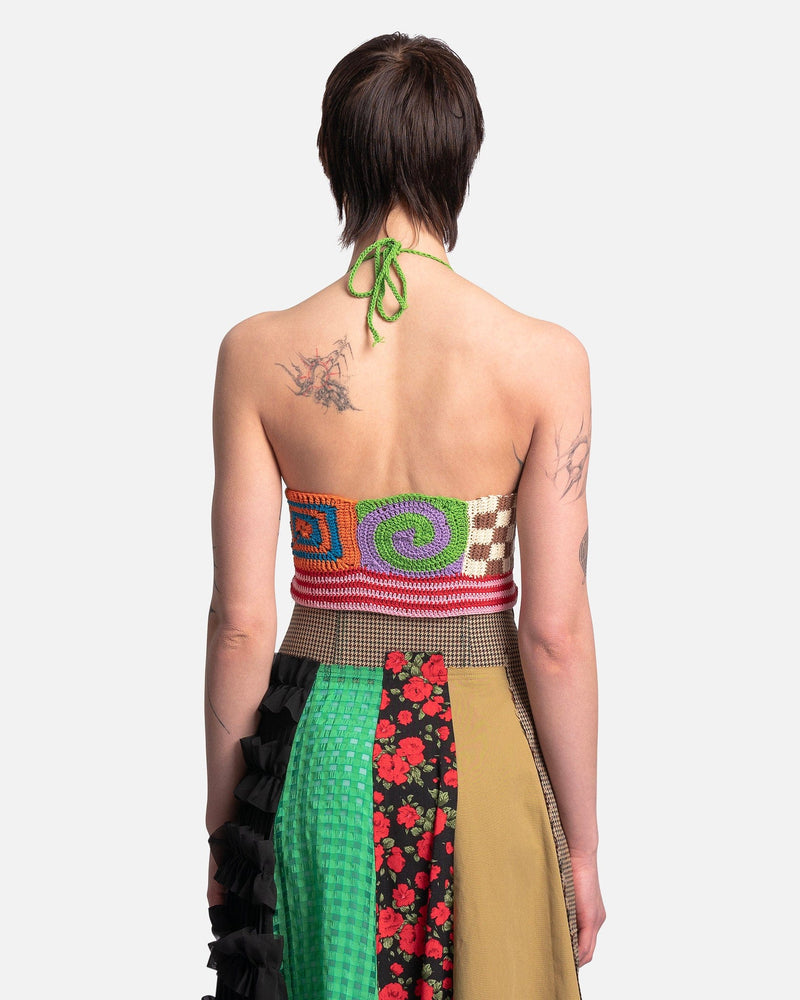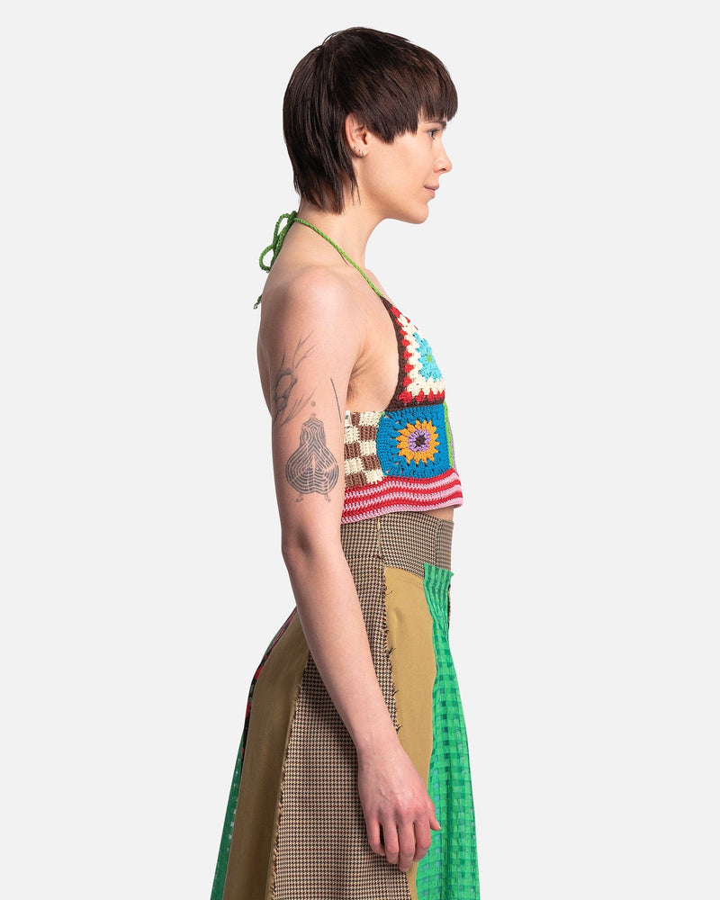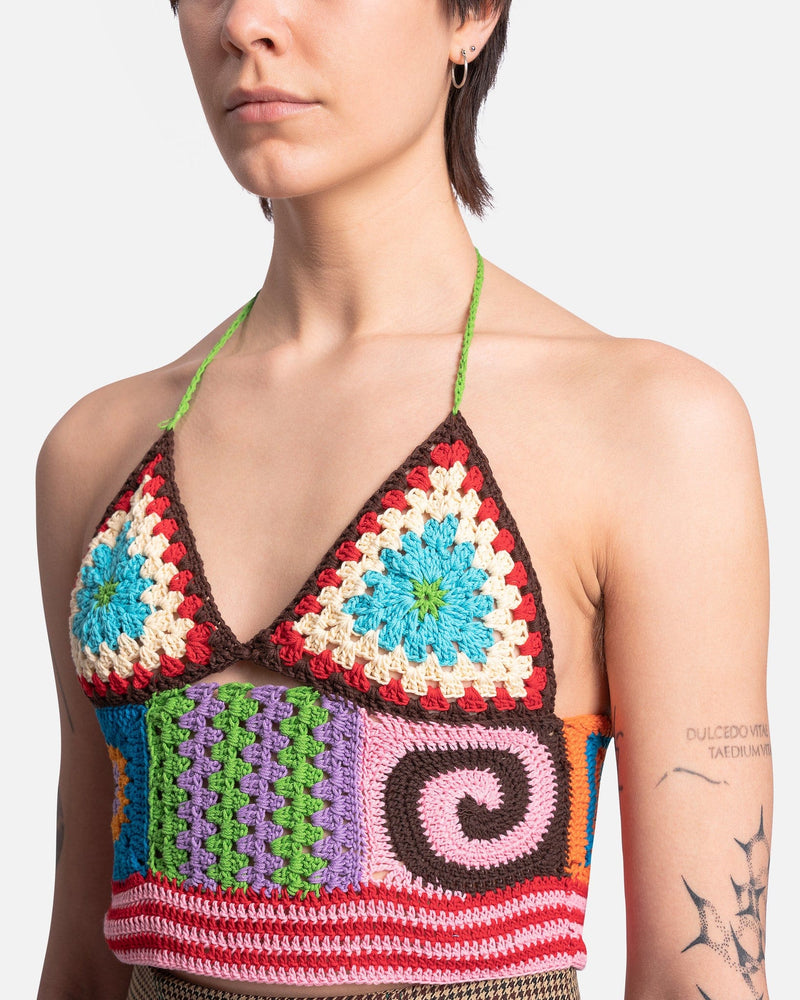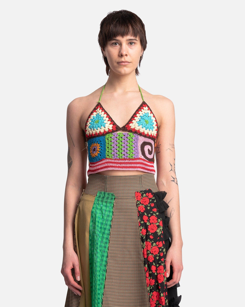Andersson Bell women's crochet crop top in multicolor. This crop top features a paneled crochet silhouette with a halter strap closure at the neck.
