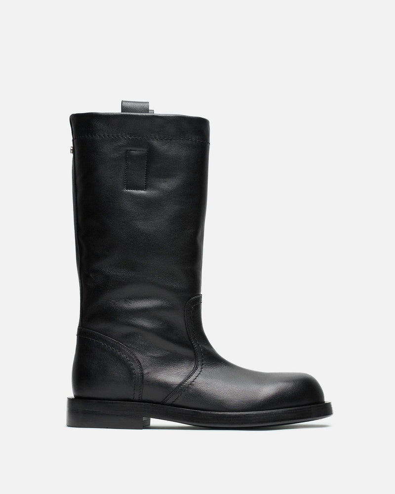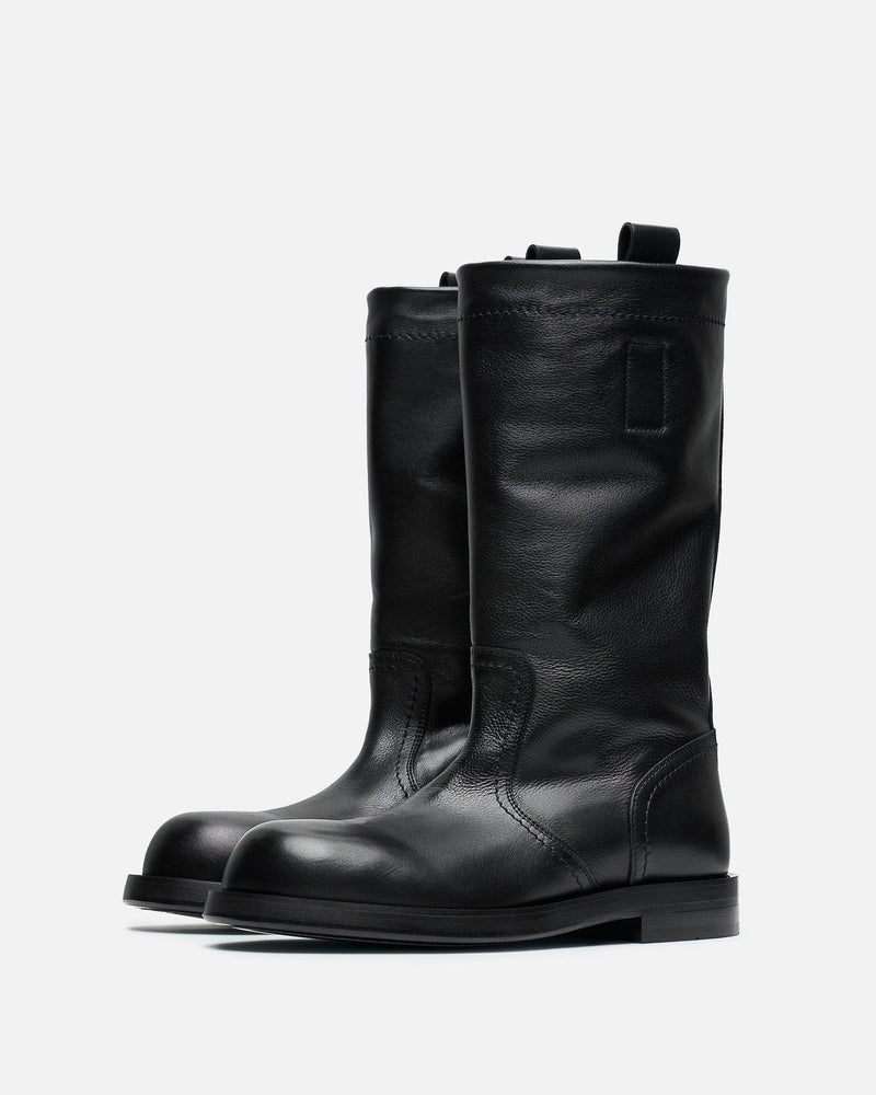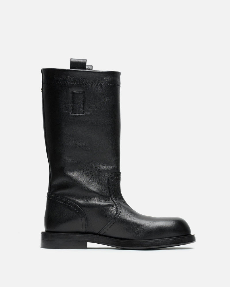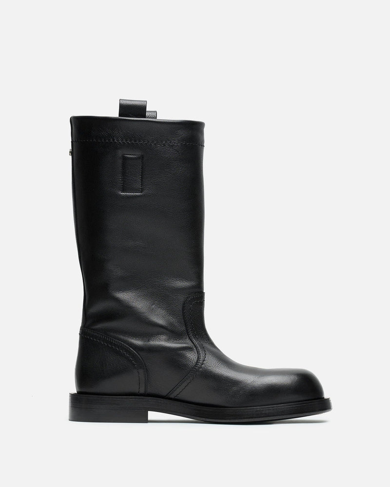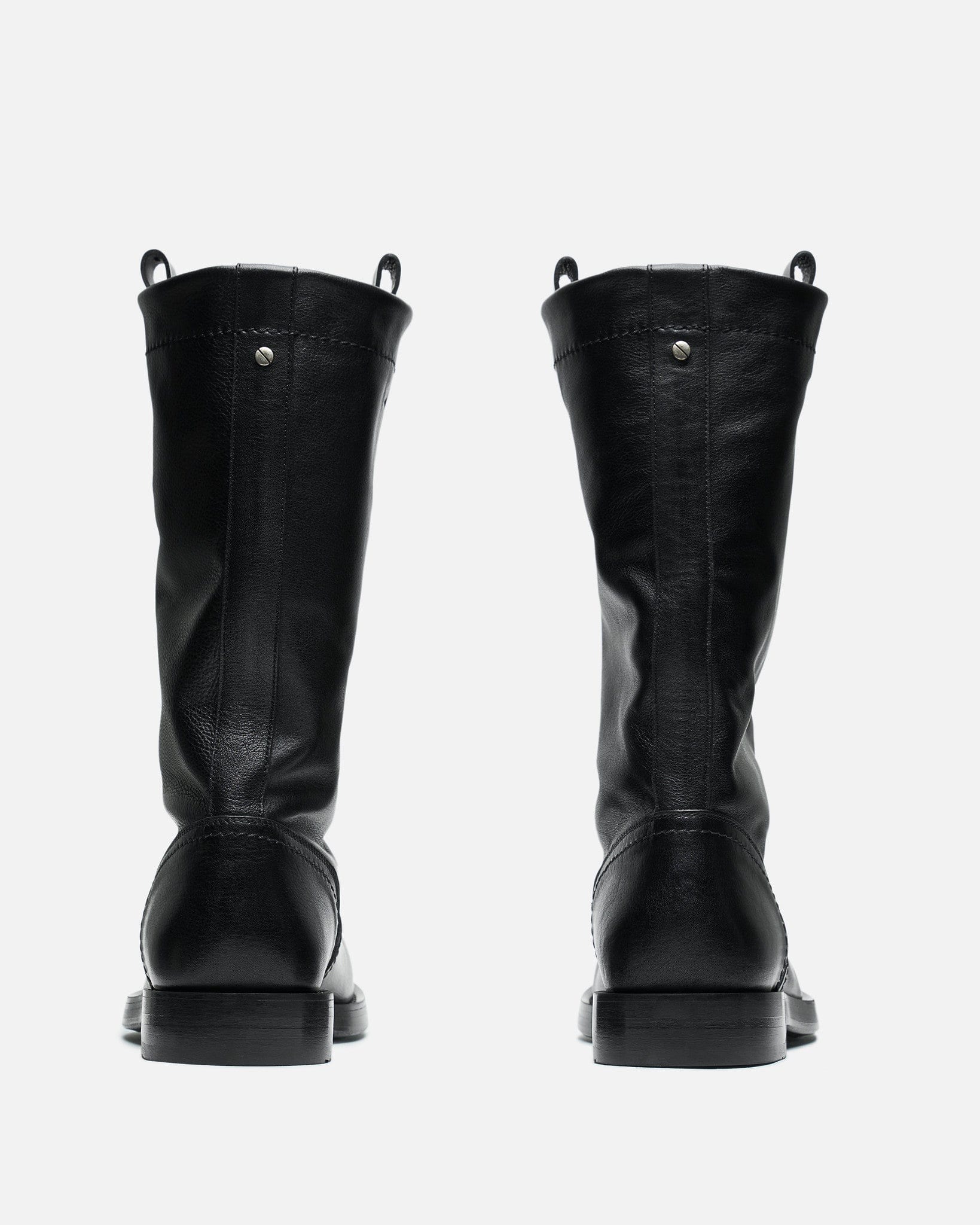 Ann Demeulemeester Bente Boots in Black. These boots are crafted from grained leather and feature pull loops at the collar, rivet detail and the back collar and a stacked leather block heel with rubber injection.